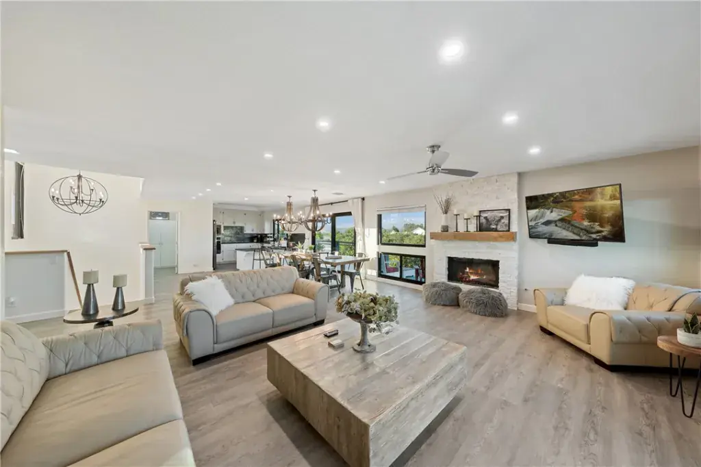 The home features three generously sized bedrooms, three bathrooms, and approximately 2,182 square feet of thoughtfully updated living space. Recent renovations include a new roof, fresh exterior paint, new interior windows and sliding glass doors, updated laminate flooring throughout, a solar energy system, and a newer septic system. Central air conditioning, along with a newly installed upstairs split system, provides year-round comfort.