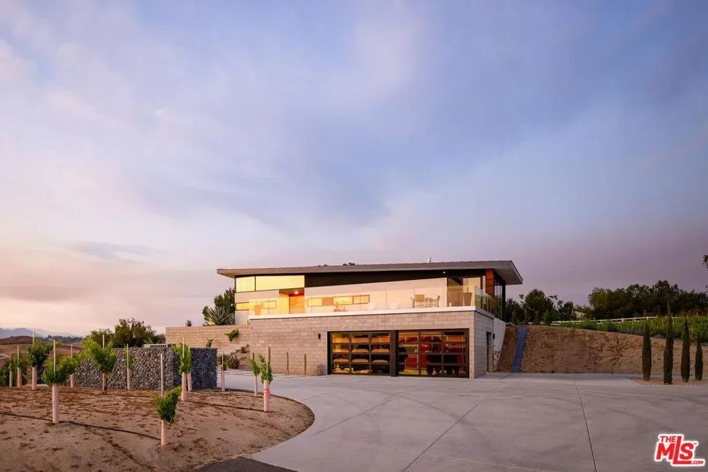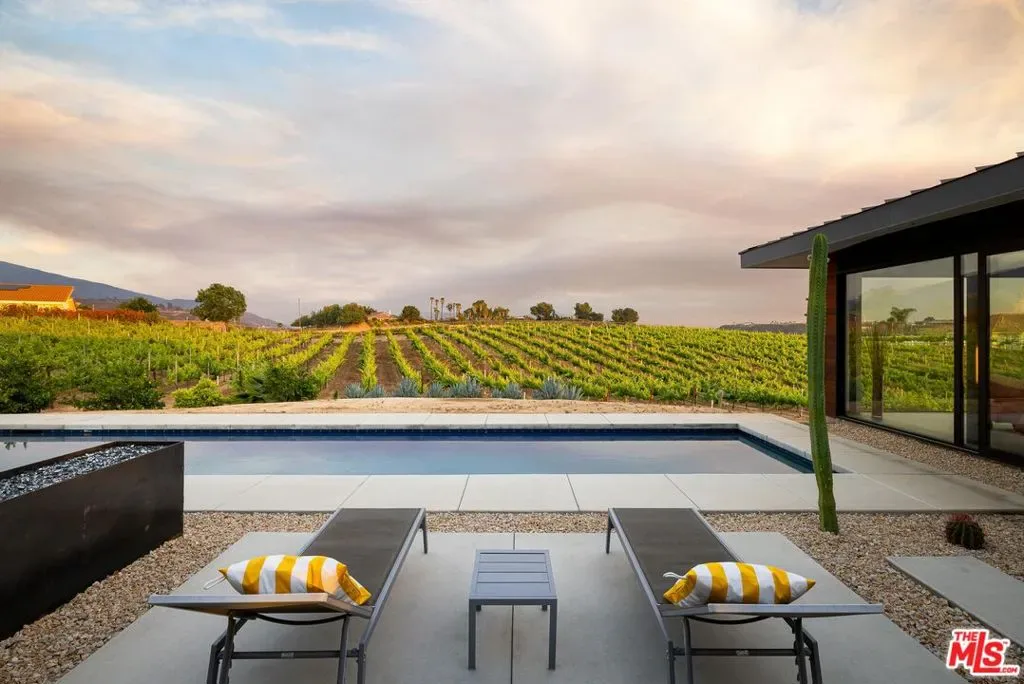 An incredible modern architectural home with income producing vineyard, in the heart of Temecula Wine Country. The Kite House, designed by Southern California-based architecture firm, Architects Magnus, was built using fire resistant hybrid construction methods with a high strength steel frame, and sustainability in mind with a standing seam metal roof under a 10kw solar system. All of the interior fixtures and appliances are premium quality and mostly imported; from the commercial grade aluminum door frames with solid core door panels, skylights, Duravit bathroom cabinets, and ORTAL tunnel fireplace (all imported from Germany), the faucet hardware is Hans Grohe, and the kitchen is all Miele (combo / steam oven, built-in coffee machine, fridge, dishwater and induction cooktop). The kitchen countertops are custom no-seam Silestone, made in Italy. The hydronic a/c system is custom made from the Italian company, Messana. Throughout the home you find Lutron lighting, and each bedroom has a commercial grade lift & slide door and window system from Reynaers, designed in Belgium. Head outside to the Pentair mineral pool and jacuzzi with propane and electric heater, and low voltage landscape lighting on photocell. Everything from the coffee machine, a/c system, lighting and pool systems can all be controlled via an app. And then of course you are surrounded by your own vineyard, ‘Moto Vino’ (valued as a $600k+ business, conveying with the sale of the home) that was developed by Drake Enterprises of Temecula, utilizing efficient machine harvesting and is fully OSHA compliant with service roads, filter station and drip irrigation (3.3 acres of Syrah, and 0.5 acres of Grenache Blanc vineyard that generates $40-$50k in revenue/year for another projected 20+ years). This is an incredibly unique offering of Southern California modern architecture meets vineyard that was planned and developed in-tandem to maximize the 4.88 acre properties view orientation, grape yields and functionality.