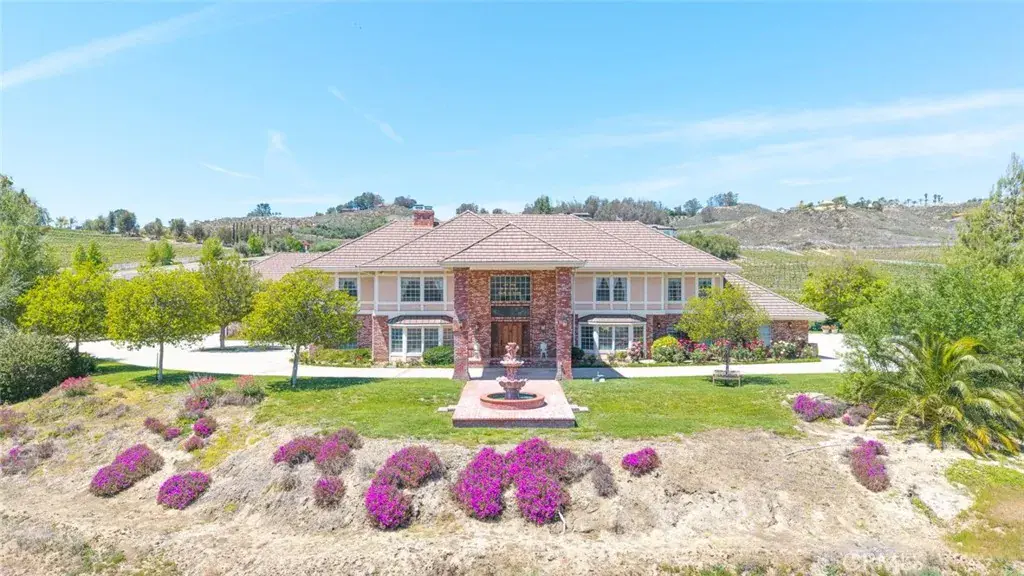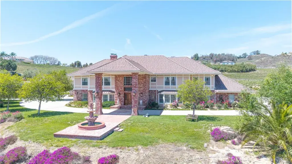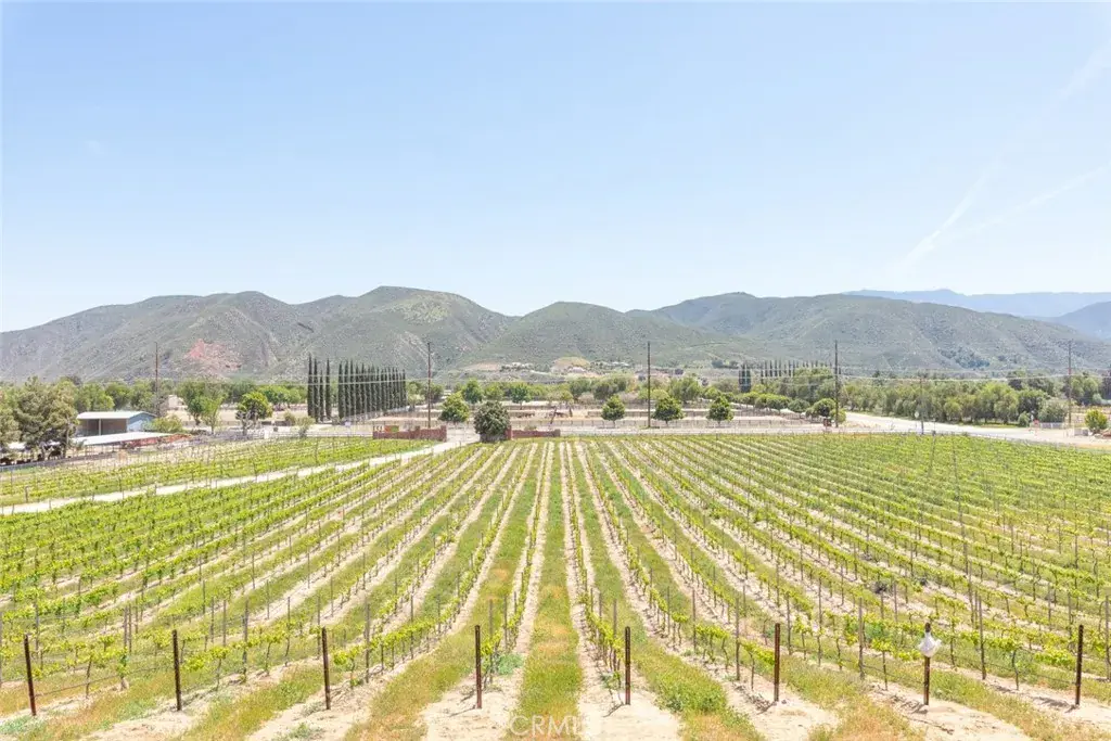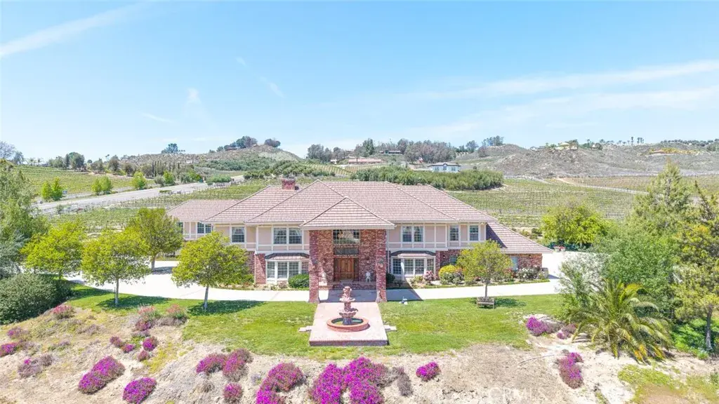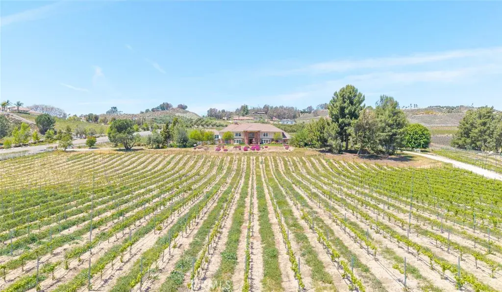 Nestled in the heart of Temecula’s prestigious Wine Country, this extraordinary vineyard estate is a celebration of refined living, panoramic beauty, and the art of winemaking. Set high on the hilltop, this residence overlooks your very own working vineyard, flourishing with Cabernet, Syrah, Merlot, Muscat, Petite Syrah, and Primitivo varietals—an exceptional opportunity to embrace the vintner lifestyle. Step through a grand single entry into a world of timeless elegance. The dramatic foyer welcomes you with two breathtaking chandeliers, a gracefully curved staircase, and vaulted ceilings adorned with rich wood beams, all bathed in natural light. Thoughtfully designed for both comfort and sophistication, the home features a chef’s dream kitchen—ideal for gatherings both intimate and grand—alongside an expansive bar and open-concept living spaces that flow effortlessly throughout. A beautifully customized library/office on the main floor offers a quiet retreat, complete with rich wood shelving and fine craftsmanship. The layout includes a spacious downstairs bedroom with a full bathroom, perfect for guests or multi-generational living, along with an elegant powder room for visitors. Upstairs, a square catwalk offers sweeping views into the magnificent great room below and leads to four generously sized bedrooms, each filled with natural light and designed for comfort. The primary suite is a true sanctuary—boasting serene views of the vineyard, a cozy sitting retreat with fireplace, and a spa-like ensuite bath. Enjoy a luxurious soaking tub, walk-in shower, dual vanities, and a large walk-in closet, all creating the ultimate place to unwind. A secondary dwelling above the detached garage currently serves as a private winemaking room, but offers endless potential as a guest suite or creative space. Every detail of this home exudes luxury, privacy, and lifestyle. Whether you envision a boutique wine label, a family estate, or an entertainer’s dream, 37028 De Portola Road delivers the very best of Temecula Wine Country living.