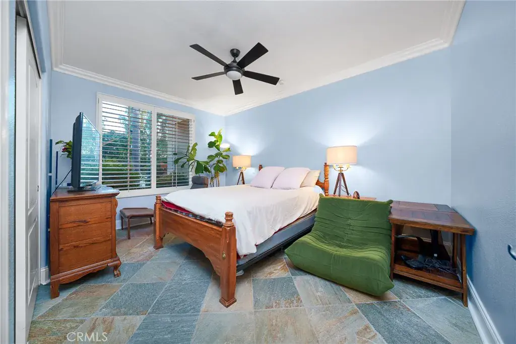 Turn right, you will see yourself in this floor to ceiling classic framed mirror. Now enter your sanctuary, the cozy and private quarters. Each bedroom, true as the rest of the home, presents new crown molds, baseboards and new floors. On this side, you have master suites and three additional bedrooms, all with plantation shutters. The master suite features a separate patio entrance, an expansive walk-in closet, and a spa-inspired ensuite bath with a glass-enclosed shower and an elevated soaking tub.