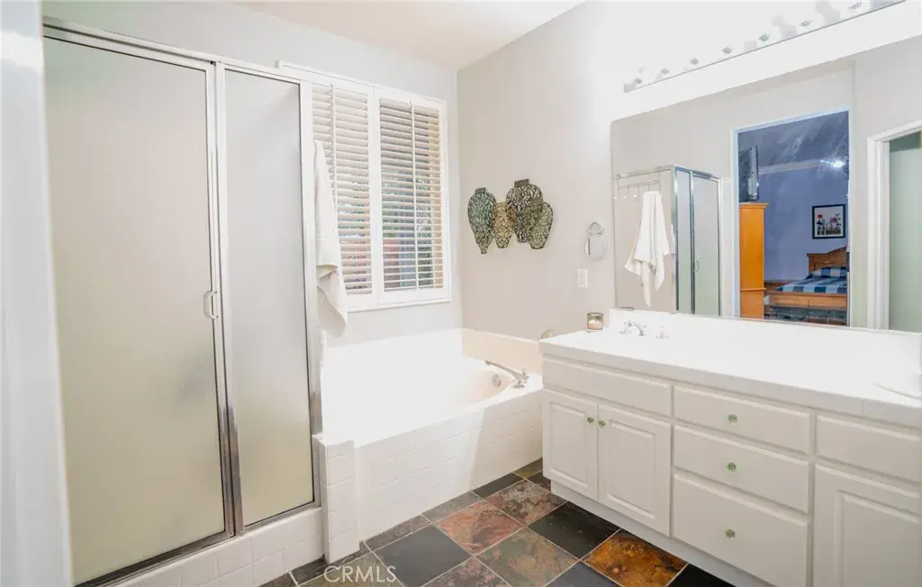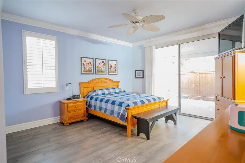 The master suite features a spacious walk-in closet, dual vanities, a relaxing soaking tub, and a separate walk-in shower for added convenience. Other notable features include a dedicated laundry room with direct access to the garage, a covered patio perfect for outdoor entertaining and shade, drought tolerant landscaping, crown molding, 8-inch base molding, and a whole-house fan that helps keep the home cool and comfortable.