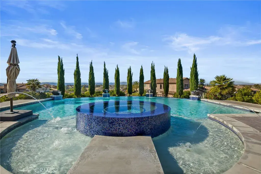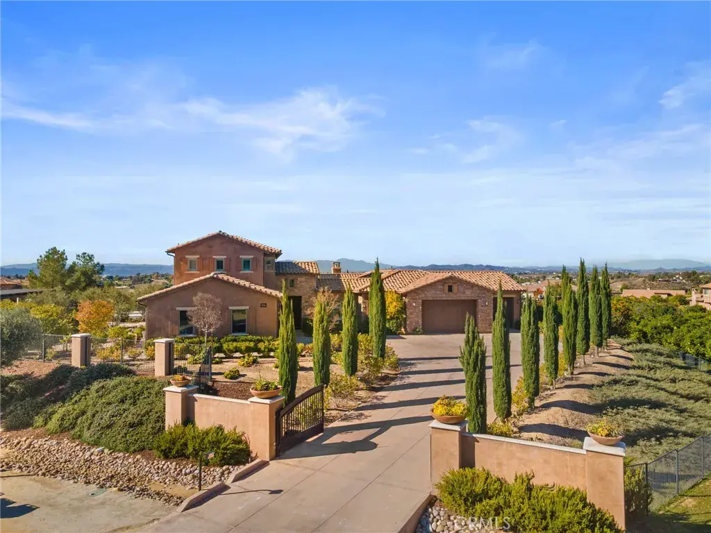 Set behind the prestigious gates of The Groves, this breathtaking 6-bedroom, 6.5-bath Tuscan-style estate embodies the perfect blend of timeless European elegance and modern Wine Country living. Located in the heart of Temecula Wine Country and surrounded by an active, certified organic citrus orchard, the 2.12 acre property offers uninterrupted vistas of rolling groves, vineyards, and glowing sunsets. Olive trees line the streets that lead to the residence, where rich architectural details and refined craftsmanship define every space. Inside, each bedroom enjoys the privacy of its own en suite bathroom, while the primary suite serves as a private retreat complete with a sitting area and a dedicated home gym. The gourmet kitchen features premium Viking appliances, complemented by a wine cellar, formal dining room, and multiple indoor/outdoor living areas ideal for entertaining. An airy atrium brings soft natural light into the home’s core, enhancing its warm, inviting ambiance. Luxury and convenience come standard with paid solar, a whole-home generator, solar pool heater, water softener, reverse-osmosis drinking system, under-counter ice maker, under-counter freezer, custom shutters/blinds, and ceiling fans throughout. The resort-style backyard showcases a sparkling pool and spa, framed by panoramic views of citrus orchards and stunning sunset views. A private casita provides flexible space for guests or multigenerational living. Car enthusiasts will appreciate the expansive 5-car garage, offering ample room for vehicles, storage, or a workshop. Blending Tuscan character with modern sophistication, this exceptional estate captures the essence of luxury Wine Country living within one of Temecula’s most coveted gated communities.