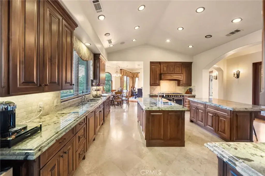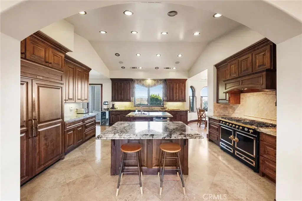 Inside, the attention to detail is unmatched. Vaulted wood-beamed ceilings, handcrafted brick archways, and intricate stonework create a sense of timeless permanence. The gourmet kitchen is a culinary showpiece, featuring dual center islands, a La Cornue range, built-in refrigerator, walk-in pantry, and an effortless flow into both casual and formal dining areas.