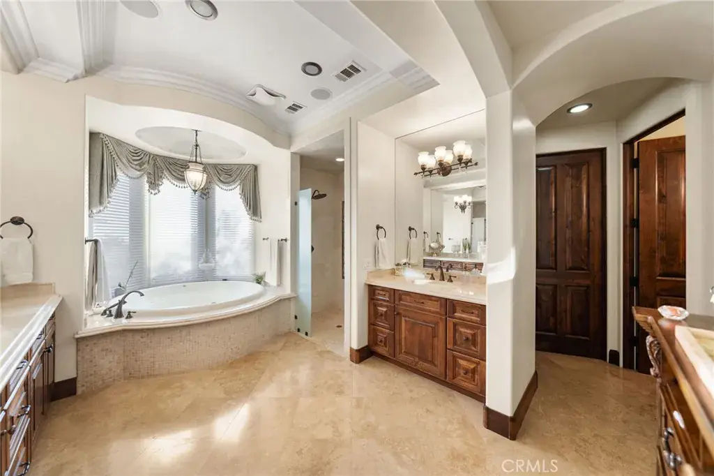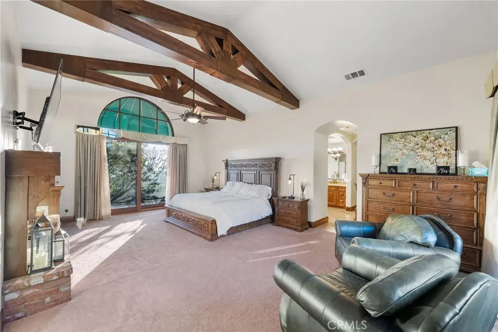 The primary suite serves as a tranquil retreat, complete with a cozy fireplace, spa-style bathroom, soaking tub, and views that stretch over the groves and valleys beyond.