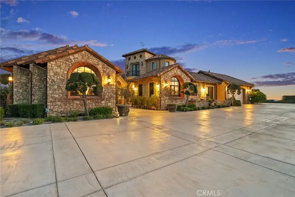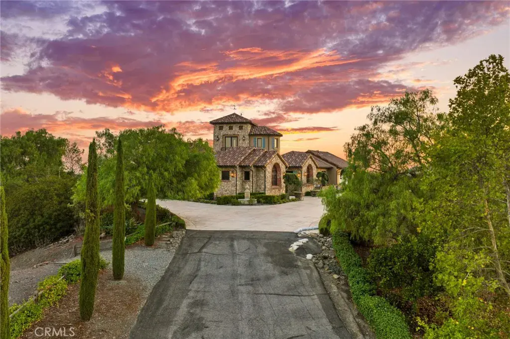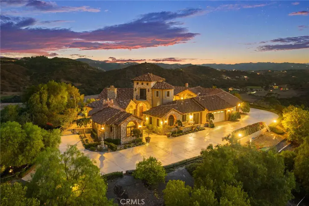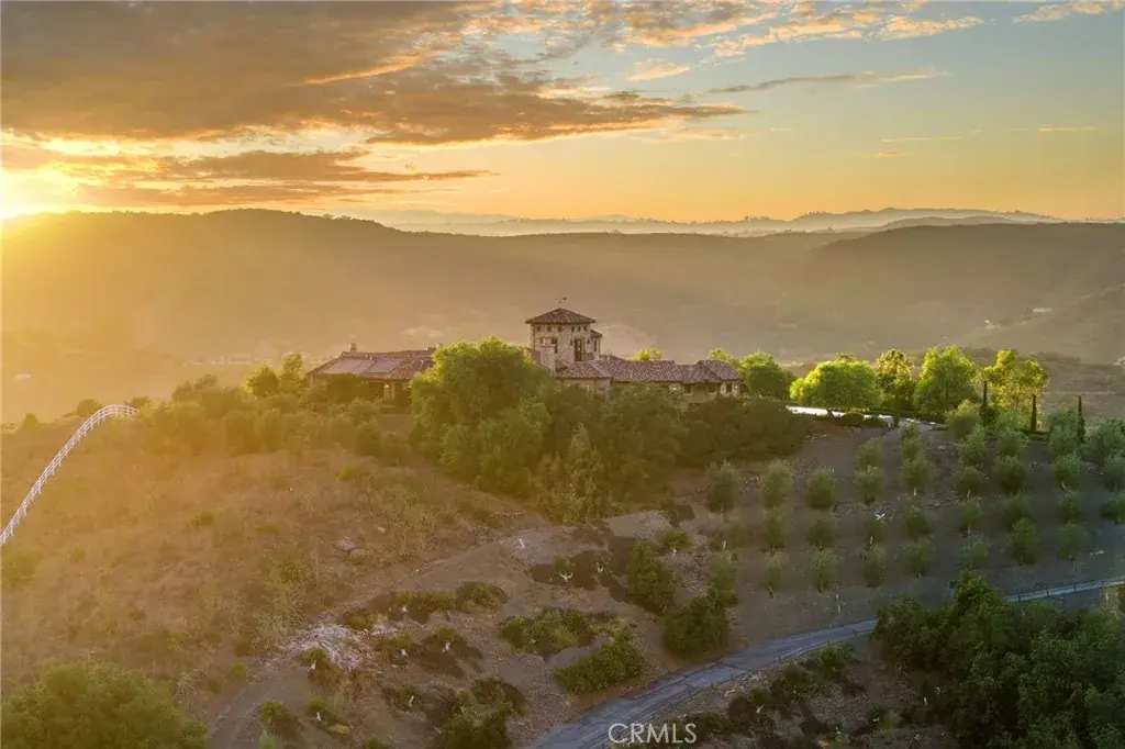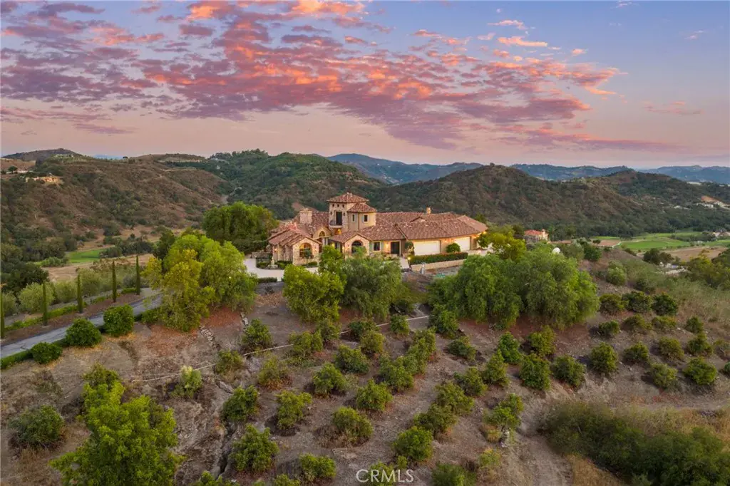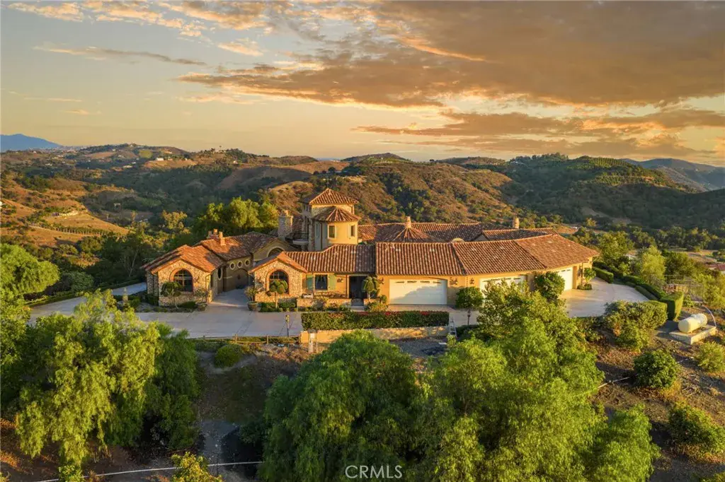 Welcome to Villa Girasole, a breathtaking Tuscan-inspired estate gracefully perched atop 15.6 acres in Temecula’s prestigious De Luz community. Evoking the romance of Italy’s hill towns, this architectural masterpiece blends old-world craftsmanship with modern luxury, surrounded by rolling vineyards, olive trees, fruit orchards, and hundreds of mature, producing avocado trees that blanket the hillsides in timeless beauty. Spanning approximately 6,588 square feet, this single-level residence was designed for both grand entertaining and intimate living. The thoughtfully curated floor plan features six bedrooms, seven bathrooms, a private executive office, a state-of-the-art home theater, and the signature Nexus tower. The tower boasts a stunning architectural focal point of the property, offering a curved staircase, arched windows, and panoramic balcony views of the Temecula Valley.