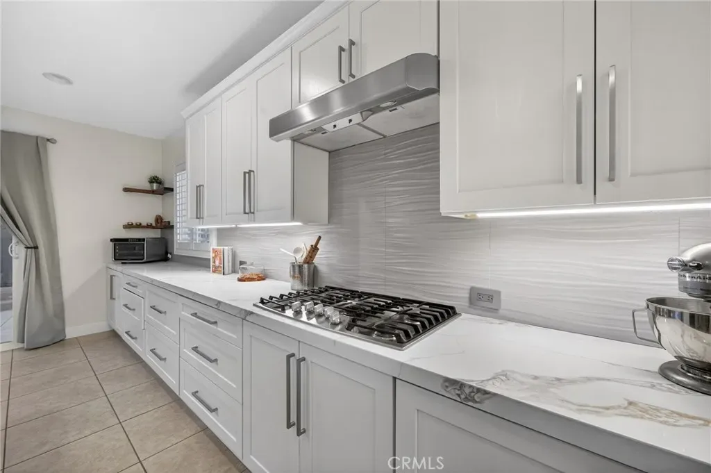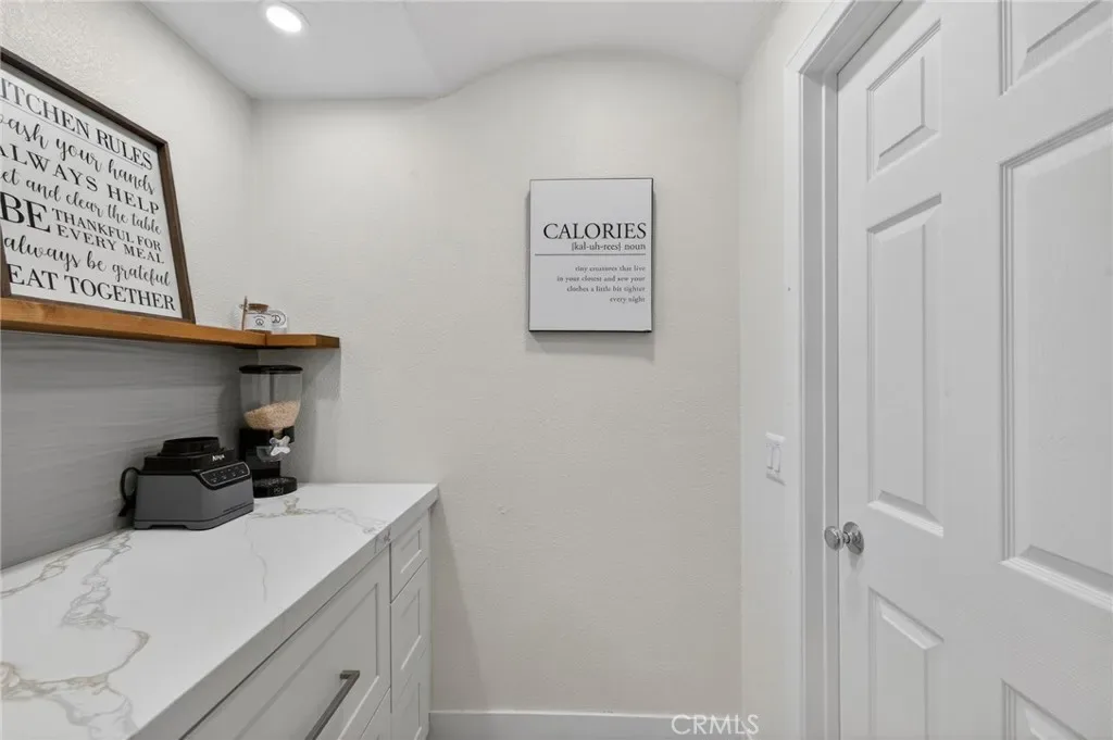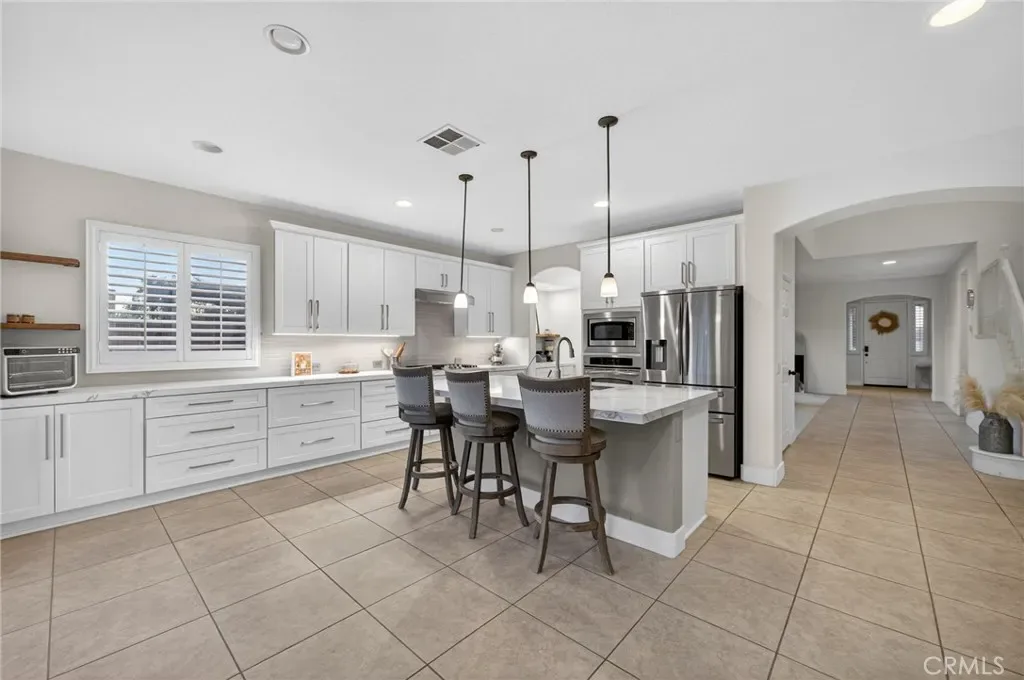 Step inside to an open, light-filled floor plan where the modern, upgraded kitchen serves as the heart of the home. Featuring white custom cabinetry, quartz countertops, a stunning backsplash, farmhouse sink, stainless steel appliances, and a large center island with bar seating, the space flows seamlessly into the dining and living areas while overlooking the backyard oasis. A walk-in pantry and built-in coffee bar/butler’s area add both style and practicality.