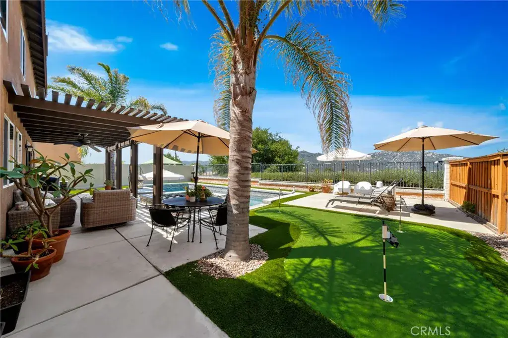 Welcome to this tranquil Temecula Retreat! Draped in style, charm, and comfort, this beautifully upgraded pool home is nestled in the Redhawk Community, one of Temecula’s most desirable communities. Featuring gorgeous vinyl flooring, neutral paint, and elegant white riser stairs, this home exudes warmth and modern sophistication throughout. Upstairs, you’ll find a huge bonus room perfect for a playroom, gym, media room, or home office, along with four spacious bedrooms, offering ample space for family and guests, including the Primary Retreat with it’s ensuite bath, spacious walk in closet and gorgeous views of hills, neighborhood and Pechanga Resort. The remodeled kitchen is an entertainer’s dream, stylish and functional with modern finishes, including a gorgeous center island that opens to the Great Room/living Room. The updated baths are equally impressive, designed with darling upgrades that add a touch of luxury and style to your daily routine. Outside you will find your own personal oasis, featuring a sparkling Pebble Tec pool and spa, covered patio, and even a putting green where you can practice your swing while enjoying panoramic views of the surrounding hills and neighborhood.