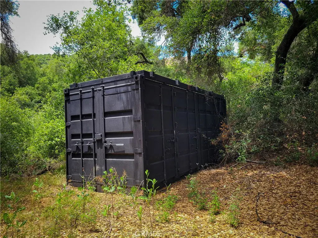 Key features include a 2-inch water meter, partial fencing, a storage container, and an area of majestic ancient oak trees. A seasonal stream meanders through the landscape, adding natural charm and tranquility to the setting.