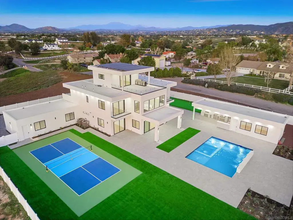 The most modern, sophisticated, and luxurious home in Temecula Wine Country. This opulent Ibiza-style villa was designed after the award-winning Villa Fabulosa—selected by Expedia and VRBO as the top vacation rentals in the U.S., out of 2 million properties. This offers proven prestige and a home you’ll be proud to own. The brand-new 5,000 SF home features 5 spacious bedrooms, 5.5 baths, a professional theater room, an expansive gourmet kitchen with a vast pantry, a magnificent walk-in closet, a 4-car garage with glass doors, two balconies, and two roof decks with breathtaking 360° views. Includes exquisite modern finishes, a soaring 22-ft family room with a dramatic fireplace, a 20-ft sliding glass door blending indoor/outdoor living, and the most gorgeous sunsets! Resort-style amenities include a pro-sized pickleball court, putting green, large pool & spa, sports area, and more—surrounded by over 55 world-class wineries. Includes a 750 SF outdoor kitchen with everything you can imagine. Plus a bonus room perfect for a game, exercise room, or private office. The 1,300 manufactured home includes 3 br, 2 ba, and about 30,000 sf of flat pad, which is perfect for a caretaker, a brand-new 2,500 SF home with a 360-degree view, or rental income. This home used to generate $3,500/month rent. At 4% cap rate, this asset alone adds over $1,050,000 in value. It also includes a large flat pad perfect for horse stables, tennis courts, a warehouse, or other custom features. At $5,395,000, this rare turnkey compound in the center of wine country won’t last!