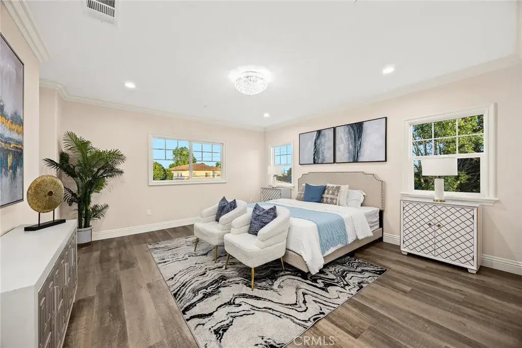 Brand New 2025-Built Home in the Prestigious Temple City School District is now on the market! Welcome to this stunning newly constructed luxury estate featuring 5 ensuite bedrooms and 5.5 bathrooms, located in the highly sought-after Temple City School District. This exquisite home is introduced by a secure wrought iron front fence and an automatic gate, leading to a charming front patio and a grand double-door entry. Soaring ceilings and meticulous craftsmanship set the tone for this refined custom residence. Inside, the open-concept floor plan is bathed in natural light from expansive picture windows, creating a bright and inviting ambiance throughout. The first floor showcases an elegant formal living room and a spacious dining room—both designed to provide a warm, welcoming environment for entertaining and everyday living. A standout feature is the 12-foot-high ceiling in the office, a beautiful and versatile space that can also serve as a guest suite or additional living area. Two additional ensuite bedrooms on the first floor add flexibility, making the home ideal for multi-generational living. The heart of the home is a thoughtfully designed kitchen that opens to a cozy yet sophisticated family room. The kitchen features custom cabinetry, a casual breakfast area, and a stylish bar/countertop with under-cabinet lighting—perfect for both entertaining and daily living. An elegantly designed spiral staircase with intricate detailing leads to the upper level, where you’ll find a cozy loft and two spacious ensuite bedrooms. The primary suite is a luxurious retreat, complete with a grand double-door entry, room for a private sitting area, a generous walk-in closet, and a beautifully appointed master bath featuring a soaking tub, separate walk-in shower, dual vanities, and a dedicated makeup counter. This home also includes fully paid-off solar panels, adding energy efficiency and long-term value. The professionally landscaped front and back yards are designed with low maintenance in mind while offering timeless charm. The wide driveway leads to a three-car attached garage, with additional parking behind the gated entrance. The backyard boasts a spacious patio, lush lawn, and potential for an ADU if desired. This exceptional new home offers modern comfort, timeless elegance, and unmatched convenience in a top-tier school district. If you’re searching for a newly built home with four or more bedrooms in Temple City, this one is truly a rare find.