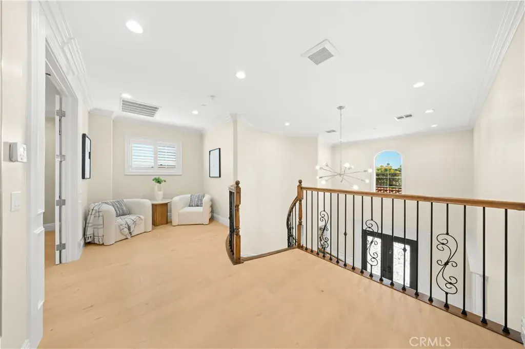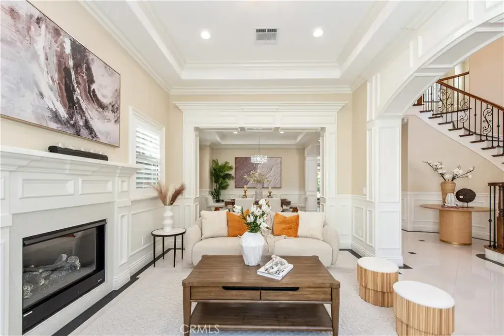 Step through the impressive double doors into a grand foyer with soaring 20-foot ceilings, where natural light cascades across the space in a stunning display of scale and sophistication. Intricate ceiling moldings, expansive door frames, and custom wall paneling throughout the home highlight exceptional craftsmanship and timeless design. To the left, a bright formal living room opens to the front courtyard lounge; to the right, a gracefully curved staircase with ornate railings captures both grandeur and artistry.