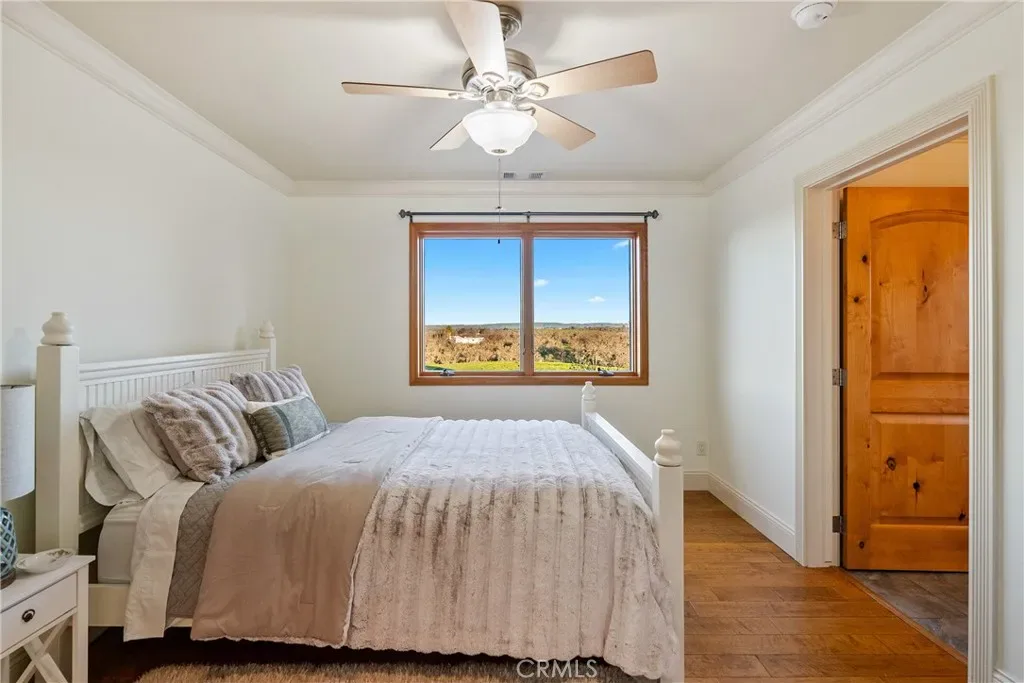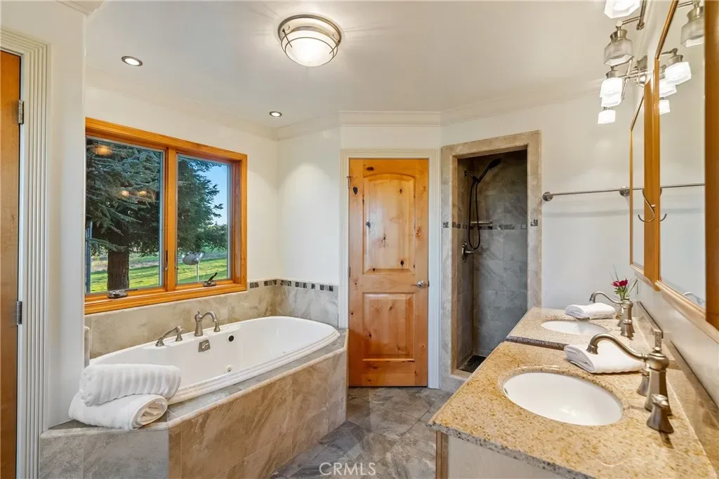The main residence is a 3,842± square foot custom home, designed for everyday comfort and entertaining. The home offers two formal bedrooms plus a flexible room ideal for a home office, den, or optional third bedroom, along with 2.5 bathrooms. Architectural highlights include vaulted ceilings, curved archways, mahogany tray ceilings, marble flooring, copper chimney caps, and panoramic views. The chef’s kitchen features custom cabinetry with Raymond Enkeboll wood carvings, Sub-Zero refrigeration, a BlueStar 8-burner range with double ovens, Fisher-Paykel double dishwashers, wine bar, walk-in pantry, and oversized center island. The primary suite offers direct pool and spa access, a walk-in closet, dual vanities, and a jetted soaking tub. The attached three-car garage is fully finished with epoxy floors, storage, and a Tesla charger. The second residence, is a 1,588± square foot 3 bedroom, 2 bath home with wood floors, vaulted ceilings, custom cabinetry, gas fireplace, tankless water heater, attached two-car garage, and private outdoor space. A 2,100± square foot barn provides workshop and storage space, high bay roll-up door, solar array, split HVAC, and access to a private apartment. The barndominium includes approximately 750± square feet with bedroom, bunk room, bathroom, covered patio, plus an additional 495± square foot bonus or hobby room. Outdoor living includes a 20×40 pool and spa, water features, fire bowls, outdoor shower, and an outdoor kitchen with gas grill, Fontana Forno Italian wood burning pizza oven, Santa Maria grill, smoker, kegerator, and pergola. Amenities include a putting green, bocce court, chicken coop, landscaping, and an east-facing view deck. The property features two wells, two septic systems, 40,900± gallons of water storage, fire sprinklers, smart irrigation, automatic gate, chip seal driveway, and fencing. Approximately two acres are planted to Aglianico and Cabernet Franc vines. A turnkey estate offering privacy, infrastructure, lifestyle amenities, and income potential, just minutes from Paso Robles, Templeton, and Atascadero.