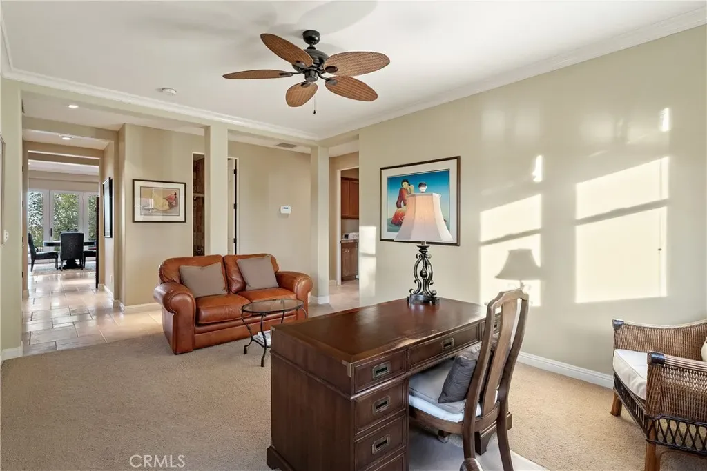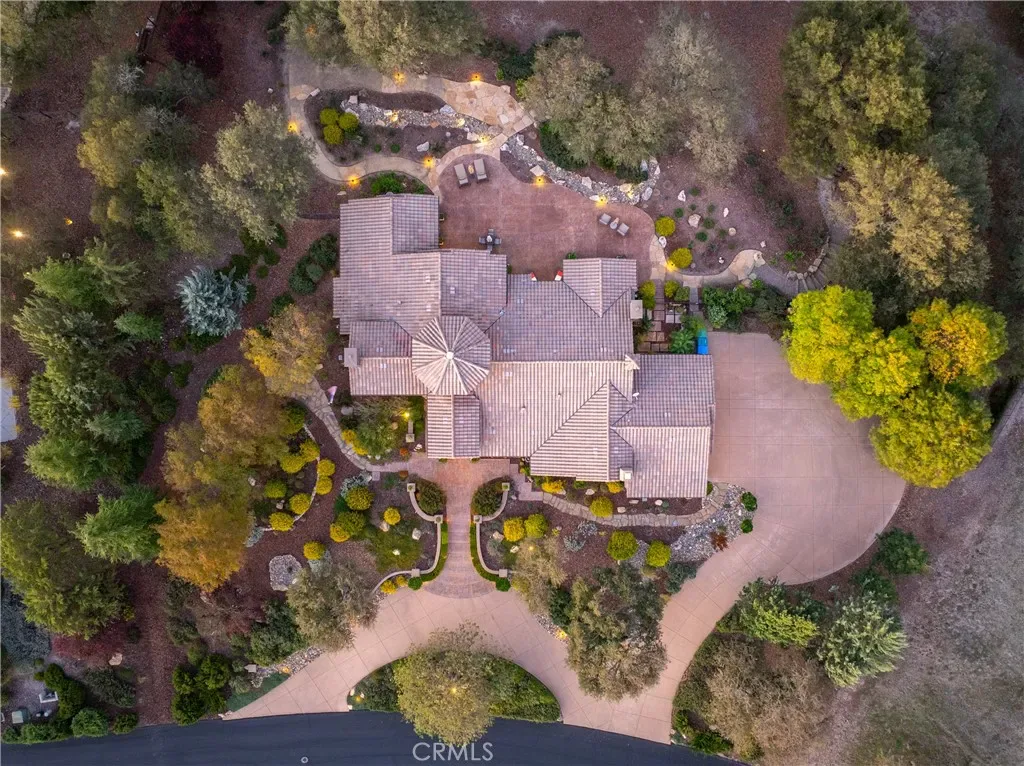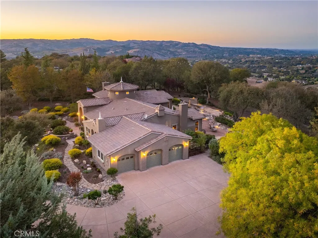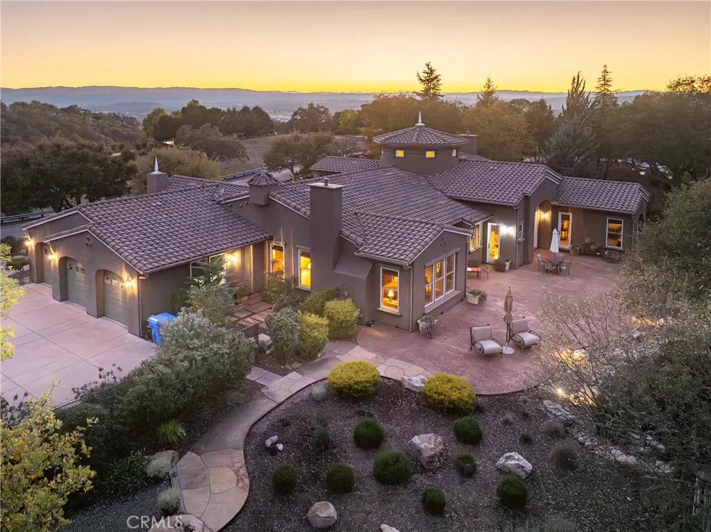 The spacious primary suite offers privacy, dual walk-in closets, and a luxurious bath with soaking tub and large shower. Additional bedrooms and a flexible office space capture beautiful hillside and sunset views. Outdoor living shines with expansive flagstone patios, multiple sitting areas, and lush landscaping surrounded by heritage oaks – perfect for dining, relaxing, or entertaining under the stars.
