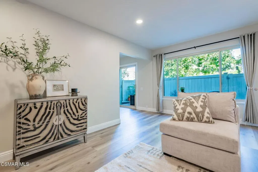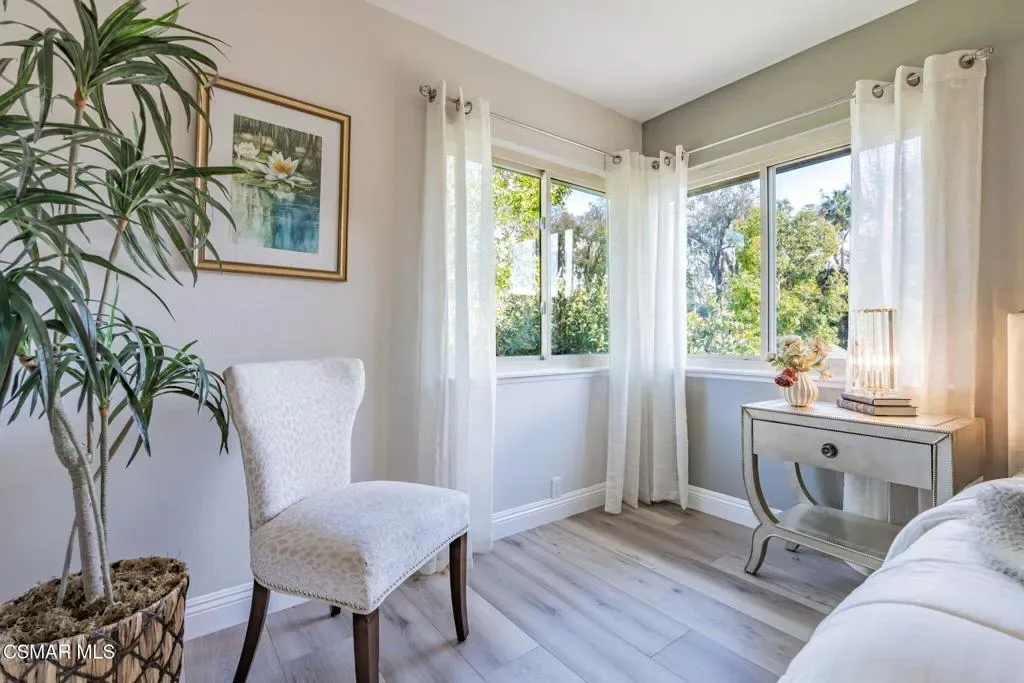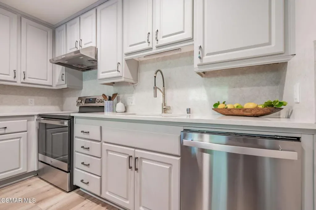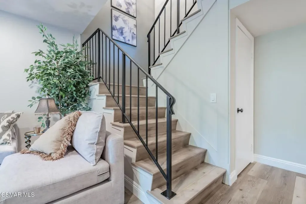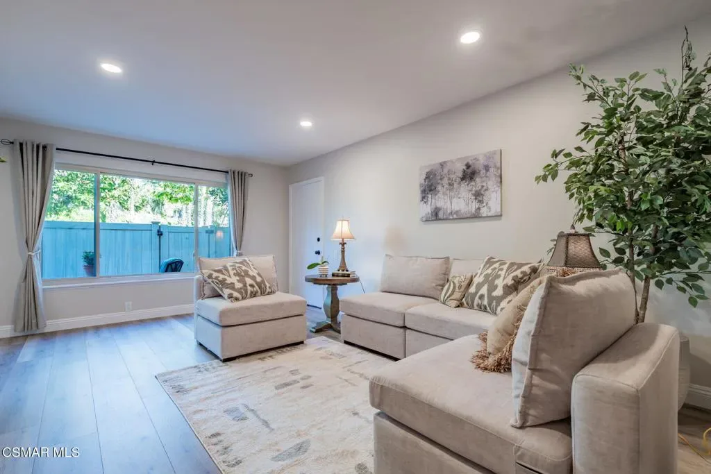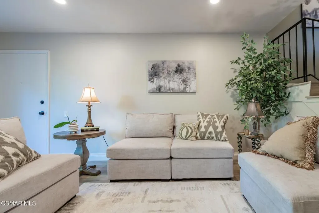 This meticulously designed Turn-key home is nestled in the peaceful Oakbrook Townhomes community with abundant greenbelts and tree lined pathways situated in the beautiful, centrally located city of Thousand Oaks. This 3 bed/1.5 bath 1152 Sq. Ft. townhome is upgraded throughout by an interior designer with upgrades including: new luxury vinyl plank wood-like flooring, new paint with elegant designer color pallet, five inch baseboards, scraped ceilings , and dimmable recessed lighting just to name a few. Both bathrooms have new sinks, vanities and fixtures including the upstairs beautifully tiled shower with bathtub and the designer color pallet carrying over to the gorgeous tiled floor. The kitchen boasts Spanish quartz counter tops and backsplash, custom cabinetry, soft-close drawers, LG stainless steel appliances, a Fisher & Paykel stainless steel refrigerator, a large basin stainless steel sink and a high end Wasserwerk pull down kitchen faucet. Some energy efficient features include a newer Bosch HVAC system, LG ThinQ Smart washer and dryer, and double-paned American Vision windows throughout including patio slider. The park-like amenities include a large pool, a separate kiddie pool, spa, clubhouse, and a playground area surrounded by the lush green landscaping. The low HOA fee also includes : trash, insurance, and maintenance of the home’s exterior and common areas. A serene neighborhood with great shopping, dining and the Conejo Valley award-winning schools nearby. This is a must see Turn-key home ready for a new happy owner to enjoy for many years to come.