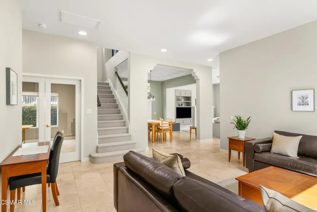 Situated on one of the most coveted lots in Bellagio at Lang Ranch, this highly sought-after Plan 3 residence is tucked away on a cul-de-sac and nestled against a serene natural setting, creating a peaceful and welcoming environment. The homeowners have approached every upgrade with exceptional attention to detail and care, resulting in a home that is both elegant and thoughtfully enhanced.Featuring a dual staircase, the home offers 3 bedrooms and a spacious loft upstairs, along with a downstairs bedroom currently utilized as an office. A full 3-car garage, extended driveway, and side access for additional parking further elevate this exceptional property.Upon entry, you are immediately captivated by the home’s refined tones, clean aesthetic, and seamless flow–beautifully complemented by natural surroundings framed through each window. You are drawn into the welcoming living room, which transitions effortlessly into an intimate dining area highlighted by French doors that open to a cozy sitting space. The removal of the former pony wall between the dining and family rooms creates an open, engaging floor plan, ideal for both everyday living and gatherings with family and friends.The open design continues into the beautifully updated kitchen, creating a natural gathering space at the heart of the home. Thoughtfully redesigned with both style and function in mind, the kitchen showcases classic shaker-style cabinetry, granite countertops, a Viking Professional 6-burner range with hood, a built-in refrigerator, and dual Fisher & Paykel drawer dishwashers. An expanded center island with additional storage offers the perfect setting for casual dining and entertaining.Overlooking the family room, this space is further enhanced by picturesque views of the backyard, where the home’s exceptional setting truly comes to life. Surrounded by a serene natural backdrop, the outdoor space offers a peaceful and private retreat–ideal for relaxing, entertaining, or simply enjoying the beauty of the surroundings.Upstairs, a versatile multi-purpose loft offers endless possibilities–perfect as cozy lounge, playroom, or media space–adding both flexibility and functionality to the home. Two generous secondary bedrooms are well-appointed and share a hall bath, providing comfortable accommodations for family or guests.The primary suite serves as a private retreat, showcasing stunning views and a sense of tranquility. The en-suite bath features two newly updated vanities that continue the home’s cohesive design theme, blending style and comfort in a beautifully refreshed space.Additional improvements include a newer high-efficiency air conditioning system with four additional return air ducts, newer carpet, and fresh interior and exterior paint. The exterior has been thoughtfully enhanced with custom hardscape and landscaping, featuring water-saving irrigation and drought-conscious plantings for both beauty and efficiency.Bellagio is a gated community offering a pool, spa, and playground, all while being conveniently located near nearby parks, miles of hiking and biking trails, shopping, and award-winning schools. This is a rare opportunity to own a truly special home in one of the most desirable communities in Lang Ranch!