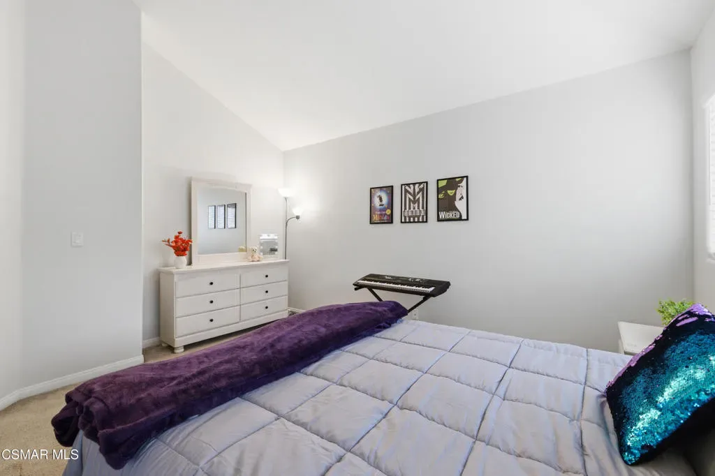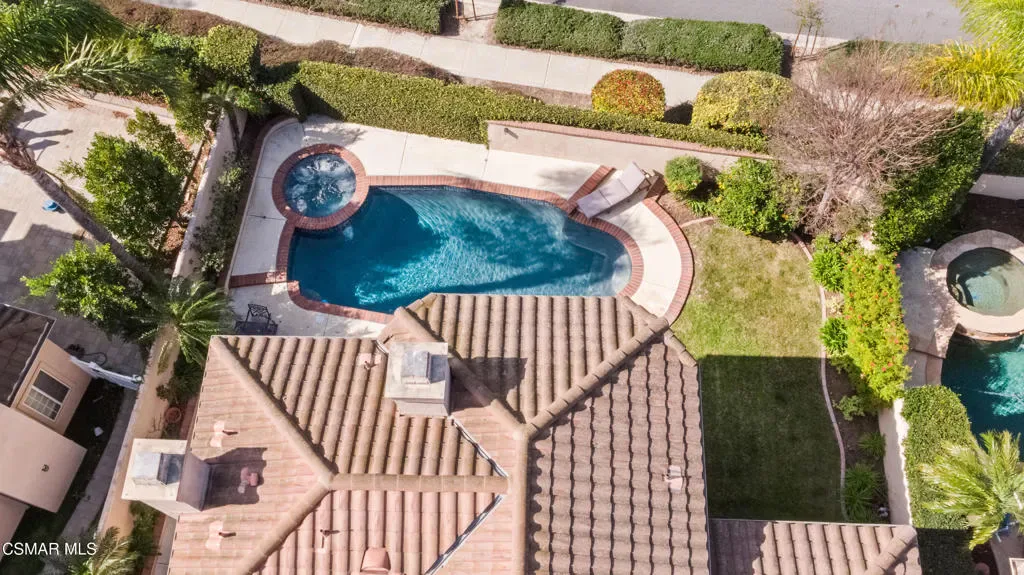 Located in a desirable Thousand Oaks neighborhood with amazing views of the Topa Topa Mountains, this 4-bedroom, 3-bath home offers approximately 2,640 square feet and a highly functional floor plan designed for both comfort and flexibility. A full bedroom and bath on the main level provides ideal space for guests, extended family, or a private home office. The main level features mid-tone wood flooring and connected living spaces, with the kitchen opening directly to the family room and the formal dining area flowing into the living room. Vaulted ceilings and abundant natural light enhance the sense of space throughout. The kitchen includes granite countertops, stainless steel appliances, a center island, and a white subway tile backsplash. Upstairs features a spacious loft ideal as a secondary living room or playroom, along with two secondary bedrooms and a generous primary suite complete with a peekaboo fireplace, dual sinks, separate shower, soaking tub, and a walk-in closet with built-in organizers. All bedrooms include closet built-ins for added storage and functionality. The beautifully landscaped backyard offers a pool and spa, usable grass area, lemon/avocado trees and a dedicated space ready for a future BBQ setup — all framed by mature landscaping and perimeter walls and set against stunning Topa Topa Mountain views. The yard is designed for both relaxation and entertaining. Additional highlights include indoor laundry and a 3-car garage with one bay currently configured as office space. Conveniently located on a quiet peaceful street near parks, schools, and shopping.