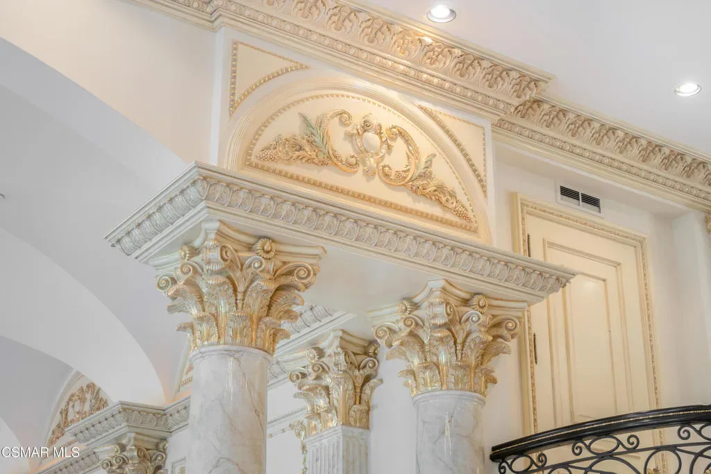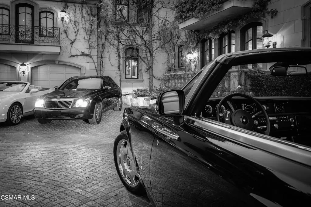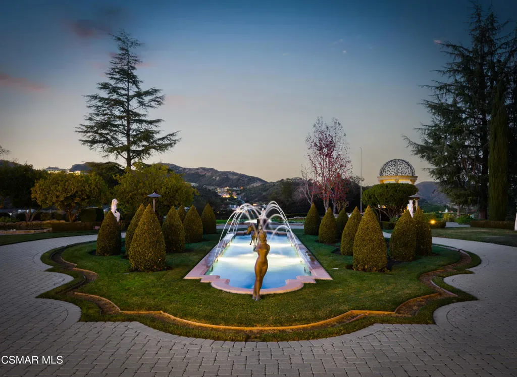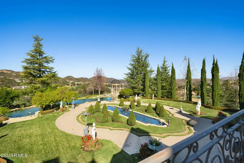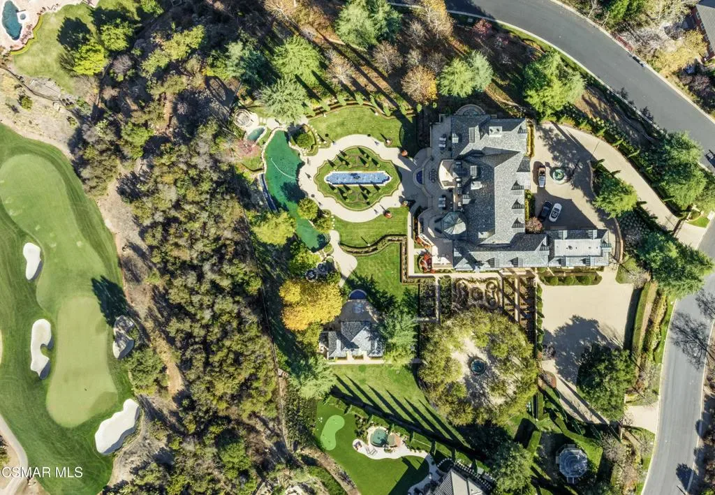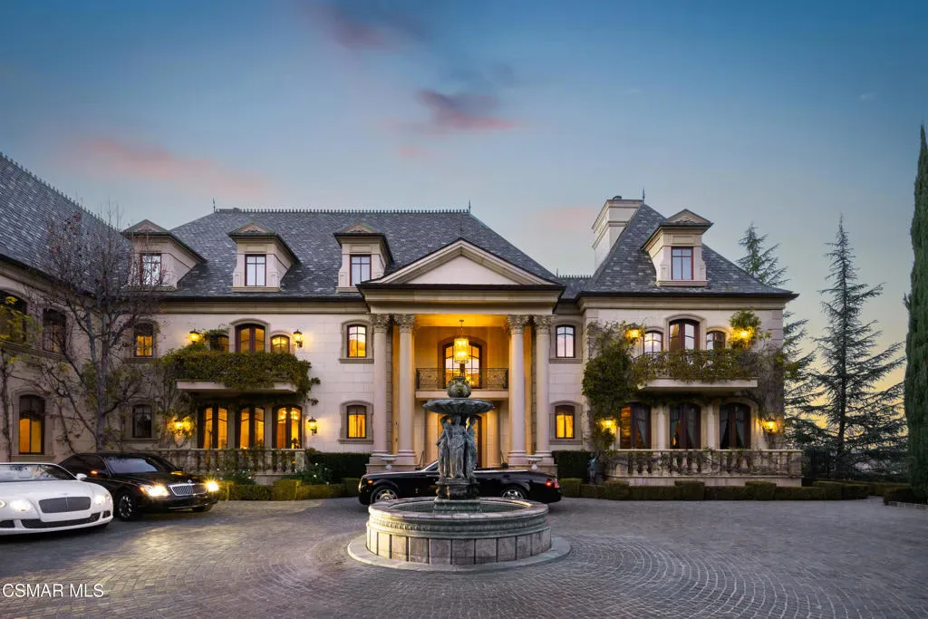 As featured in Robb Report & Los Angeles Times, Chateau Plaisance, a CASTLE nestled within the prestigious 24/7 guard gated Sherwood Country Club, spans nearly 3 private acres across 5 lots, offering breathtaking views of the spectacular Santa Monica Mountains and the renowned Jack Nicklaus Signature Golf Course. Perfected in every detail, this approx. 14,113-square-foot French-inspired masterpiece showcases unparalleled artisanship and timeless elegance.The Castle’s park-like grounds are a true masterpiece, featuring formal box-hedged gardens filled with thousands of roses, lush lawns adorned with life-sized statuary, and cobblestone pathways leading to a striking 52-foot reflection pond where bronze horses appear to gallop through cascading water. A serene large infinity pool and spa with a waterfall, a koi pond, and an ornate iron gazebo overlooking the valley complete this enchanting outdoor retreat.A grand entrance welcomes you into the rotunda, where a dazzling Baccarat chandelier, hand-painted murals, and a sweeping marble staircase with a gold-leafed iron banister set the tone for the opulence within. The 22-foot-high Grand Salon & Ballroom boasts two Spanish brass and crystal chandeliers, a carved fireplace, and towering windows that frame the gardens. An elevated alcove provides the perfect stage for entertainment.The richly paneled library, complete with parquet flooring, a fireplace, and a hidden bar, offers a cozy escape, while the formal dining room, seating 20, is illuminated by two custom Waterford chandeliers. The gourmet kitchen, adorned with antiqued cabinetry, parquet flooring, four subzero refrigerators, and two oversized islands, opens to a warm and inviting family room featuring a grand fireplace, elegant window seating, and a granite-topped bar.The second floor offers a luxurious primary suite with a sitting area, fireplace, a sleek wet bar, and two lavish spa-inspired baths with oversized closets. Additional guest suites, a Carriage House apartment, and a hidden third-floor bonus space provide ample accommodations. The completed third floor features four separate rooms, providing endless possibilities for a home theater, gym, art studio, or private retreat.This Castle also includes a Pool House–a Mini Chateau with a great room, grand fireplace, kitchen, and two bathrooms, perfect for poolside entertaining. Two gated entrances lead to an elegant courtyard with an imported French fountain, while a separate guest parking area and the Grand Plaza can accommodate up to 150 guests.Gated guest parking is conveniently located near the charming greenhouse and the elegant archway leading to the Grand Plaza, designed to accommodate approximately 150 guests with ease. Chateau Plaisance Castle stands as a pinnacle of luxury, privacy, and grandeur–an estate unlike any other to ever grace the market.