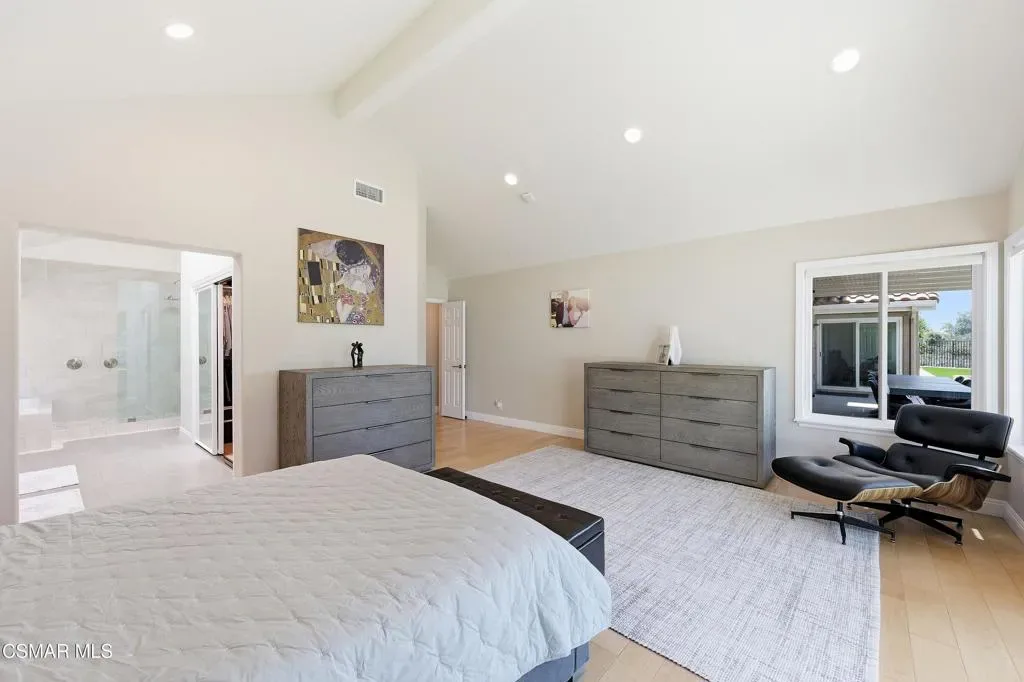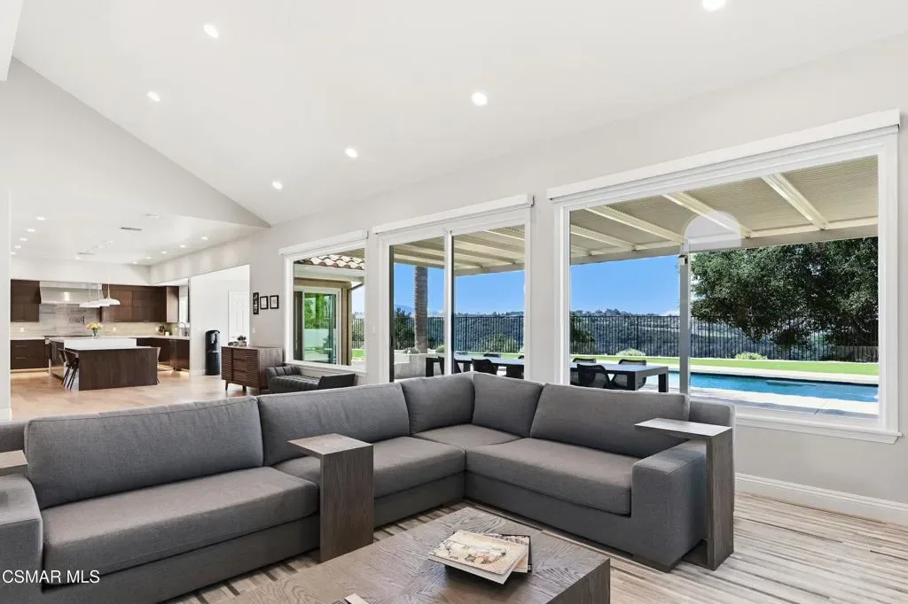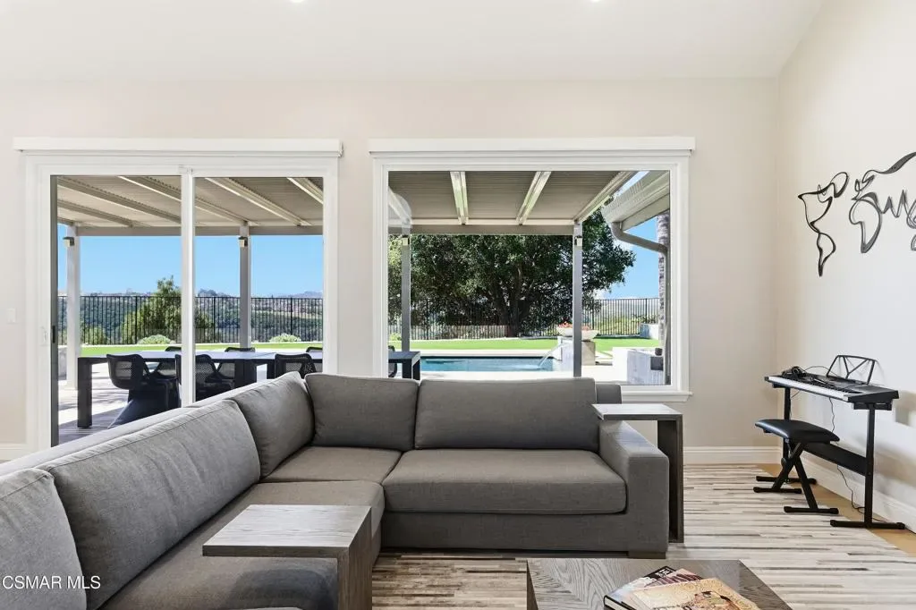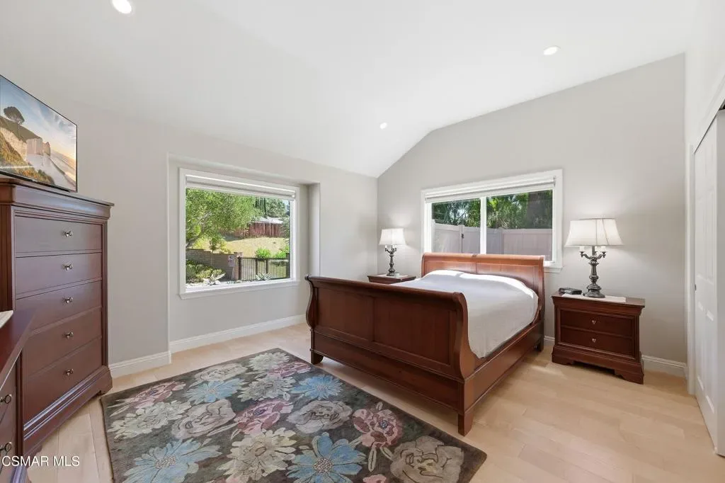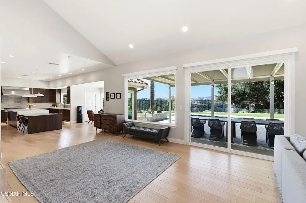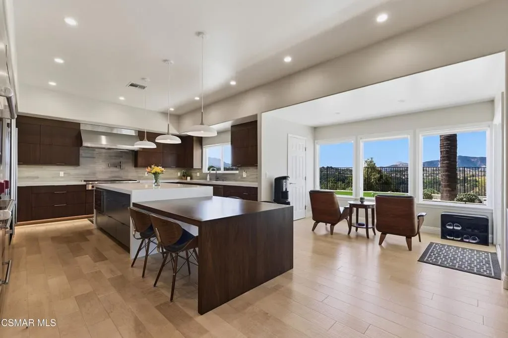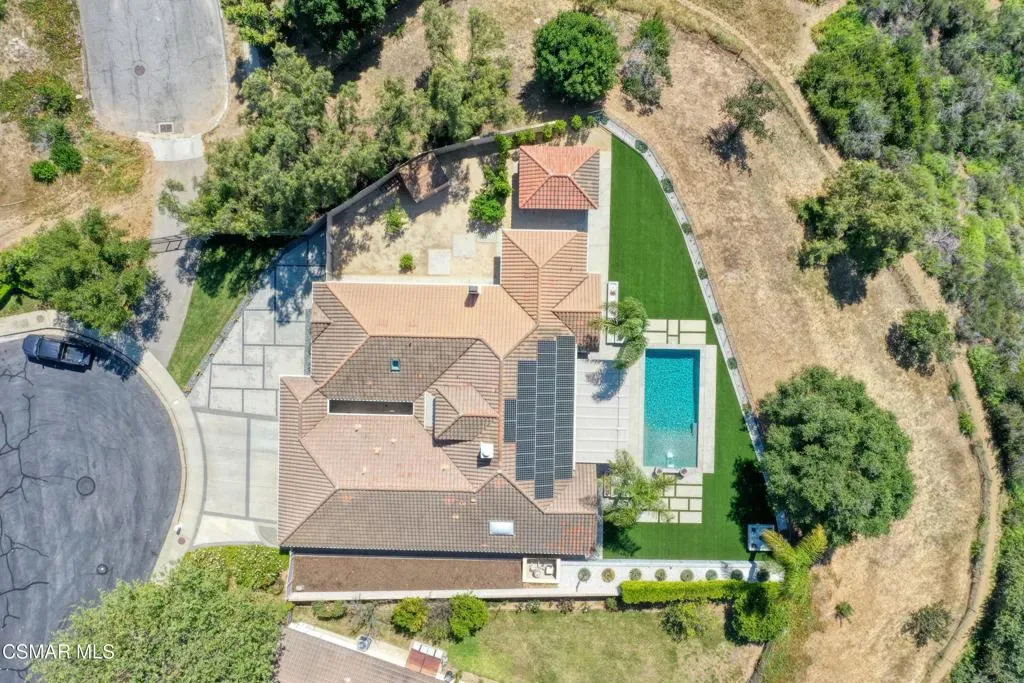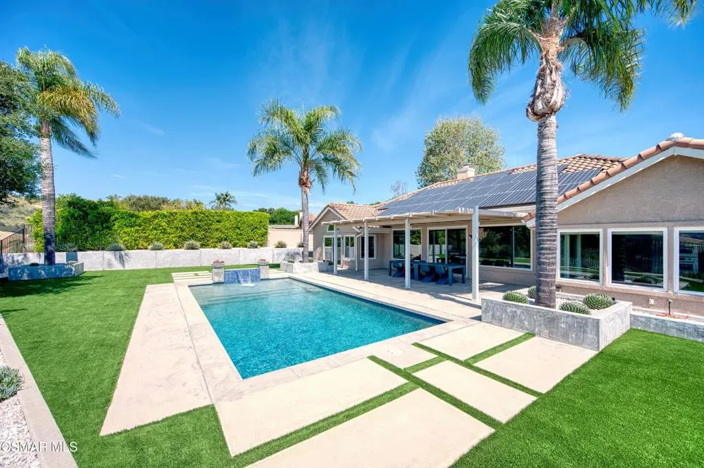 VIEW! VIEW! VIEW! Stunning SINGLE LEVEL home in Gated Lynnmere Estates on a cul-de-sac lot offers privacy and panoramic sunset views of Rancho Conejo Valley and Mount Boney. This Lynnmere gem has been professionally remodeled with no expense spared, offering an exceptional blend of custom luxury, comfort, and contemporary functionality.Enter through your private gated entrance and be welcomed by an over-sized solid Mahogany custom pivot door with a sleek solid steel linear handle. Step inside to an open, airy floor plan with raised ceilings creating an impressive sense of volume and light. The expanded, fully remodeled kitchen is a true showpiece, featuring: Rich walnut cabinetry with soft close drawers, a large center quartz waterfall island connected to a solid walnut custom waterfall kitchen table ideal for gatherings, Sub Zero refrigerator, Sub Zero mother in law refrigerator, and Sub Zero 146-bottle dual-zone wine refrigerator, two Wolf ovens, including a steam oven, an oversized 48” Wolf gas range with a solid steel pot filler, and a spacious pantry. The kitchen opens seamlessly to the great room, where a warm fireplace and expansive picture windows frame breathtaking mountain and trail views, filling the space-with natural light creating a strong connection to nature. The primary suite is a serene retreat with a fully remodeled bathroom featuring: His and hers shower, heated flooring, newer cabinetry, sinks, mirrors, and toilet and premium Grohe fixtures. The guest bathroom has also been beautifully updated with new cabinetry, toilet, mirrors, faucet, and shower regulator. Additional major upgrades include Replacement of all accessible attic ducts, three newer HVAC systems, each equipped with germicidal UV Light, completely paid off solar system, roof replaced in 2017 with two layers of underlayment, appx. 1,000 sq ft of permitted additions designed by an engineer and architect. The south wing offers two bedrooms and an ADA prepared bathroom with heated flooring–perfect for multi-generational living or guests. Throughout the home, you’ll find engineered maple flooring, 5” baseboards, and freshly painted walls and ceilings. The exterior is equally impressive, featuring low maintenance synthetic turf, concrete, DG, and river rock landscaping, fruit trees, zero maintenance fencing that preserves privacy without obstructing views, a 10×10 Tuff shed for storage, RV parking approximately 9’x40′ (HOA approved as long as it’s not visible from the street). Enjoy year-round outdoor living in the south side lanai, complete with: Grill, refrigerator, fireplace, fans, heaters, lighting & fire-resistant wood construction. The pool was completely rebuilt in 2020, featuring pebble tech finish, elegant tile work, a baja-shelf, auto-filler, remote controlled lighting, and a tension safety net. For peace of mind, the home includes: six exterior Ring floodlight cameras, ring doorbell, ADT security system on all windows & doors. The three-car garage is equipped with: Two Tesla batteries, 240V/25 amp EV chargers, contemporary roll up doors with backup batteries and deadlocks & additional 9’x9′ storage room for bikes, toys or camping gear!This home truly has every bell and whistle–luxury upgrades, thoughtful design, and meticulous care throughout. There is simply nothing else like it!