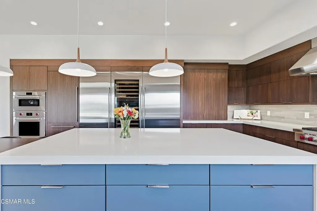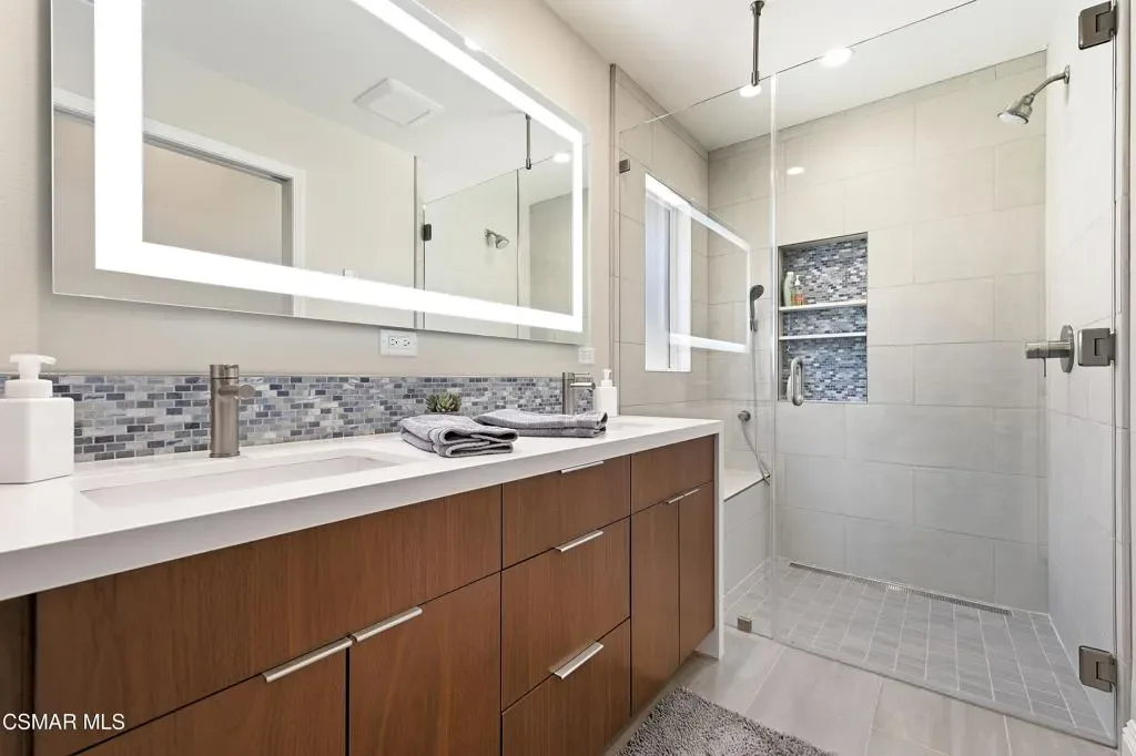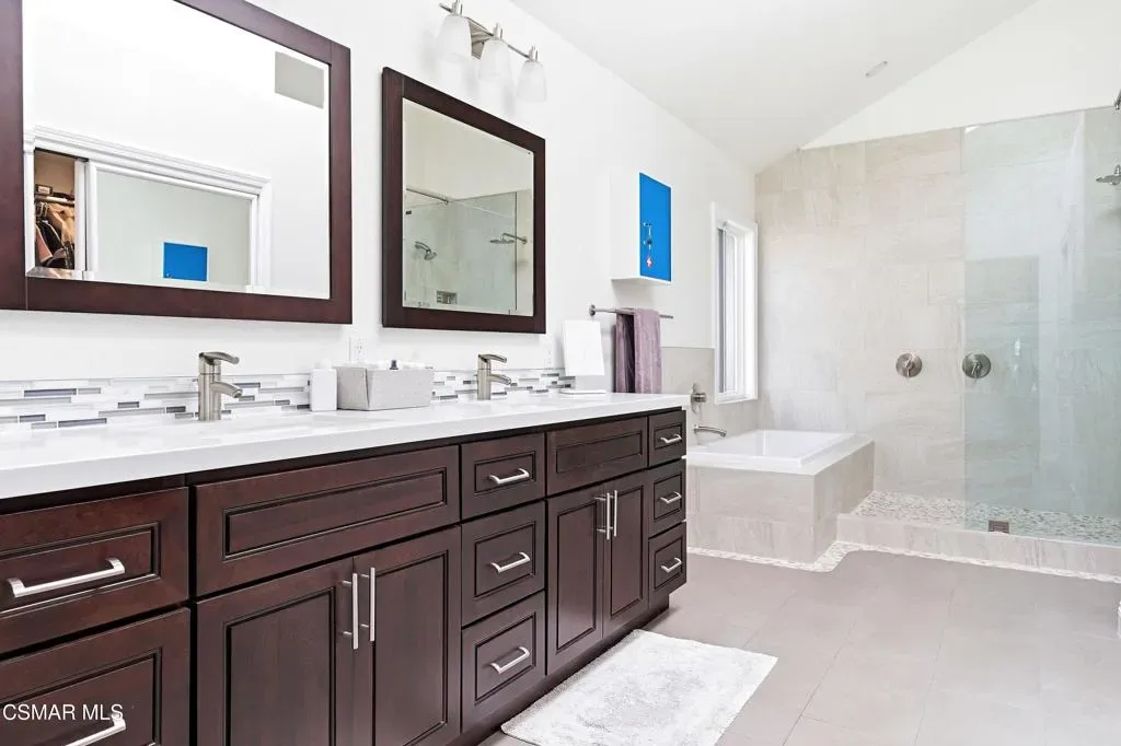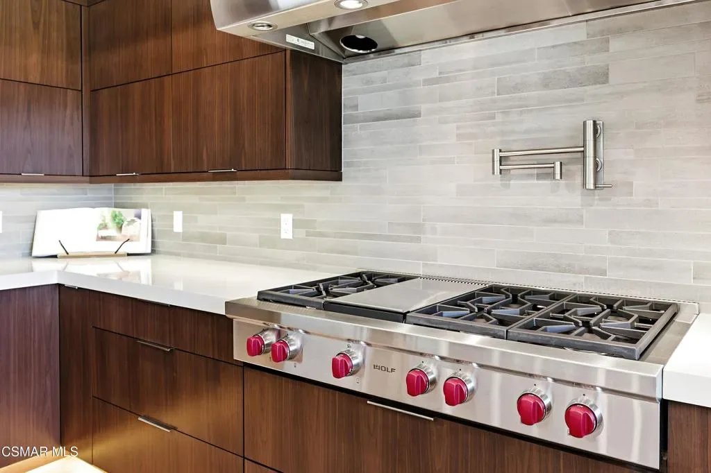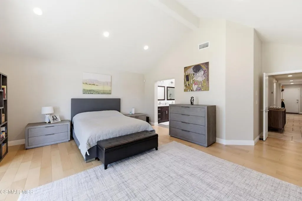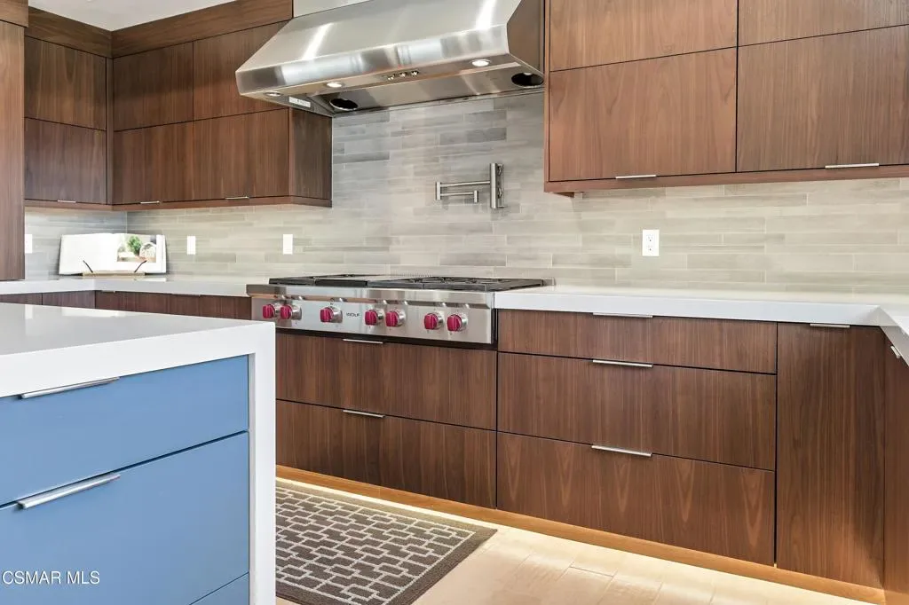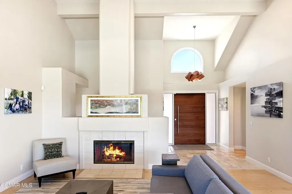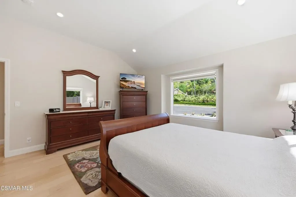 VIEW! VIEW! VIEW! Stunning SINGLE LEVEL home in Gated Lynnmere Estates on a cul-de-sac lot offers privacy and panoramic sunset views of Rancho Conejo Valley and Mount Boney. This Lynnmere gem has been professionally remodeled with no expense spared, offering an exceptional blend of custom luxury, comfort, and contemporary functionality.Enter through your private gated entrance and be welcomed by an over-sized solid Mahogany custom pivot door with a sleek solid steel linear handle. Step inside to an open, airy floor plan with raised ceilings creating an impressive sense of volume and light. The expanded, fully remodeled kitchen is a true showpiece, featuring: Rich walnut cabinetry with soft close drawers, a large center quartz waterfall island connected to a solid walnut custom waterfall kitchen table ideal for gatherings, Sub Zero refrigerator, Sub Zero mother in law refrigerator, and Sub Zero 146-bottle dual-zone wine refrigerator, two Wolf ovens, including a steam oven, an oversized 48” Wolf gas range with a solid steel pot filler, and a spacious pantry. The kitchen opens seamlessly to the great room, where a warm fireplace and expansive picture windows frame breathtaking mountain and trail views, filling the space-with natural light creating a strong connection to nature. The primary suite is a serene retreat with a fully remodeled bathroom featuring: His and hers shower, heated flooring, newer cabinetry, sinks, mirrors, and toilet and premium Grohe fixtures. The guest bathroom has also been beautifully updated with new cabinetry, toilet, mirrors, faucet, and shower regulator. Additional major upgrades include Replacement of all accessible attic ducts, three newer HVAC systems, each equipped with germicidal UV Light, completely paid off solar system, roof replaced in 2017 with two layers of underlayment, appx. 1,000 sq ft of permitted additions designed by an engineer and architect. The south wing offers two bedrooms and an ADA prepared bathroom with heated flooring–perfect for multi-generational living or guests. Throughout the home, you’ll find engineered maple flooring, 5” baseboards, and freshly painted walls and ceilings. The exterior is equally impressive, featuring low maintenance synthetic turf, concrete, DG, and river rock landscaping, fruit trees, zero maintenance fencing that preserves privacy without obstructing views, a 10×10 Tuff shed for storage, RV parking approximately 9’x40′ (HOA approved as long as it’s not visible from the street). Enjoy year-round outdoor living in the south side lanai, complete with: Grill, refrigerator, fireplace, fans, heaters, lighting & fire-resistant wood construction. The pool was completely rebuilt in 2020, featuring pebble tech finish, elegant tile work, a baja-shelf, auto-filler, remote controlled lighting, and a tension safety net. For peace of mind, the home includes: six exterior Ring floodlight cameras, ring doorbell, ADT security system on all windows & doors. The three-car garage is equipped with: Two Tesla batteries, 240V/25 amp EV chargers, contemporary roll up doors with backup batteries and deadlocks & additional 9’x9′ storage room for bikes, toys or camping gear!This home truly has every bell and whistle–luxury upgrades, thoughtful design, and meticulous care throughout. There is simply nothing else like it!