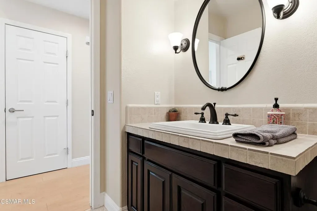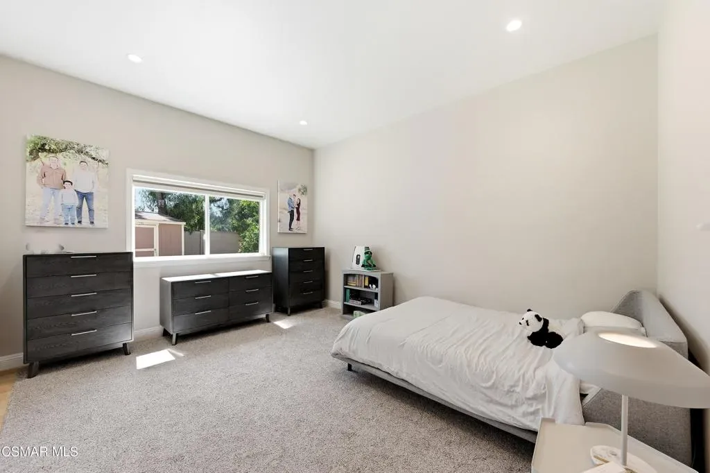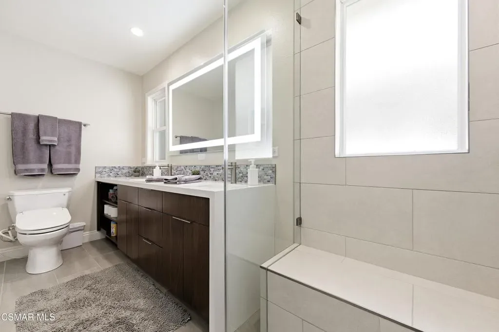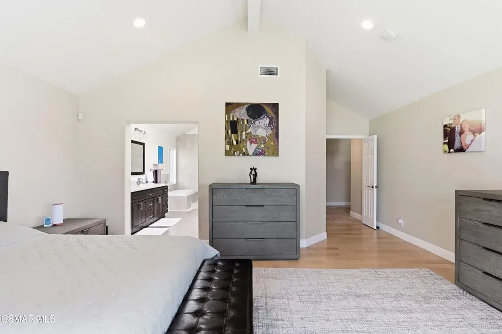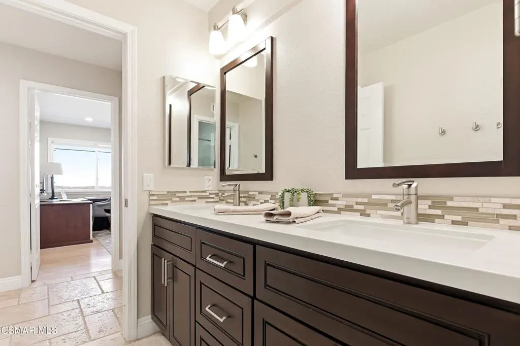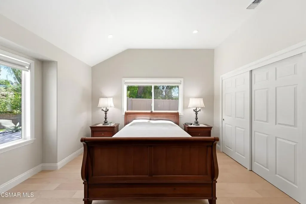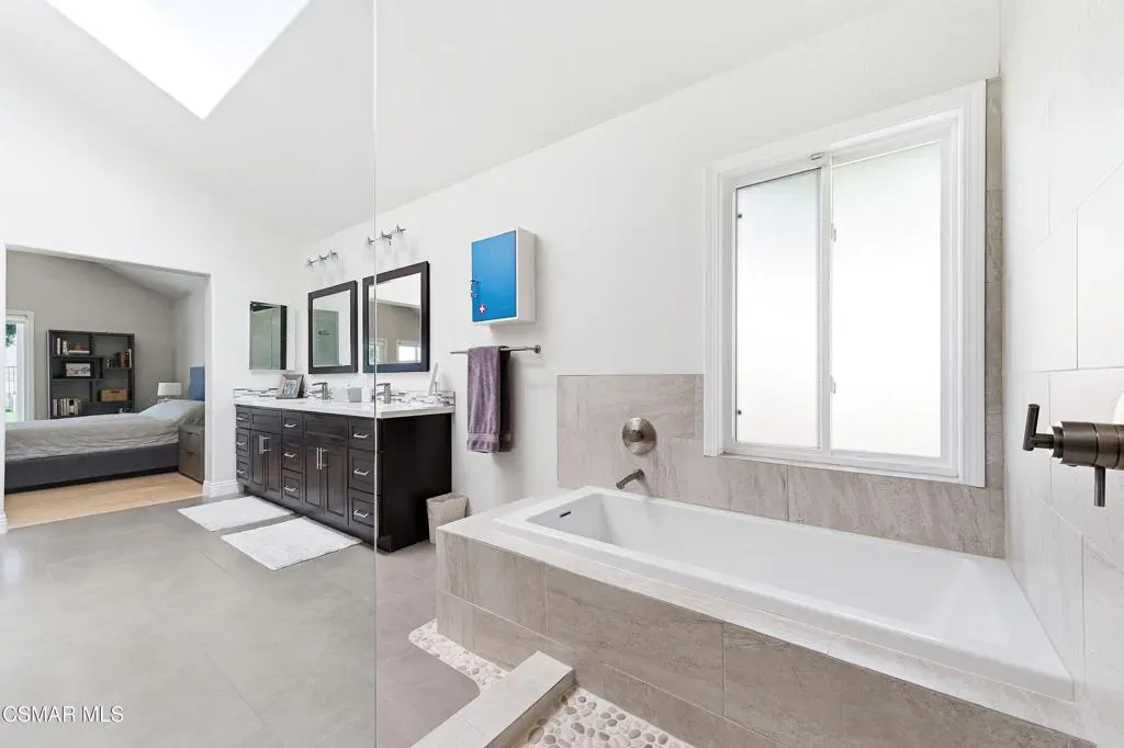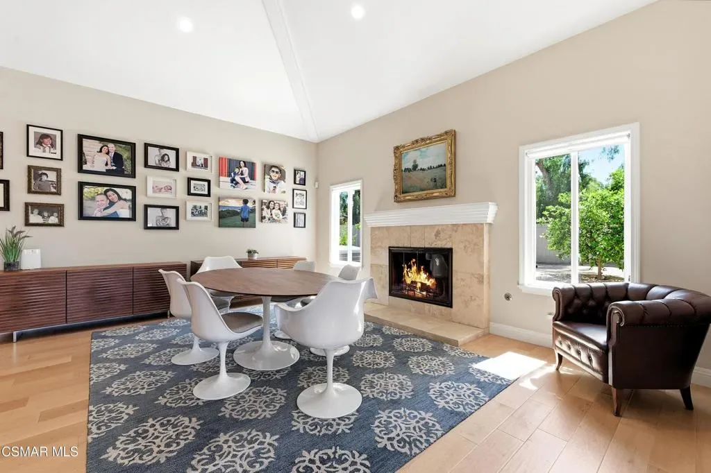 VIEW! VIEW! VIEW! Stunning SINGLE LEVEL home in Gated Lynnmere Estates on a cul-de-sac lot offers privacy and panoramic sunset views of Rancho Conejo Valley and Mount Boney. This Lynnmere gem has been professionally remodeled with no expense spared, offering an exceptional blend of custom luxury, comfort, and contemporary functionality.Enter through your private gated entrance and be welcomed by an over-sized solid Mahogany custom pivot door with a sleek solid steel linear handle. Step inside to an open, airy floor plan with raised ceilings creating an impressive sense of volume and light. The expanded, fully remodeled kitchen is a true showpiece, featuring: Rich walnut cabinetry with soft close drawers, a large center quartz waterfall island connected to a solid walnut custom waterfall kitchen table ideal for gatherings, Sub Zero refrigerator, Sub Zero mother in law refrigerator, and Sub Zero 146-bottle dual-zone wine refrigerator, two Wolf ovens, including a steam oven, an oversized 48” Wolf gas range with a solid steel pot filler, and a spacious pantry. The kitchen opens seamlessly to the great room, where a warm fireplace and expansive picture windows frame breathtaking mountain and trail views, filling the space-with natural light creating a strong connection to nature. The primary suite is a serene retreat with a fully remodeled bathroom featuring: His and hers shower, heated flooring, newer cabinetry, sinks, mirrors, and toilet and premium Grohe fixtures. The guest bathroom has also been beautifully updated with new cabinetry, toilet, mirrors, faucet, and shower regulator. Additional major upgrades include Replacement of all accessible attic ducts, three newer HVAC systems, each equipped with germicidal UV Light, completely paid off solar system, roof replaced in 2017 with two layers of underlayment, appx. 1,000 sq ft of permitted additions designed by an engineer and architect. The south wing offers two bedrooms and an ADA prepared bathroom with heated flooring–perfect for multi-generational living or guests. Throughout the home, you’ll find engineered maple flooring, 5” baseboards, and freshly painted walls and ceilings. The exterior is equally impressive, featuring low maintenance synthetic turf, concrete, DG, and river rock landscaping, fruit trees, zero maintenance fencing that preserves privacy without obstructing views, a 10×10 Tuff shed for storage, RV parking approximately 9’x40′ (HOA approved as long as it’s not visible from the street). Enjoy year-round outdoor living in the south side lanai, complete with: Grill, refrigerator, fireplace, fans, heaters, lighting & fire-resistant wood construction. The pool was completely rebuilt in 2020, featuring pebble tech finish, elegant tile work, a baja-shelf, auto-filler, remote controlled lighting, and a tension safety net. For peace of mind, the home includes: six exterior Ring floodlight cameras, ring doorbell, ADT security system on all windows & doors. The three-car garage is equipped with: Two Tesla batteries, 240V/25 amp EV chargers, contemporary roll up doors with backup batteries and deadlocks & additional 9’x9′ storage room for bikes, toys or camping gear!This home truly has every bell and whistle–luxury upgrades, thoughtful design, and meticulous care throughout. There is simply nothing else like it!