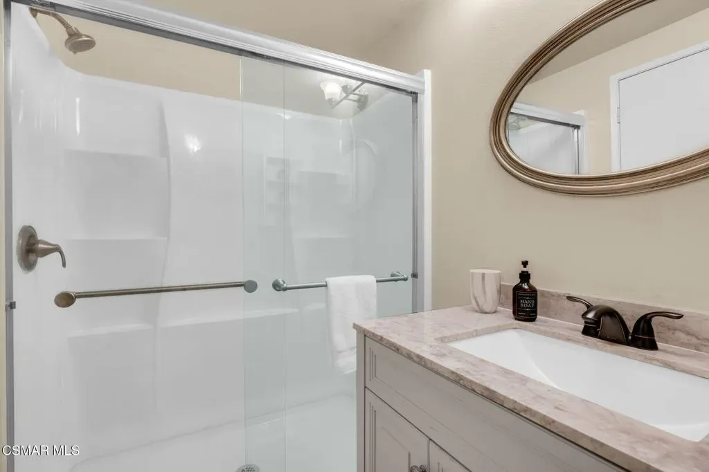 Welcome to this super cute, upper level 2 bed, 2 bath, 1048 SF condo in the 55+ owner occupied community of Oaknoll Villas. Come with your ideas to complete this partially updated home. The living room has vaulted ceilings, a beautiful brick fireplace and glass sliders that leads to the balcony. From the living room, there is a separate dining area just off the kitchen. Down the hall, you have the secondary bedroom and bathroom. At the end of the hall, there’s a spacious primary bedroom with soaring ceilings, a walk-in closet and a large window for plenty of natural light. The primary bathroom has a new shower stall and a laundry closet with new WASHER and DRYER. The home also includes a new dishwasher, newer HVAC, and newer fridge. Oaknoll Villas has wonderful amenities including pool, spa, clubhouse, gym, billiard room, card room, shuffleboard courts, yoga room & dog park. The HOA includes trash, cable/internet, complimentary plumbing service, plenty of guest parking and landscape maintenance. This active SENIOR community is all electric, has carports for parking, is centrally located and very close to nearby parks, Conejo Valley Botanical Garden, shops and restaurants, The Oaks Mall and the Hillcrest Center for the Arts.