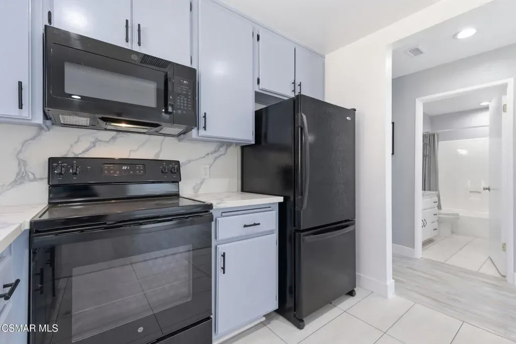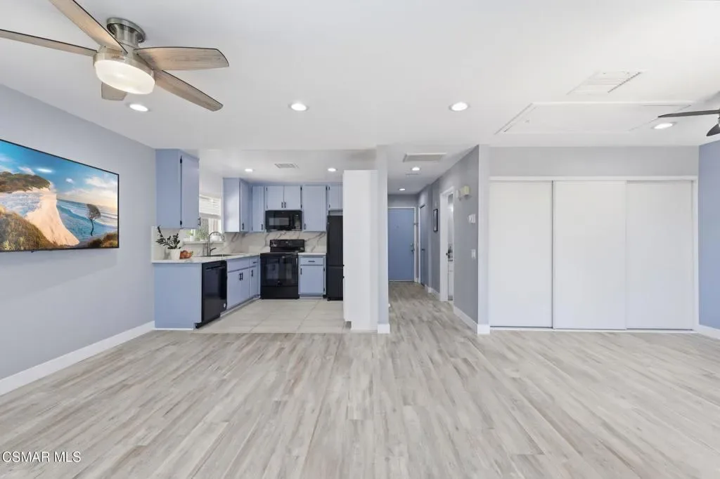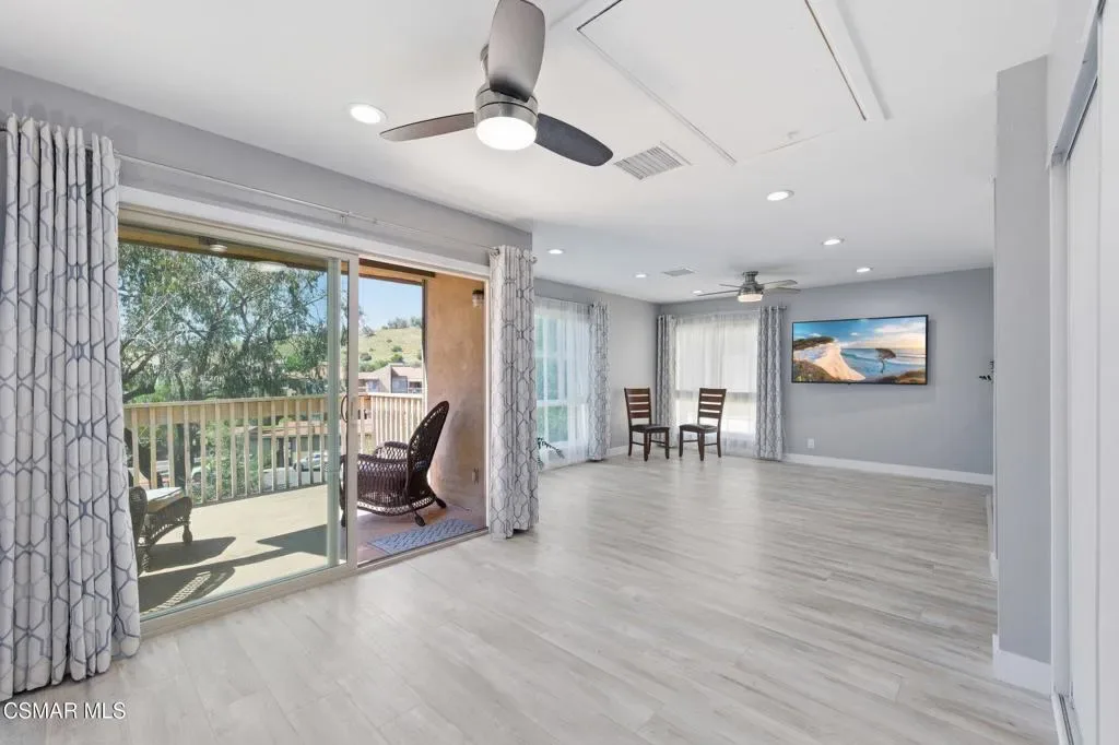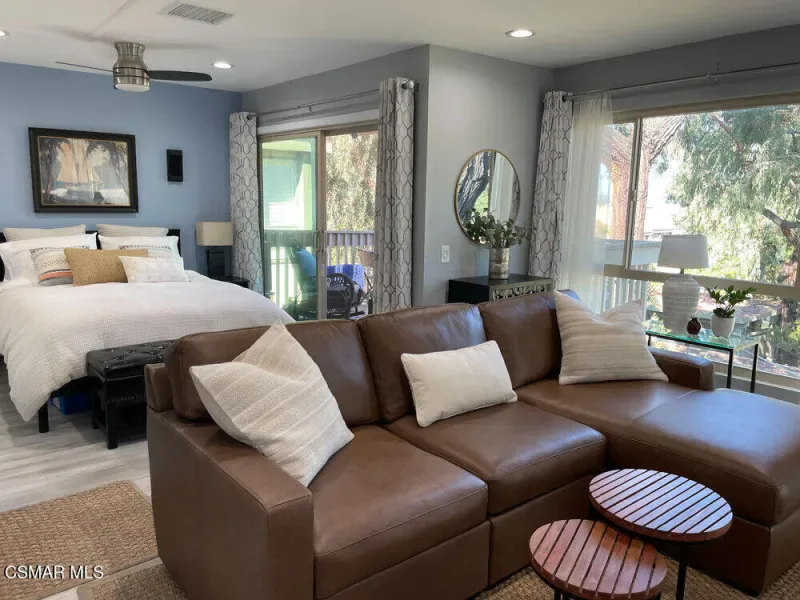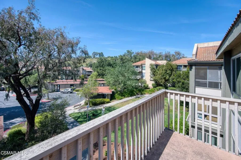 This beautiful penthouse, perched on the 3rd floor with elevator access is an updated studio offering a rare sense of privacy with no adjoining walls creating a peaceful retreat that truly feels like your own sanctuary. Bathed in natural light and surrounded by treetop views, the home features wide-plank luxury vinyl flooring and a fresh, modern palette throughout. The open-concept layout provides flexibility for comfortable living and effortless entertaining, while the private balcony invites you to relax and unwind in a tranquil, natural setting. The living area includes a flat-screen TV, and the thoughtfully updated kitchen is appointed with quartz countertops, light cabinetry, and upgraded appliances, including a refrigerator. The remodeled bathroom, newer HVAC system, ceiling fans, and updated windows and sliding doors ensure both style and comfort, making everyday living seamless. Set within a vibrant 55+ community, residents enjoy an array of resort-style amenities including a pool and spa, clubhouse, fitness center, game room, billiards, library, and business center. One covered parking space is available with storage too. Ideally located near premier shopping, dining, scenic botanical gardens, and miles of hiking trails–with convenient freeway access–this home offers the perfect blend of tranquility and an active, connected lifestyle in the heart of Thousand Oaks.