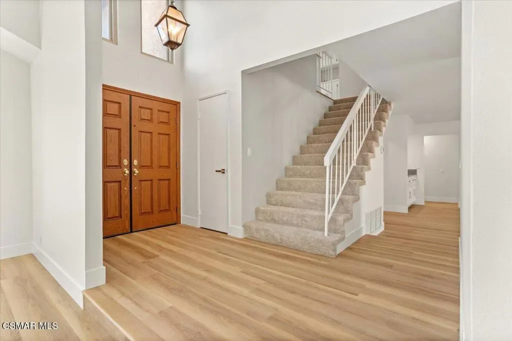 ‘ENRICH YOUR LIFESTYLE —LOCATION—LOCATION—START FRESH–LIVE BETTER–Welcome to a beautifully upgraded home in one of the most sought-after neighborhoods near — California Lutheran University — where comfort, style, and convenience come together. A spacious 4-bedroom, 3-bathroom home offers 2,471 sq ft of living space on a generous 7,840 sq ft lot, complete with a 3-car garage. From the moment you arrive, you’re greeted by a charming brick entry and elegant Caramel-colored wood double doors that set the tone for what’s inside. Step through the front door to soaring cathedral ceilings and a light-filled interior freshly painted with Dunn-Edward’s designer tones with crisp white ceilings and trim creating a warm yet modern aesthetic throughout. Brand-new waterproof flooring flows seamlessly in the home, complimented by new countertops throughout. The kitchen and family room feature new striking modern concrete colored quartz surfaces, while the bathrooms showcase updated quartz white countertops with a refined blue satin finish. The chef’s kitchen is thoughtfully designed with a stainless-steel sink, integrated cutting board, vegetable washing tray, and drying rack, along with a sleek five-burner gas cooktop and stainless-steel hood–perfect for both everyday cooking and gatherings. The kitchen open concept flows into the family room which includes a bar counter and a gas fireplace ready for entertaining. The main suite is generously sized, offering a large walk-in closet and a spacious bathroom with dual sinks and a walk down shower tub. The second bathroom upstairs also features dual sinks and a shower-tub combination, the fourth bedroom downstairs provide exceptional flexibility for multi-generational living, complete with its own walk-in closet and en-suite bathroom with dual access–conveniently serving both the bedroom and visitors. Enjoy cozy evenings by either of the two brick hearth gas fireplaces, located in both the living room and family room. Step outside to a beautifully resurfaced backyard patio in a rich mission red tone, surrounded by thoughtfully designed drought-resistant landscaping with native shrubs–perfect for relaxing or entertaining with minimal maintenance. Thistlewood home’s location is truly unbeatable. Springfield Park is down the street featuring workout centers, basketball court, fields for soccer, football & baseball, stroller path, playground, creek to catch Crawdads, picnic tables and allows dogs. You’re just a short walk to California Lutheran University, including access to public lap pool and public play pool for family and kids. Scenic trails through Mount Clef Ridge–ideal for hiking and mountain biking. Everyday conveniences are also walkable, including Trader Joe’s and a variety of popular dining options. With its extensive upgrades, flexible layout, and prime location, this exceptional home offers the perfect blend of lifestyle and livability. –MUST SEE–, Thistlewood won’t last long!–