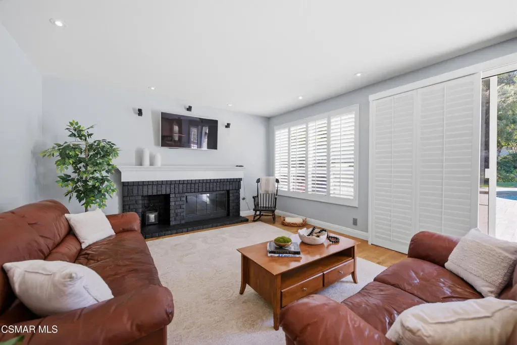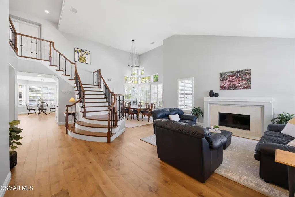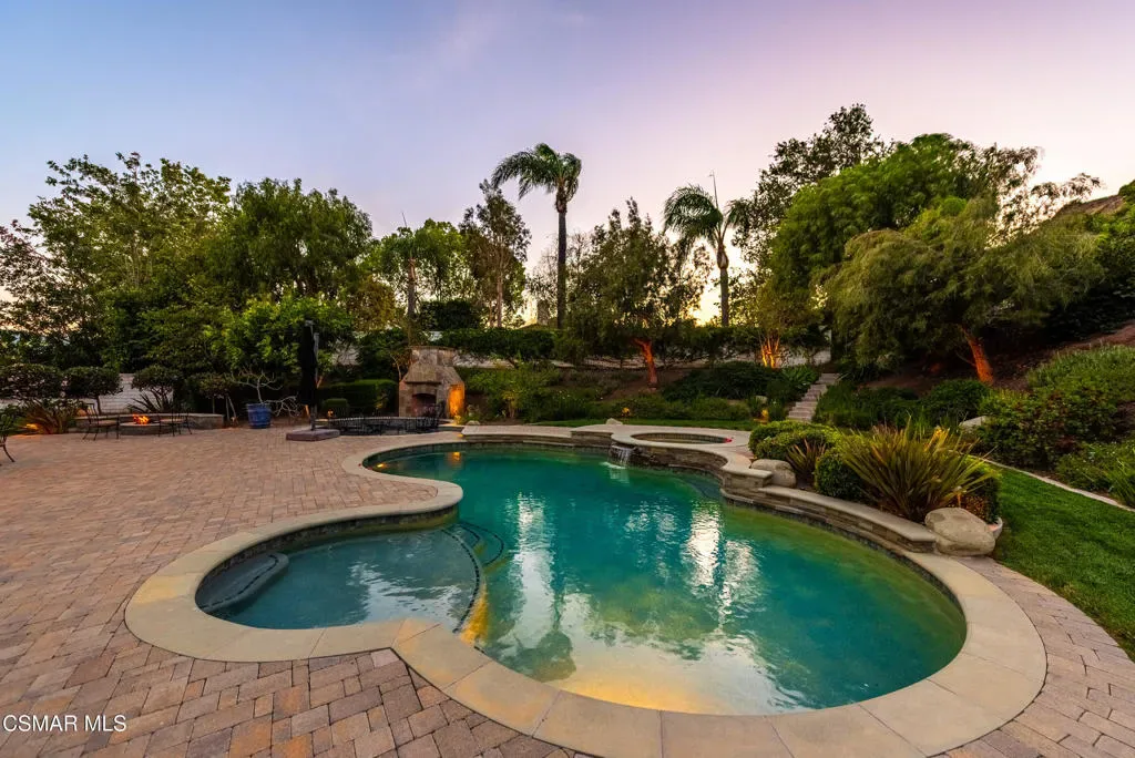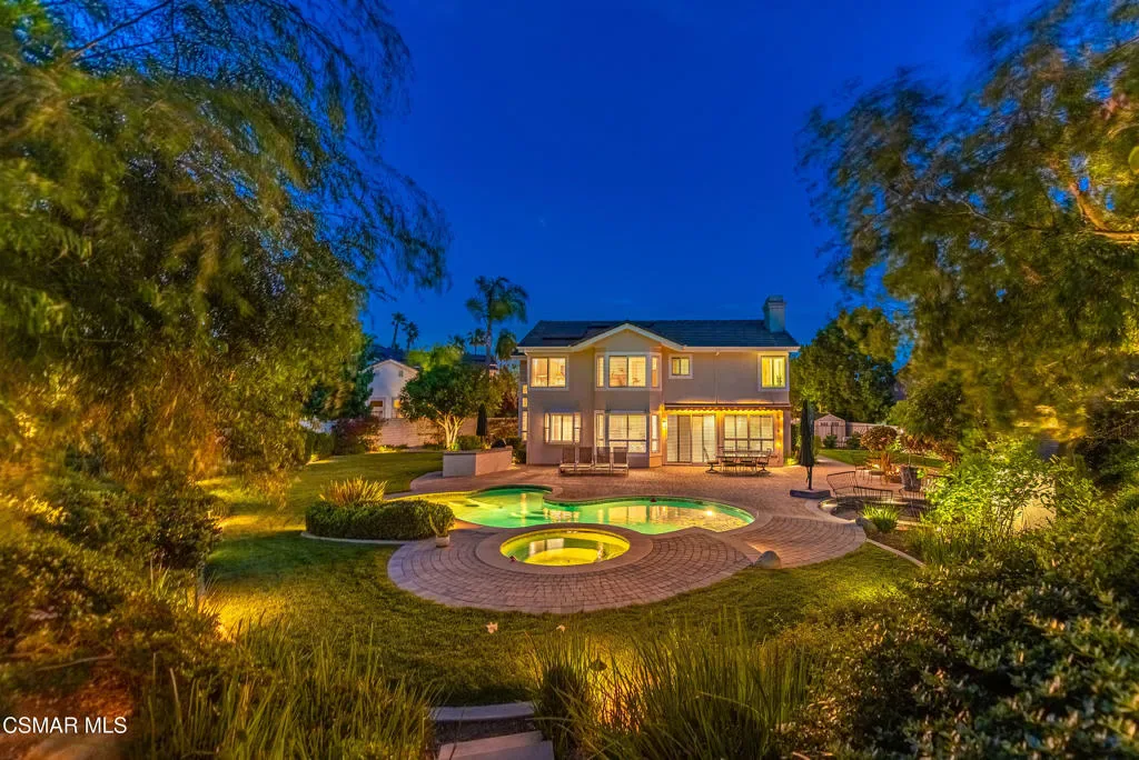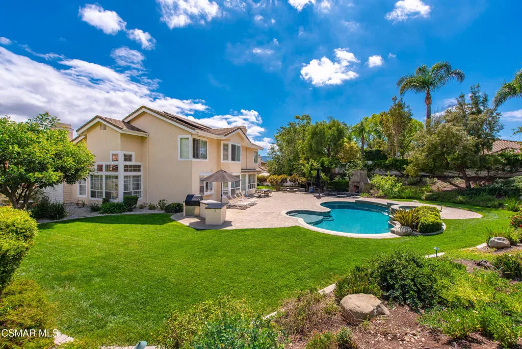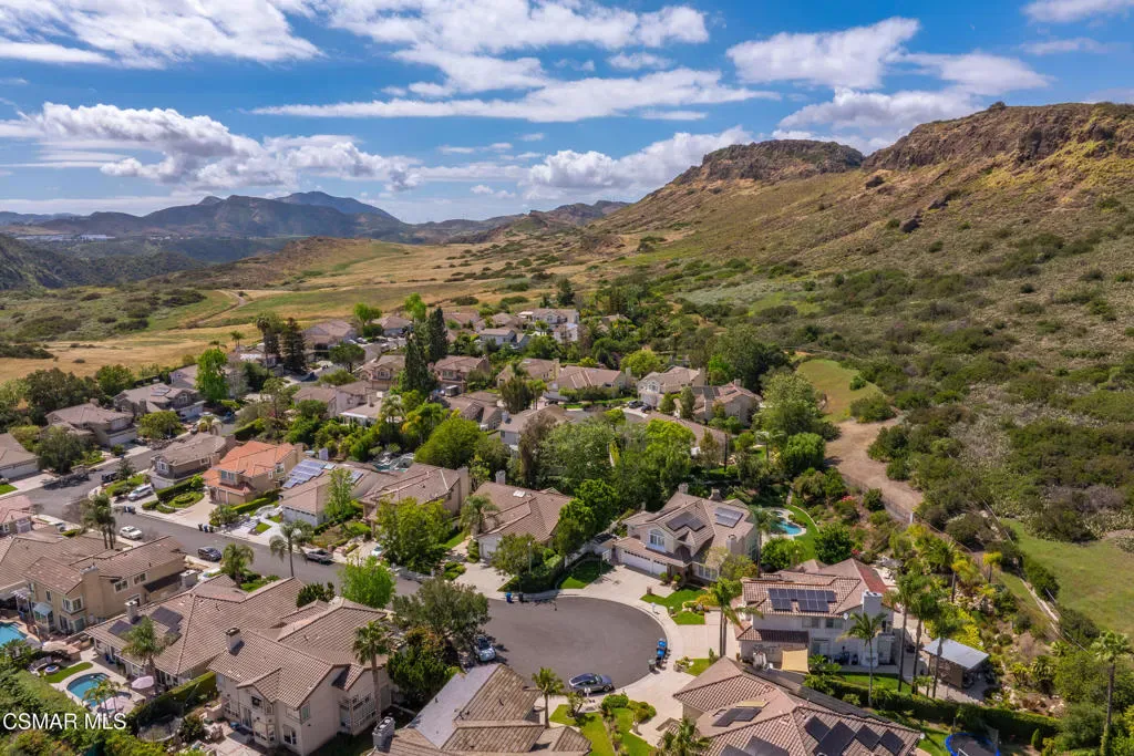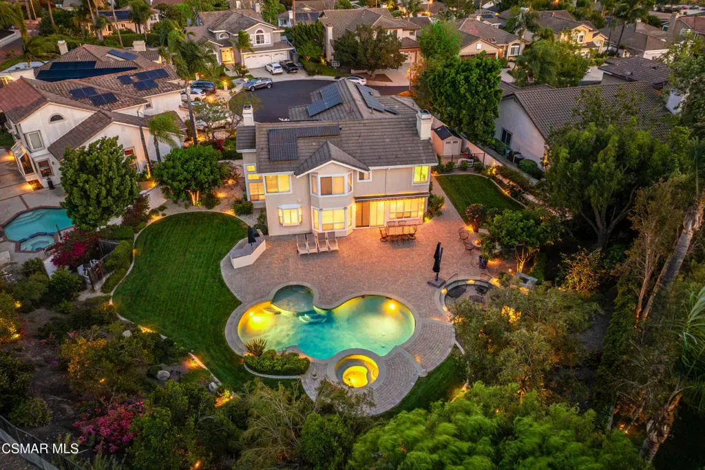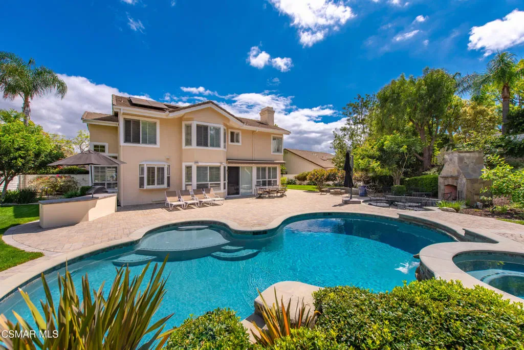 Now available in the highly sought-after Wildwood neighborhood of Thousand Oaks, this unique home is ideally located on a quiet cul-de-sac and set on a large pie-shaped lot with incredible privacy and sweeping views of the surrounding landscape. Designed for both comfortable living and exceptional entertaining, the backyard is a true retreat featuring a pool and spa, grassy area, BBQ space, outdoor dining area, built-in fireplace with seating, lounge areas, firepit, side yard, and more–all surrounded by lush landscaping and mature trees. Inside, the home offers a spacious and functional layout. The living room welcomes you with high ceilings and an abundance of natural light, flowing into a formal dining room. The kitchen is well-appointed with white cabinetry, stainless steel appliances, and a center island, opening to the family room with a fireplace and direct access to the backyard for seamless indoor-outdoor living. The main level also includes a versatile bedroom or office, a full bathroom, and a laundry room with side yard access and entry to the three-car garage featuring epoxied floors. Upstairs, a grand staircase leads to the expansive primary suite with high ceilings and a well-designed ensuite bathroom complete with dual vanity sinks, a large shower, separate soaking tub, and a spacious closet with dual access. Down the hall are two additional bedrooms and a full bathroom with dual vanities. An additional upstairs bonus space with high ceilings offers flexibility as a playroom, office, media room, or potential fourth bedroom. Additional highlights include solar panels, offering energy efficiency and long-term savings. Located just moments from Wildwood hiking trails and Wildwood schools, this is a rare opportunity to own a beautifully appointed home in one of Thousand Oaks’ most desirable communities.