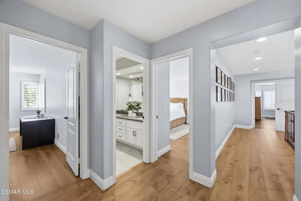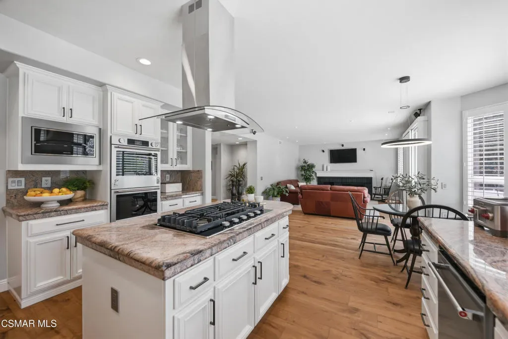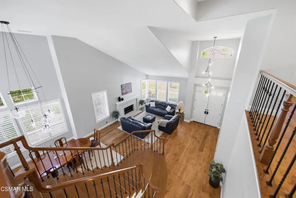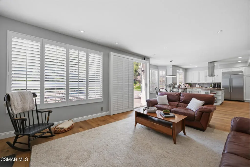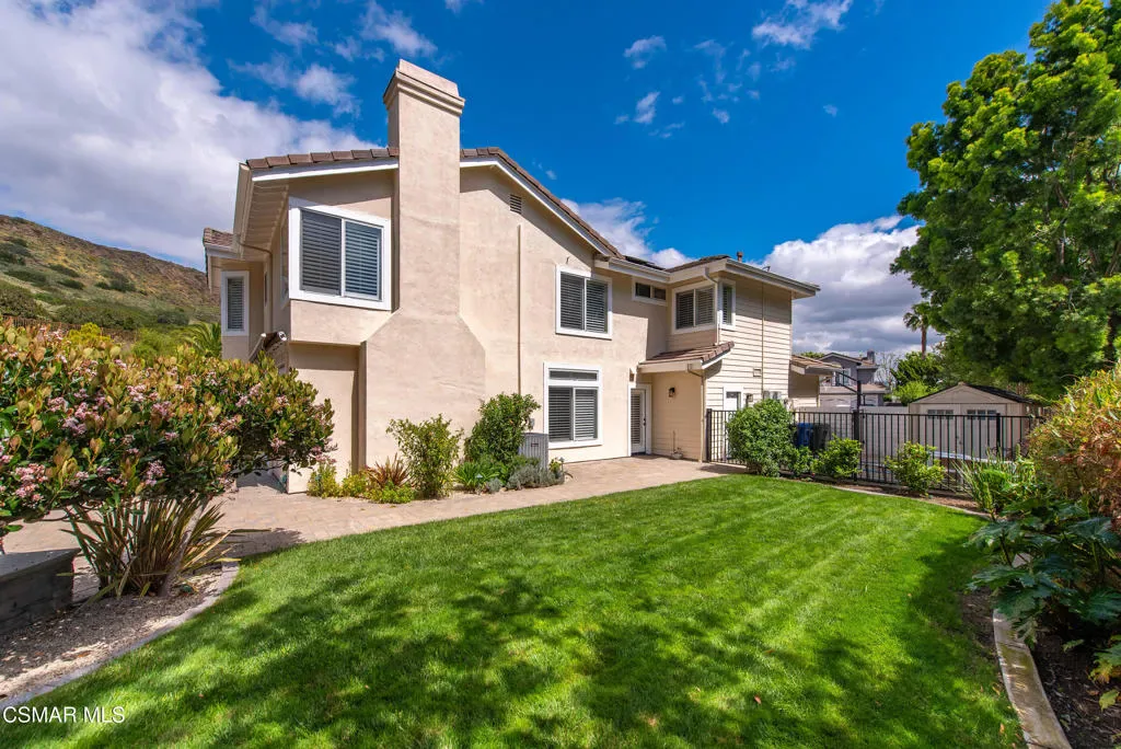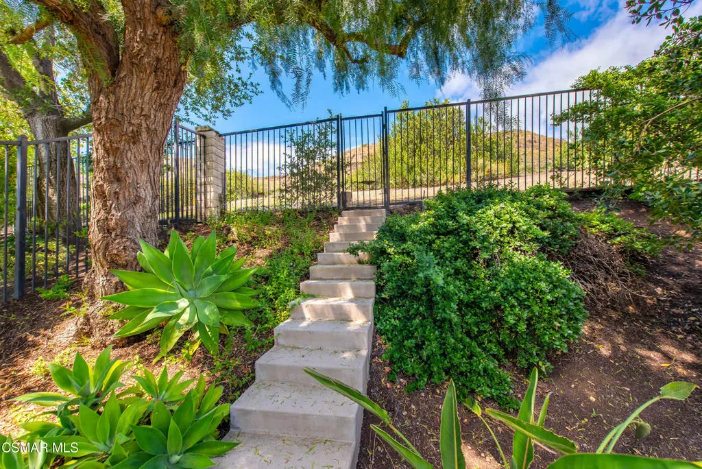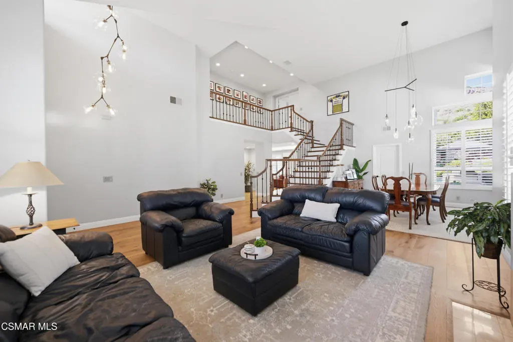 Now available in the highly sought-after Wildwood neighborhood of Thousand Oaks, this unique home is ideally located on a quiet cul-de-sac and set on a large pie-shaped lot with incredible privacy and sweeping views of the surrounding landscape. Designed for both comfortable living and exceptional entertaining, the backyard is a true retreat featuring a pool and spa, grassy area, BBQ space, outdoor dining area, built-in fireplace with seating, lounge areas, firepit, side yard, and more–all surrounded by lush landscaping and mature trees. Inside, the home offers a spacious and functional layout. The living room welcomes you with high ceilings and an abundance of natural light, flowing into a formal dining room. The kitchen is well-appointed with white cabinetry, stainless steel appliances, and a center island, opening to the family room with a fireplace and direct access to the backyard for seamless indoor-outdoor living. The main level also includes a versatile bedroom or office, a full bathroom, and a laundry room with side yard access and entry to the three-car garage featuring epoxied floors. Upstairs, a grand staircase leads to the expansive primary suite with high ceilings and a well-designed ensuite bathroom complete with dual vanity sinks, a large shower, separate soaking tub, and a spacious closet with dual access. Down the hall are two additional bedrooms and a full bathroom with dual vanities. An additional upstairs bonus space with high ceilings offers flexibility as a playroom, office, media room, or potential fourth bedroom. Additional highlights include solar panels, offering energy efficiency and long-term savings. Located just moments from Wildwood hiking trails and Wildwood schools, this is a rare opportunity to own a beautifully appointed home in one of Thousand Oaks’ most desirable communities.