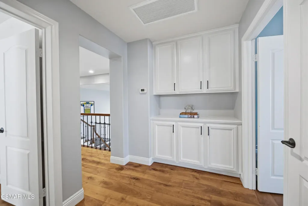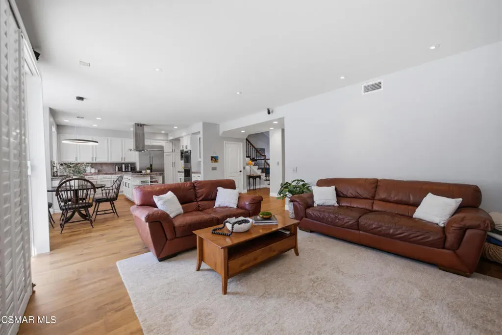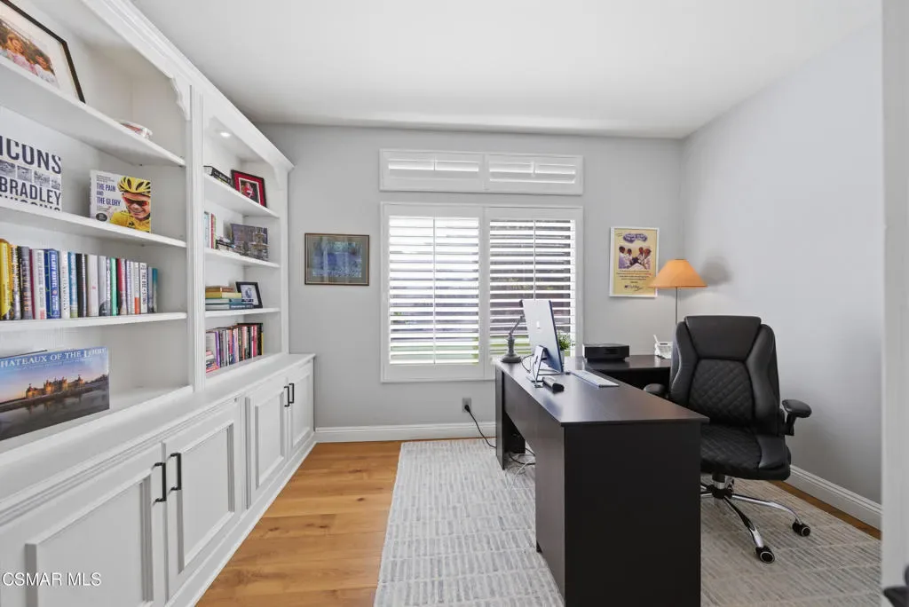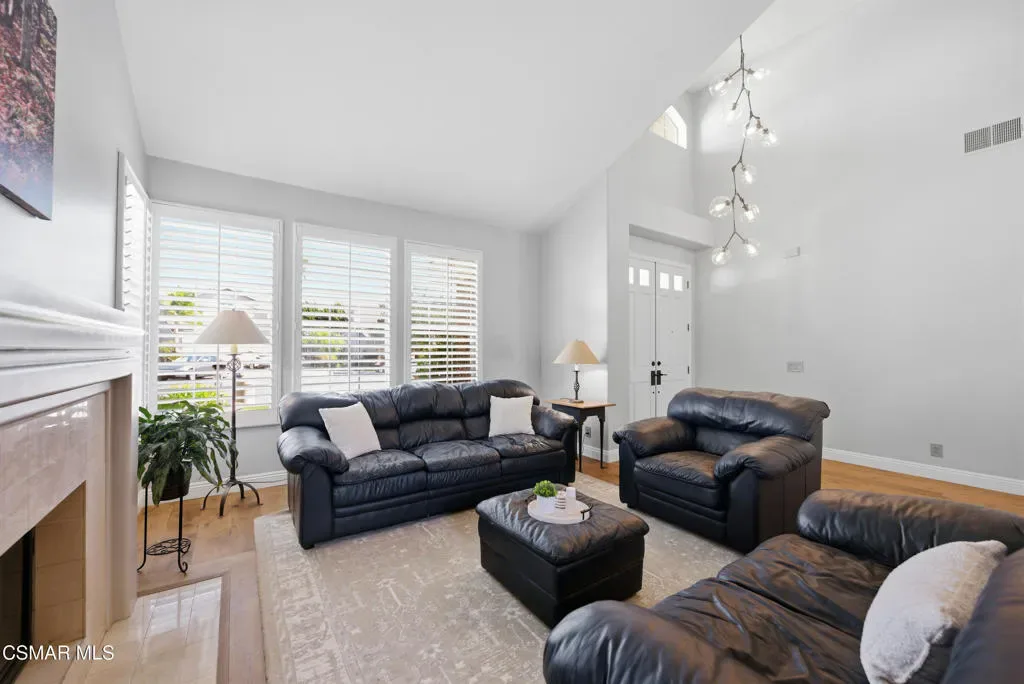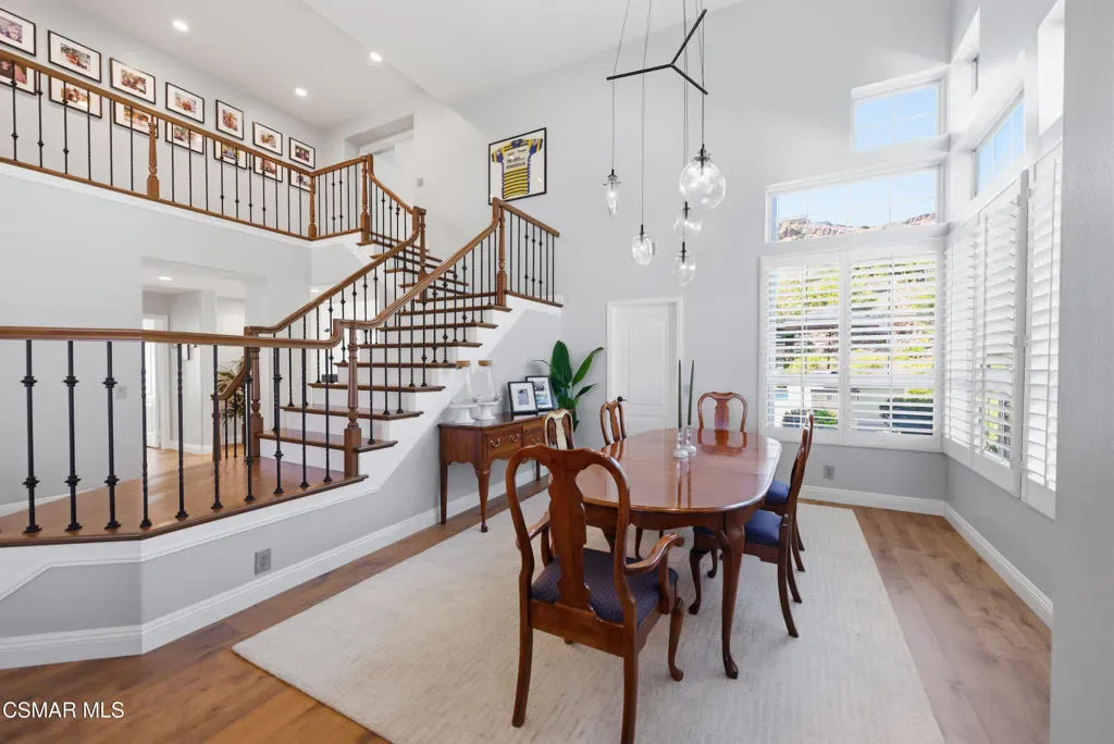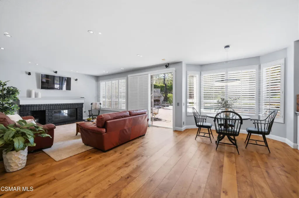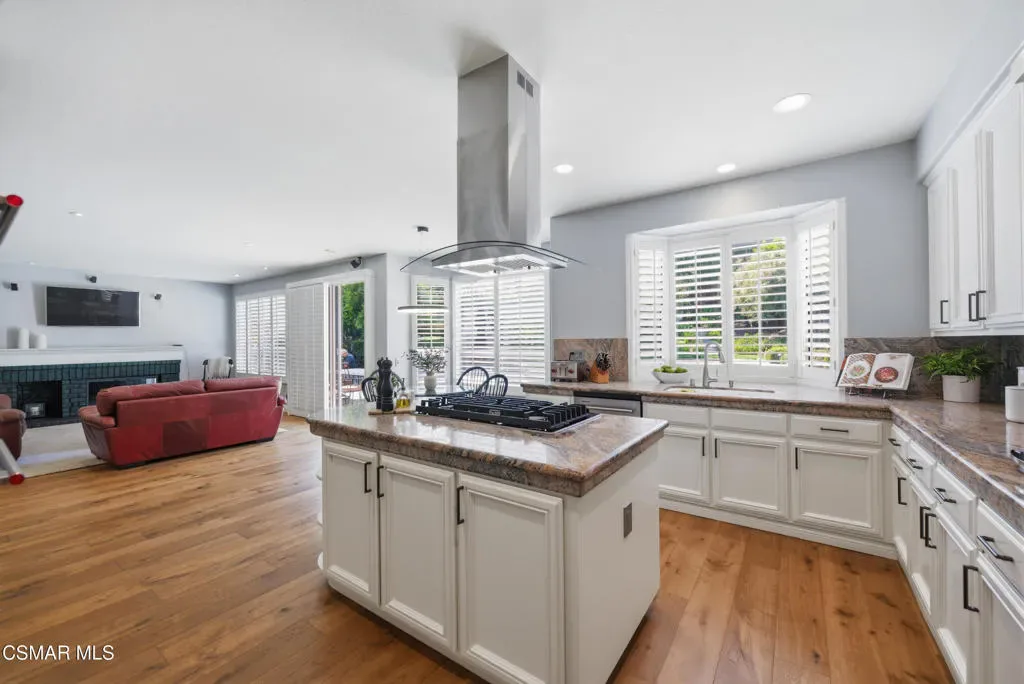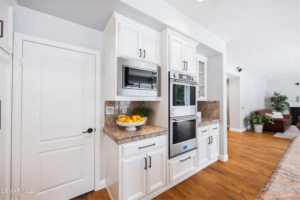 Now available in the highly sought-after Wildwood neighborhood of Thousand Oaks, this unique home is ideally located on a quiet cul-de-sac and set on a large pie-shaped lot with incredible privacy and sweeping views of the surrounding landscape. Designed for both comfortable living and exceptional entertaining, the backyard is a true retreat featuring a pool and spa, grassy area, BBQ space, outdoor dining area, built-in fireplace with seating, lounge areas, firepit, side yard, and more–all surrounded by lush landscaping and mature trees. Inside, the home offers a spacious and functional layout. The living room welcomes you with high ceilings and an abundance of natural light, flowing into a formal dining room. The kitchen is well-appointed with white cabinetry, stainless steel appliances, and a center island, opening to the family room with a fireplace and direct access to the backyard for seamless indoor-outdoor living. The main level also includes a versatile bedroom or office, a full bathroom, and a laundry room with side yard access and entry to the three-car garage featuring epoxied floors. Upstairs, a grand staircase leads to the expansive primary suite with high ceilings and a well-designed ensuite bathroom complete with dual vanity sinks, a large shower, separate soaking tub, and a spacious closet with dual access. Down the hall are two additional bedrooms and a full bathroom with dual vanities. An additional upstairs bonus space with high ceilings offers flexibility as a playroom, office, media room, or potential fourth bedroom. Additional highlights include solar panels, offering energy efficiency and long-term savings. Located just moments from Wildwood hiking trails and Wildwood schools, this is a rare opportunity to own a beautifully appointed home in one of Thousand Oaks’ most desirable communities.