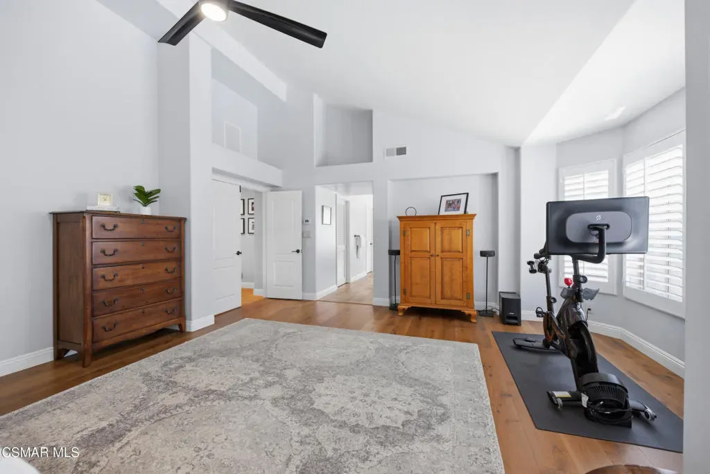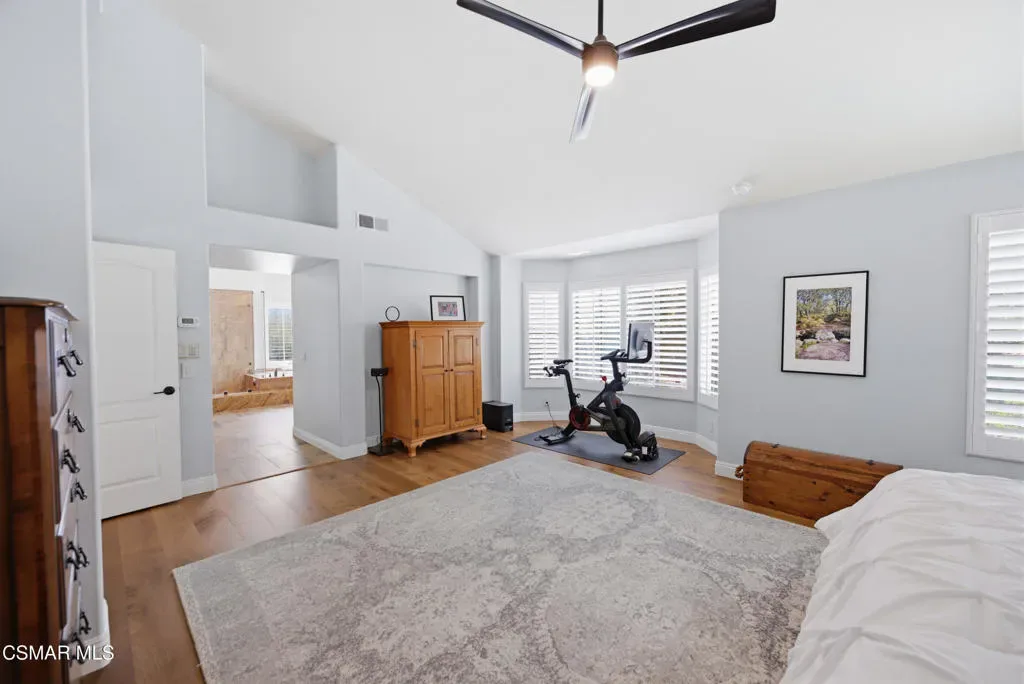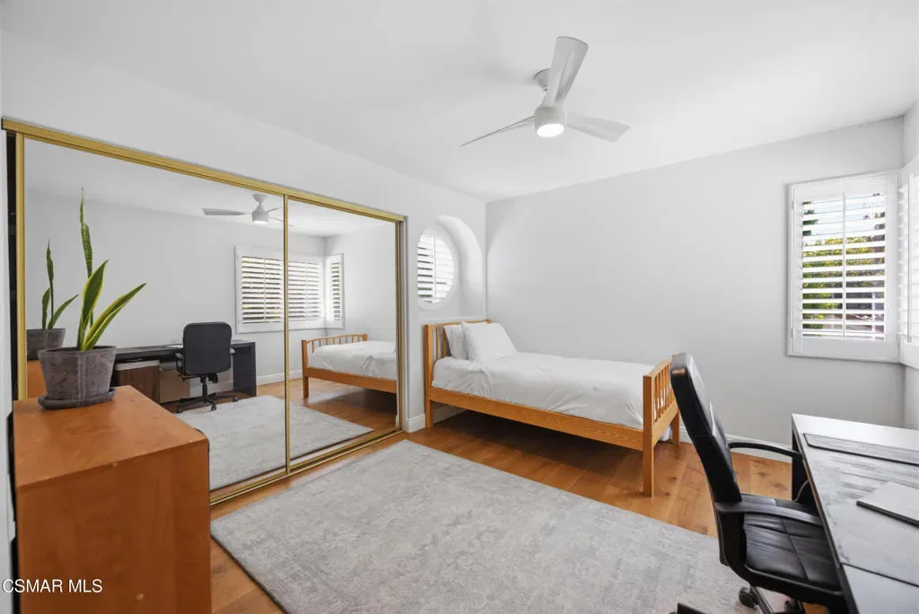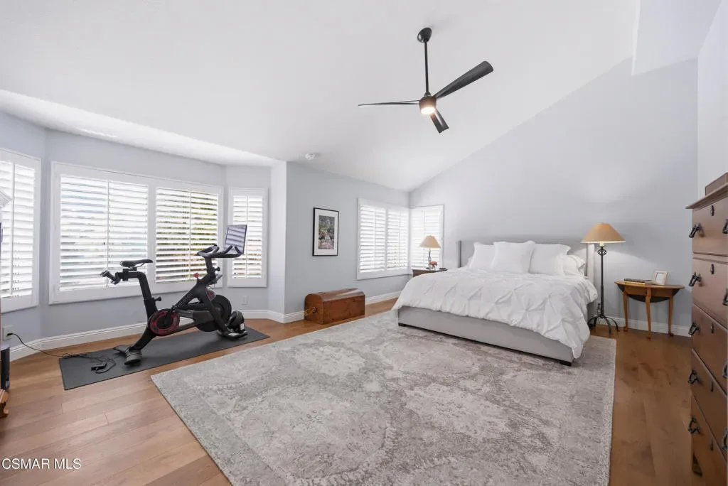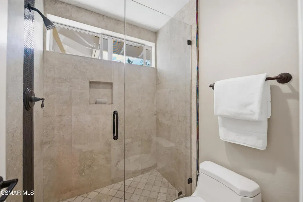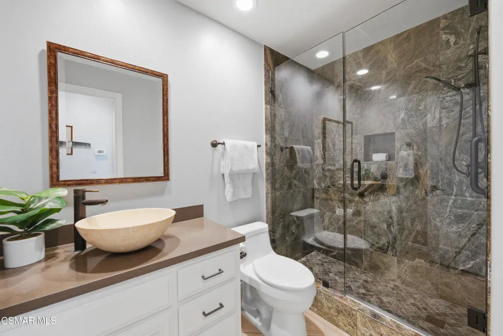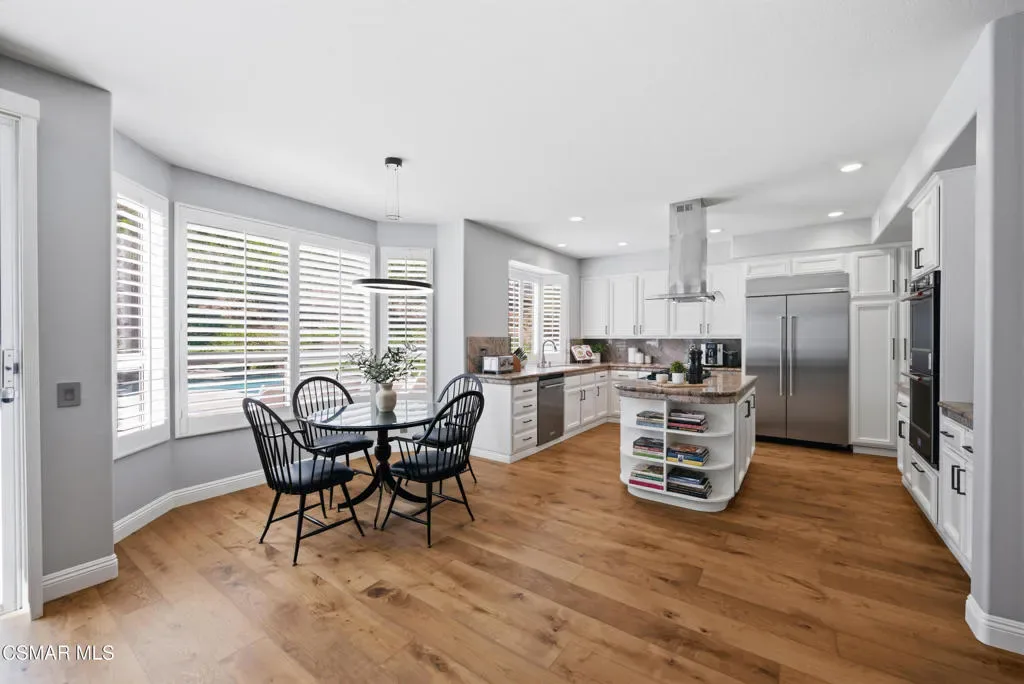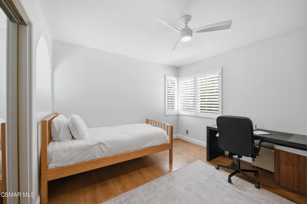 Now available in the highly sought-after Wildwood neighborhood of Thousand Oaks, this unique home is ideally located on a quiet cul-de-sac and set on a large pie-shaped lot with incredible privacy and sweeping views of the surrounding landscape. Designed for both comfortable living and exceptional entertaining, the backyard is a true retreat featuring a pool and spa, grassy area, BBQ space, outdoor dining area, built-in fireplace with seating, lounge areas, firepit, side yard, and more–all surrounded by lush landscaping and mature trees. Inside, the home offers a spacious and functional layout. The living room welcomes you with high ceilings and an abundance of natural light, flowing into a formal dining room. The kitchen is well-appointed with white cabinetry, stainless steel appliances, and a center island, opening to the family room with a fireplace and direct access to the backyard for seamless indoor-outdoor living. The main level also includes a versatile bedroom or office, a full bathroom, and a laundry room with side yard access and entry to the three-car garage featuring epoxied floors. Upstairs, a grand staircase leads to the expansive primary suite with high ceilings and a well-designed ensuite bathroom complete with dual vanity sinks, a large shower, separate soaking tub, and a spacious closet with dual access. Down the hall are two additional bedrooms and a full bathroom with dual vanities. An additional upstairs bonus space with high ceilings offers flexibility as a playroom, office, media room, or potential fourth bedroom. Additional highlights include solar panels, offering energy efficiency and long-term savings. Located just moments from Wildwood hiking trails and Wildwood schools, this is a rare opportunity to own a beautifully appointed home in one of Thousand Oaks’ most desirable communities.