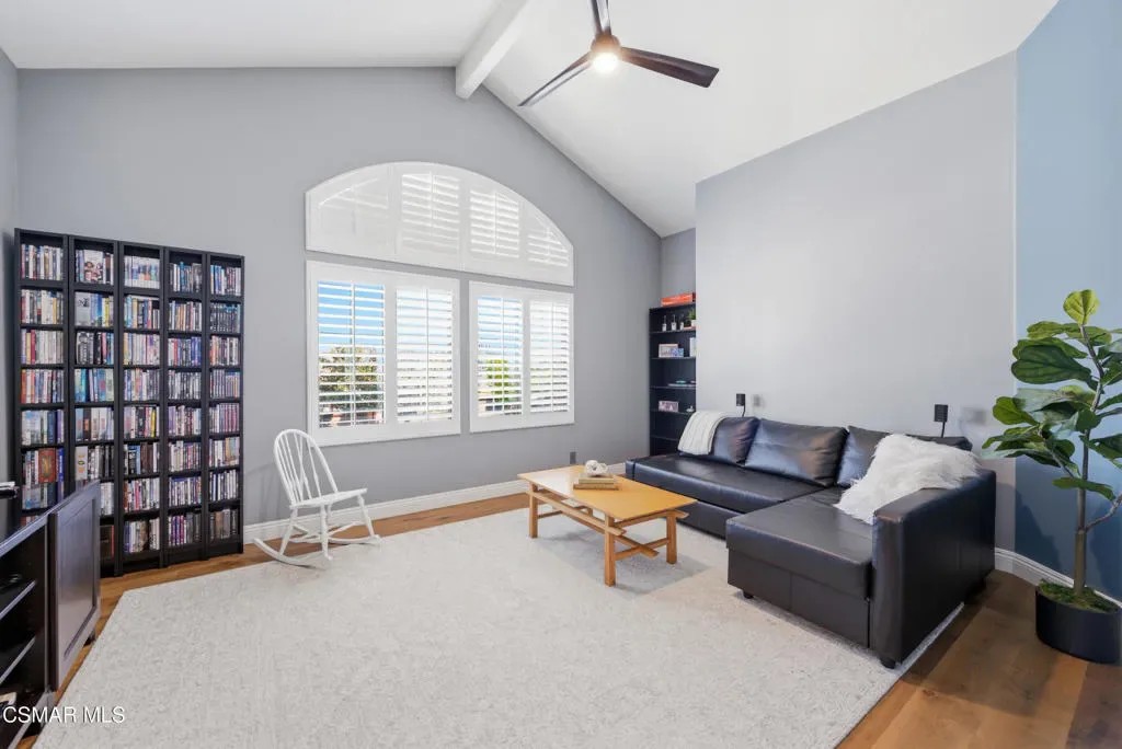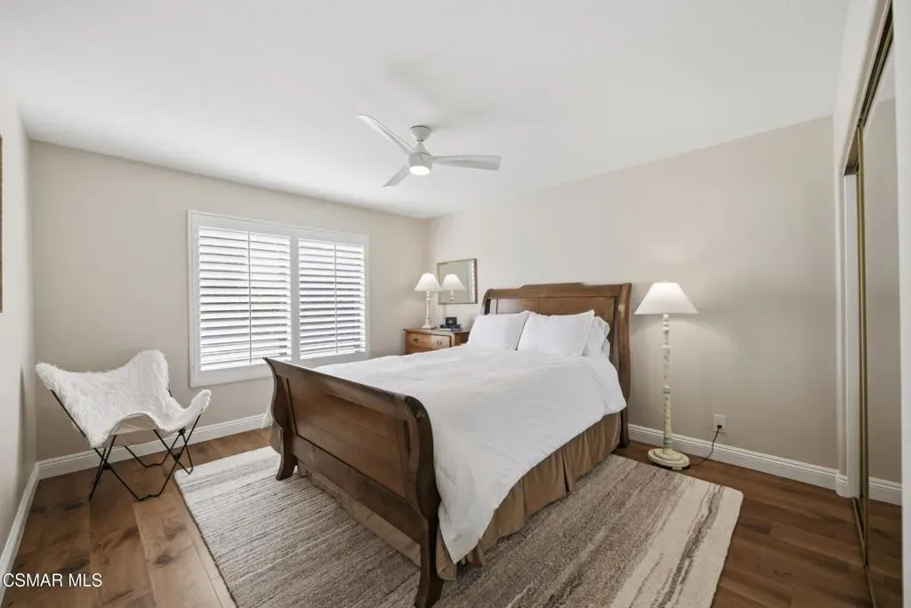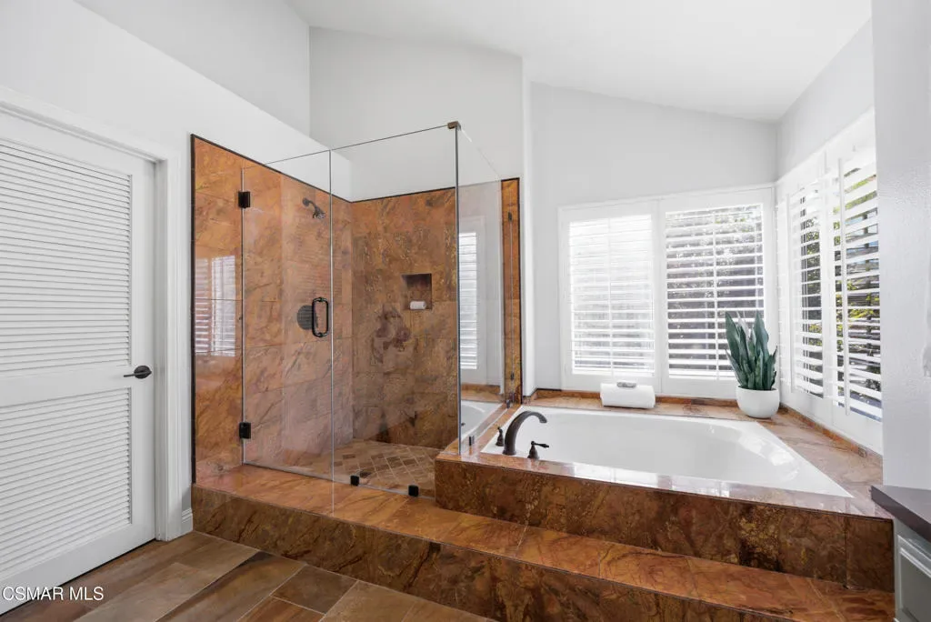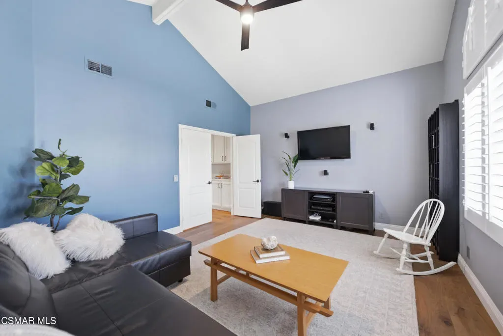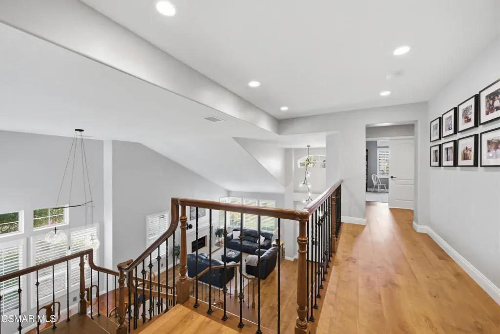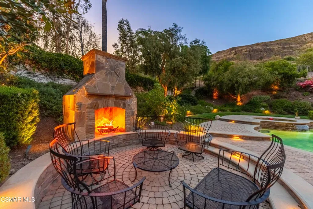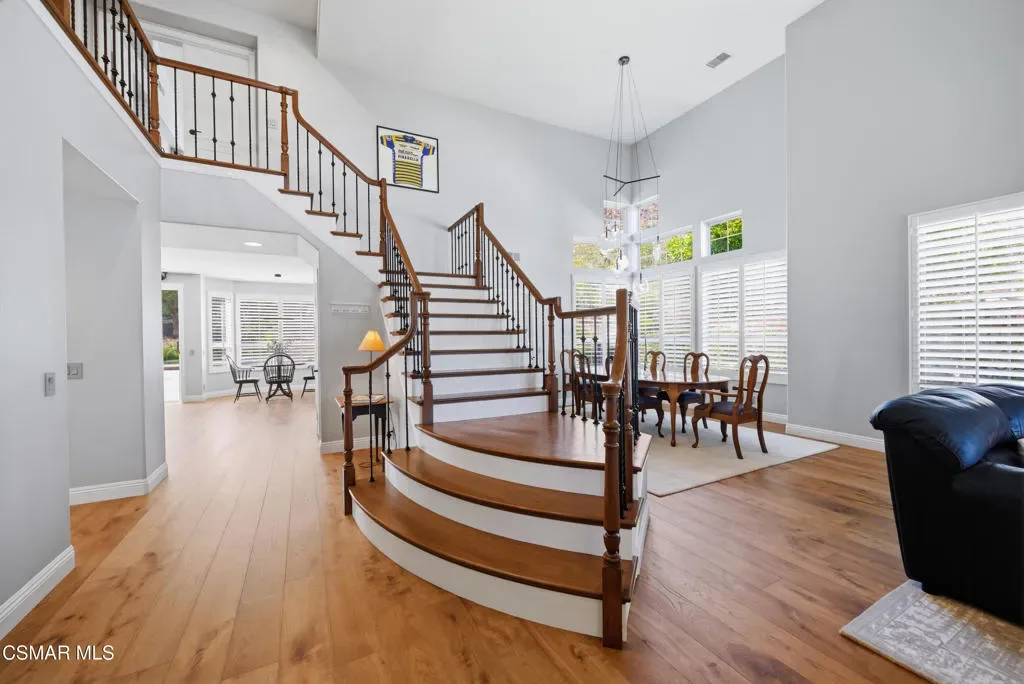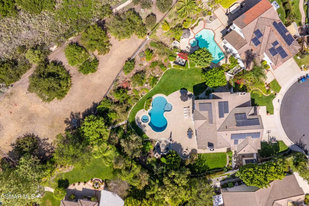 Now available in the highly sought-after Wildwood neighborhood of Thousand Oaks, this unique home is ideally located on a quiet cul-de-sac and set on a large pie-shaped lot with incredible privacy and sweeping views of the surrounding landscape. Designed for both comfortable living and exceptional entertaining, the backyard is a true retreat featuring a pool and spa, grassy area, BBQ space, outdoor dining area, built-in fireplace with seating, lounge areas, firepit, side yard, and more–all surrounded by lush landscaping and mature trees. Inside, the home offers a spacious and functional layout. The living room welcomes you with high ceilings and an abundance of natural light, flowing into a formal dining room. The kitchen is well-appointed with white cabinetry, stainless steel appliances, and a center island, opening to the family room with a fireplace and direct access to the backyard for seamless indoor-outdoor living. The main level also includes a versatile bedroom or office, a full bathroom, and a laundry room with side yard access and entry to the three-car garage featuring epoxied floors. Upstairs, a grand staircase leads to the expansive primary suite with high ceilings and a well-designed ensuite bathroom complete with dual vanity sinks, a large shower, separate soaking tub, and a spacious closet with dual access. Down the hall are two additional bedrooms and a full bathroom with dual vanities. An additional upstairs bonus space with high ceilings offers flexibility as a playroom, office, media room, or potential fourth bedroom. Additional highlights include leased solar panels, offering energy efficiency and long-term savings and a three-zone HVAC unit. Located just moments from Wildwood hiking trails and Wildwood schools, this is a rare opportunity to own a beautifully appointed home in one of Thousand Oaks’ most desirable communities.