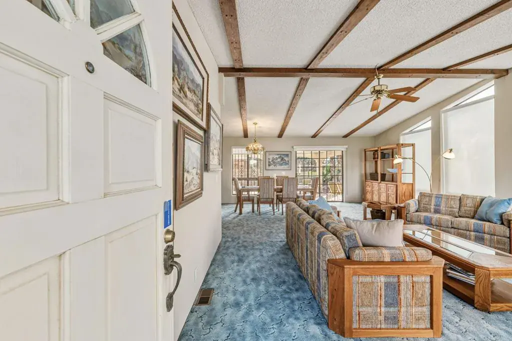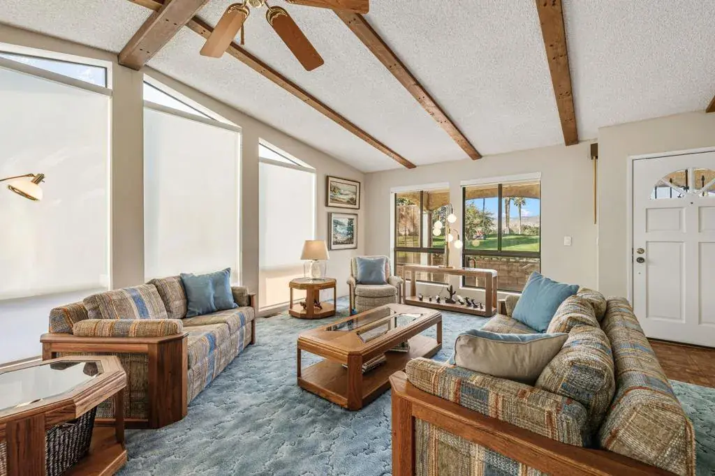 Welcome to this spacious 1,792 sq ft manufactured home situated on owned land at the end of a quiet cul-de-sac, offering exceptional privacy with only one neighboring home. Featuring stucco exterior, durable tile roof and permanent foundation. Perfectly positioned along the Ivey Ranch Golf Course, the property boasts sweeping views of the 1st and 9th fairways, with stunning mountain views to the north and west. Inside, this 2-bedroom, 2-bath home features a layout designed for both comfort and entertaining. The formal living and dining areas showcase vaulted beamed ceilings and floor-to-ceiling picture windows, filling the space with natural light and framing the scenic surroundings. The generous primary suite includes a double-vanity bathroom, for added convenience, and a custom walk-in closet. The spacious kitchen offers a peninsula for extra prep space, or casual dining, and opens to a cozy family room–ideal for hosting or relaxing. Outdoor living is a standout feature with two covered patios, perfect for year-round enjoyment. The detached 2-car garage includes an additional enclosed room that can serve as a potential third bedroom, den, home office, or creative studio. Additional conveniences include a separate indoor laundry and mud room. Security shutters/bars on the windows provide peace of mind for seasonal residents, making this a great home for wintering ”snowbirds”. Updates include new HVAC system (2023), low maintenance desert landscaping, exterior /interior painting, removal of popcorn ceilings in bedrooms, and family room, custom walk-in closet. Located in a desirable gated community, residents enjoy resort-style amenities including a 9-hole golf course, driving range, golf shop, restaurant, four community pools, two spas, pickleball and tennis courts. This home offers the ideal blend of space, views, privacy, and an active lifestyle–don’t miss this unique opportunity!