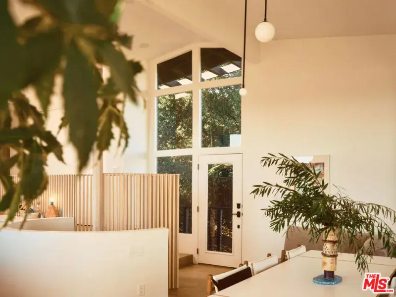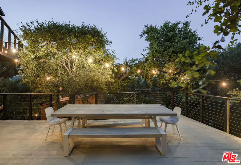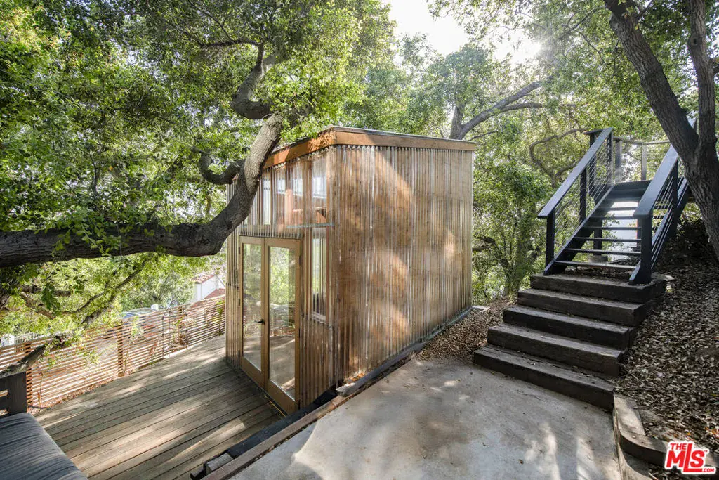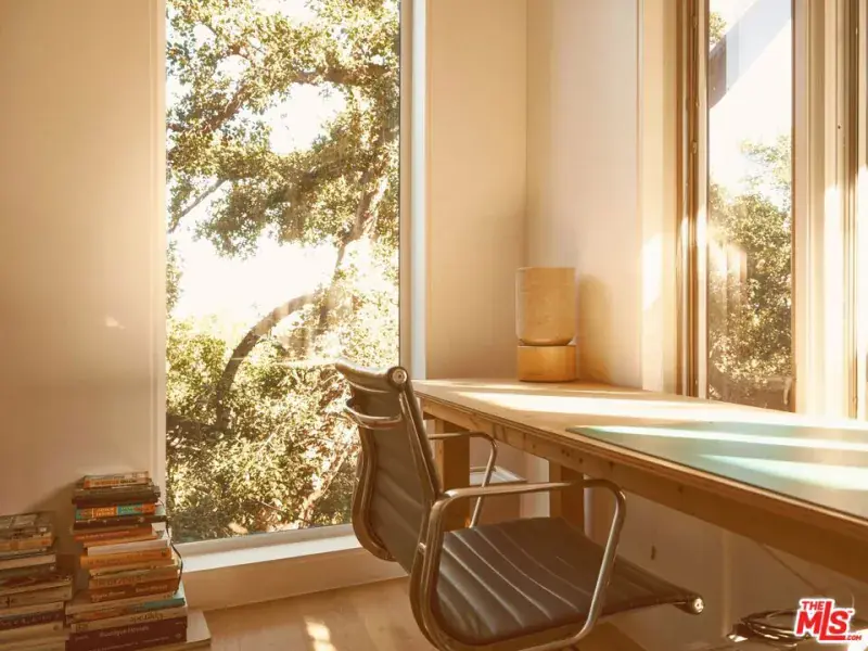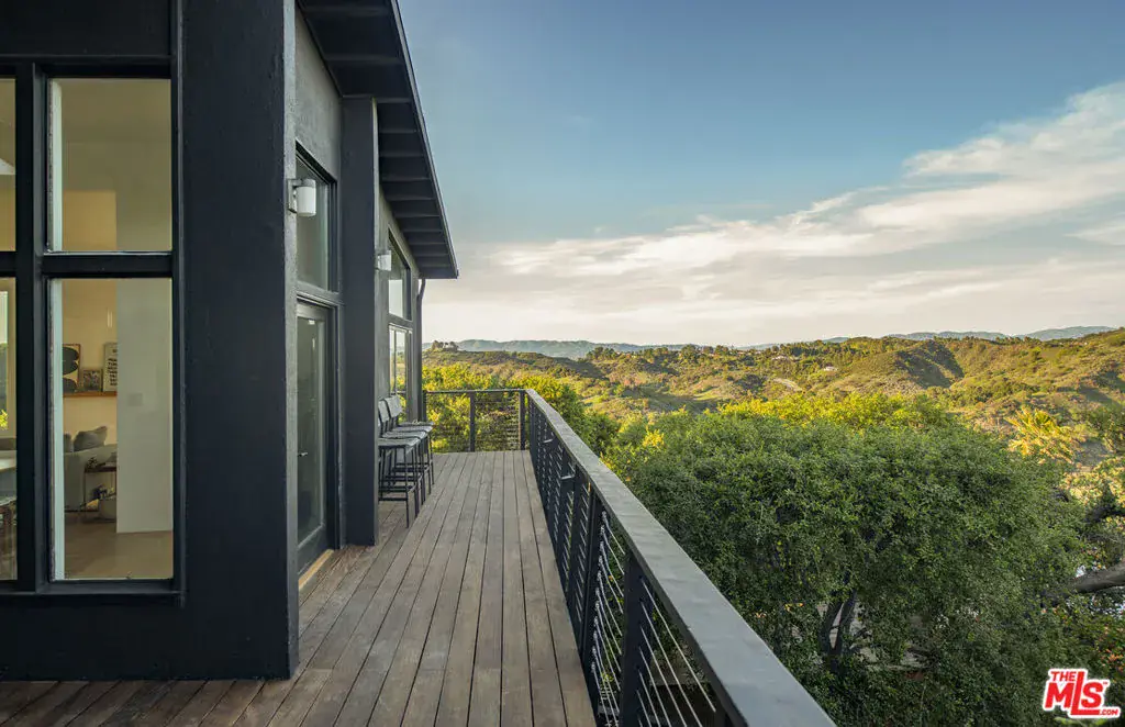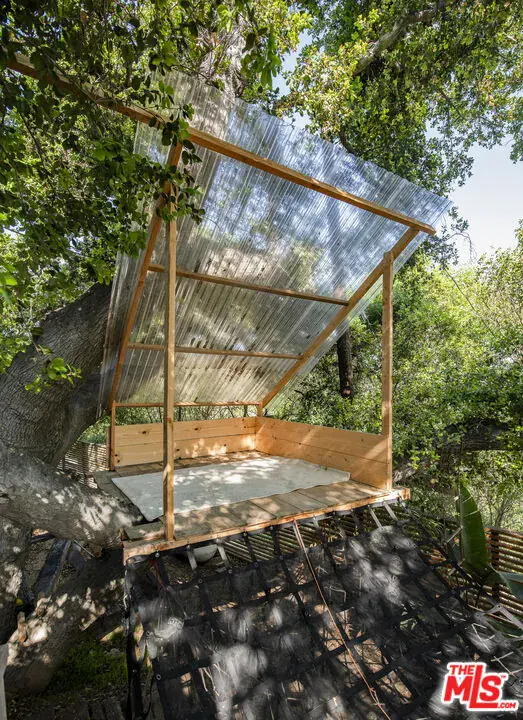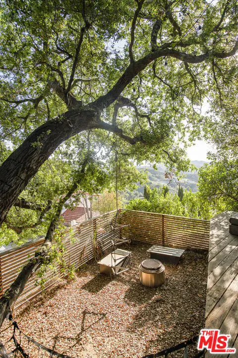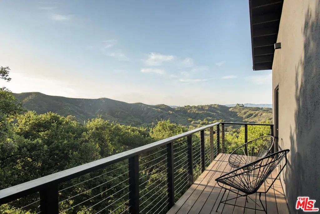 Cereza is an architecturally distinctive Topanga retreat and a true creative sanctuary. Blending rustic nature and design minimalism, the home is filled with shifting natural light from morning through dusk, creating a warm, organic atmosphere throughout. Offering breathtaking, unobstructed views, this pristine 4-bedroom, 3-bath residence is a rare opportunity to live on the coveted ridgeline that merges Topanga’s creative spirit with the modern luxury of Calabasas. A sculptural staircase anchors the home, serving as a striking architectural moment that defines the space. The upper level features a chef’s kitchen with outdoor counter seating that opens seamlessly to an airy living room and dual panoramic balconies. A private one-bedroom suite on this level includes a retro fireplace and sweeping views that make sunrise and sunset their own unique ritual. Downstairs, a second suite and two additional bedrooms connect directly to an expansive deck surrounded by lush landscaping and a tranquil Japanese soaking tub. Multiple outdoor lounge areas are positioned to take full advantage of the canyon setting ideal for entertaining, reflecting, or simply being present in nature. A detached cabin studio provides additional privacy and flexibility, complete with a built-in work area and loft bed for a guest. A dedicated yoga platform and suspension net allow you to float amongst the oaks, creating calm and connection with nature. Completing the property, a two-car garage currently serving as a ceramic studio and Hi-Fi movie lounge with adjoining gym adds versatility to this thoughtfully designed residence. Where design, nature, and intention converge. Welcome to Cereza.
