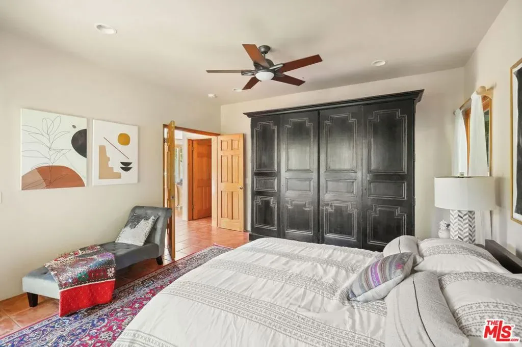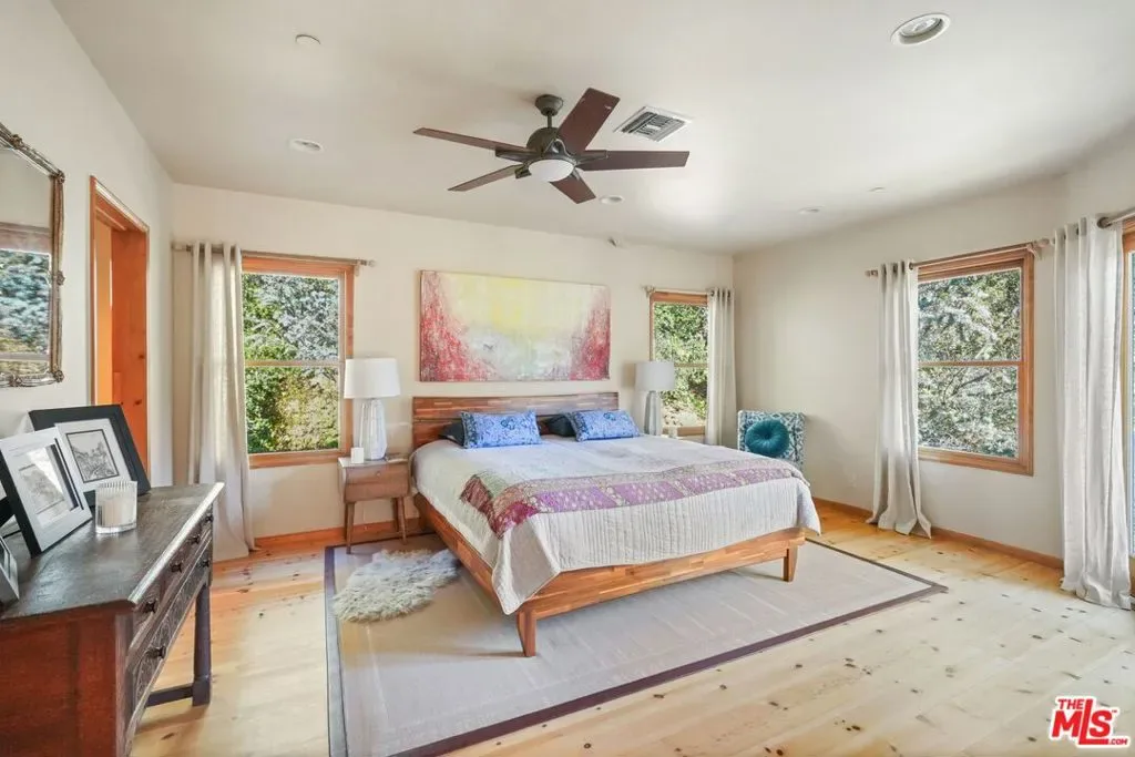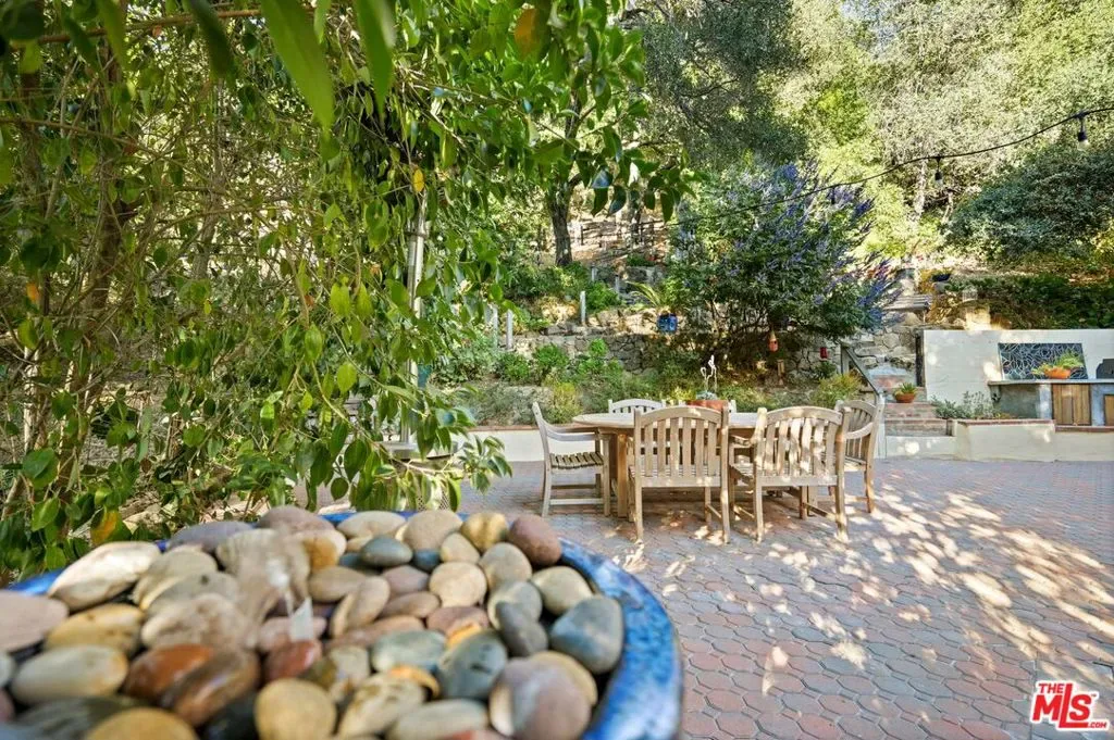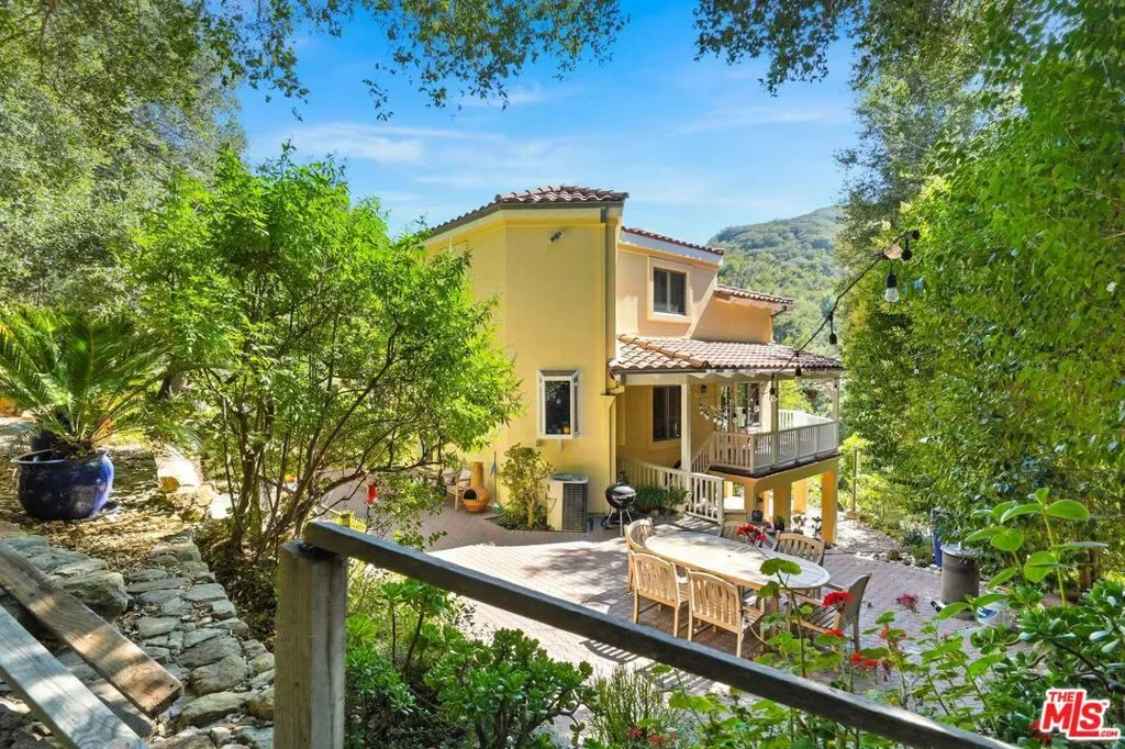 Casa Cielo: A Stunning Retreat tucked into the gentle folds of Old Topanga Canyon, where the hills rise softly into the sky and ancient oaks sway in rhythm with the breeze, Casa Cielo is more than a home, it is a canyon dream, rooted in beauty, vision, and possibility. Up a long driveway, spread across nearly an acre of private woodland, this modern Mediterranean sanctuary offers an exquisite residence, moments from Malibu, Calabasas, and the Pacific. Your paradise on a hill, with views all around, custom built in 2002, is an elegant expression of warmth and architectural grace. Light pours through French doors and skylights onto pine and ceramic tile floors, while a two-story stone fireplace warms the voluminous great room. A generous chef’s kitchen, with unique Picasso Green Granite countertops, walk-in pantry, and stainless appliances, opens seamlessly to an entertainer’s patio, where a built-in BBQ awaits long summer evenings under canyon skies. A burbling fountain and birdsong are the music to morning coffee, or to a gathering of loved ones on the flower-framed back patio. Upstairs, two airy bedrooms share a dreamy, French inspired, Jack-and-Jill bath adorned with a clawfoot tub and antique vanities. The primary suite opens to a private balcony with panoramic views, while an open loft with built-in shelving offers the perfect nook for a library, art studio, or meditation space. Downstairs, a spacious convertible den, with its own full bath and balcony, can easily serve as a third bedroom, office, or guest retreat. Panoramic views entice from a spacious upper deck, with covered side porch, and from a lower covered patio set in the garden. Thoughtfully appointed with central HVAC, a gray water recycling system, an automatic interior sprinkler system for enhanced safety and peace of mind, and a laundry chute to a generous laundry room, Casa Cielo blends timeless aesthetics with everyday comfort. The 2 car garage has a workshop area, and cable hookups in case one needs a hideaway more than parking for a second car! At the bottom of the driveway, a charming cottage studio, in a private yard, invites creativity, solitude, or guests. Here, in one of Southern California’s most protected and poetic enclaves, you’re invited to dwell, dream, and create. This is a place where artistry meets the earth, and where time slows to the rhythm of the canyon.