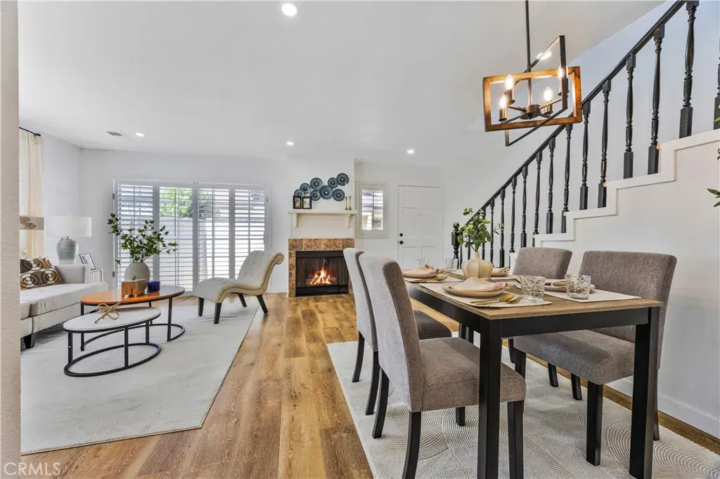designed living space, this home features a spacious layout with wood laminate and tile flooring on the main level. The inviting living room opens to a private patio