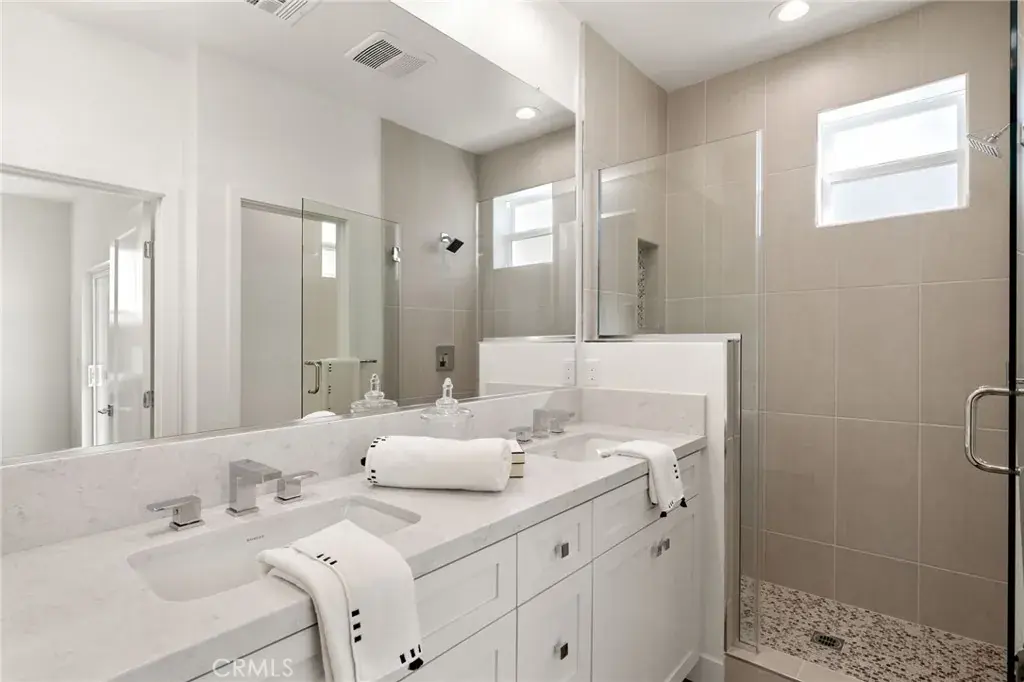 The kitchen features generous cabinet storage, a center island, and seamless flow into the main living space, ideal for everyday living and entertaining. The upper-level primary suite includes an ensuite bathroom, large walk-in closet, and a private balcony. The secondary bedroom is located on the entry level and includes an attached full bath, offering flexibility for a variety of living arrangements.