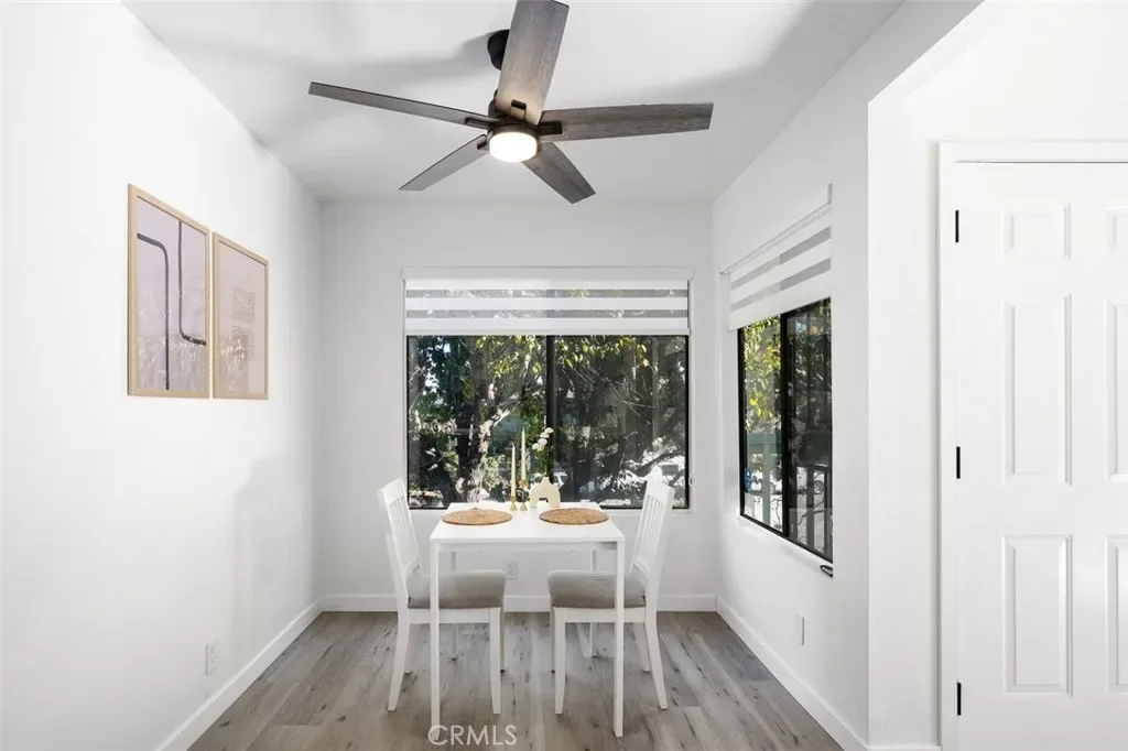 Newer luxury vinyl plank flooring runs throughout, paired with fresh interior paint in a modern, neutral palette. Energy-efficient LED lighting, updated vent covers and a dining area ceiling fan with remote control enhance comfort and functionality.