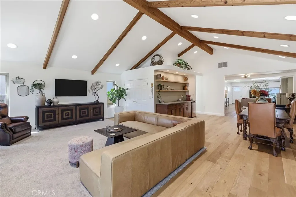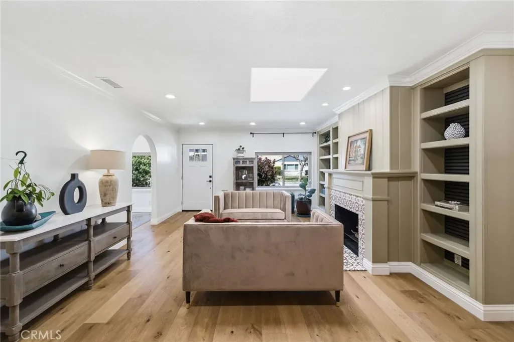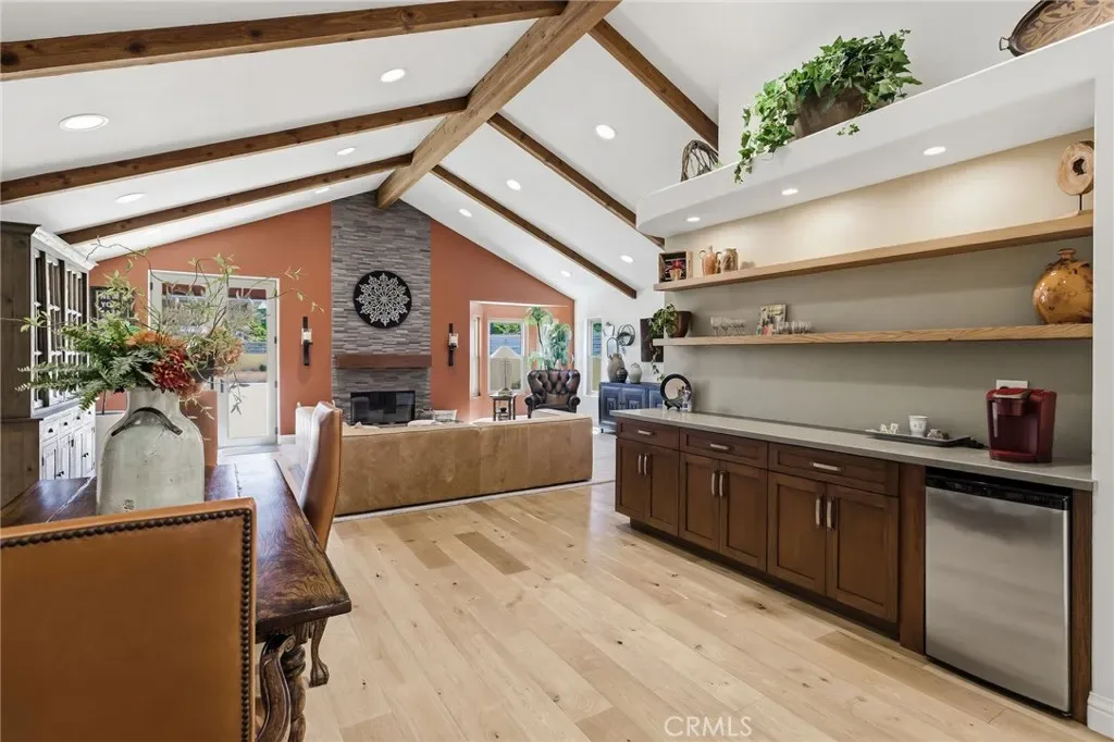 room – all on an unbelievable 8928 sq ft lot making for an entertainer’s delight – step into this wonderful home on white oak hardwood floors – the comfortable living room has a decorative tile fireplace to enjoy – the gorgeous remodeled kitchen with upscale stainless appliances, quartz counters, open shelving, recessed lighting, lots of white cabinets for the chef in the family, private primary bedroom with large walk in closet, high ceilings, skylight and a remodeled bath with a walk in shower – huge family room with soaring ceilings, carpet, gas burning fireplace, custom coffee bar with frig and more