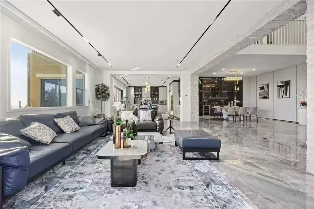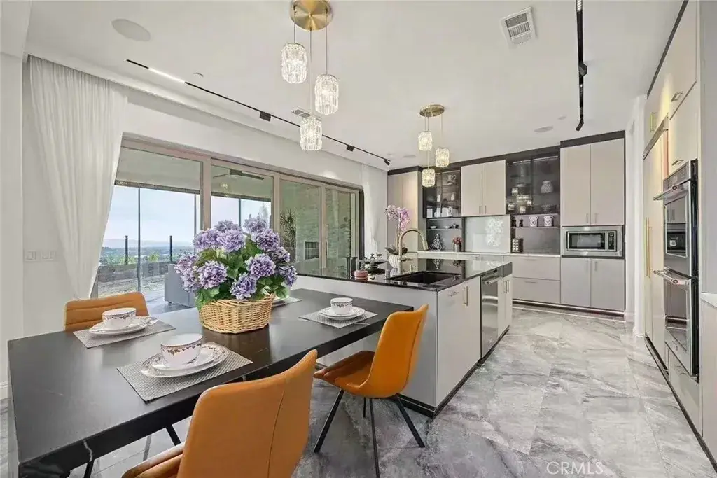 Presenting an extraordinary opportunity to own a breathtaking architectural masterpiece that redefines modern luxury. This newly constructed residence combines exceptional design with unparalleled craftsmanship, offering sweeping panoramic views that elevate the living experience. Nestled within the highly sought-after and secure gated community of Portola Hills, this home promises both privacy and exclusivity. Upon entering, you are welcomed by a grand, hotel-inspired central foyer adorned with upgraded marble flooring and custom exhibition cabinetry, all complemented by soaring double-height ceilings. The home’s thoughtful design includes a versatile downstairs bedroom and adjacent bathroom, ideal for guests or as a private home office.The chef’s kitchen is a culinary enthusiast’s dream, featuring premium cabinetry, stunning granite countertops, a spacious walk-in pantry, and a large center island. A second, fully-equipped kitchen further enhances the home’s entertaining potential, ensuring a seamless cooking experience for family and guests.Ascending the grand curved staircase, you are greeted by the opulent primary suite, which offers unrivaled views of the surrounding mountains and sunsets. The private balcony overlooks the enchanting City Lights Canyon and park vistas, providing the perfect setting for relaxation. The indulgent primary bath features a luxurious walk-in shower, a soaking tub, dual vanities, and two expansive walk-in closets, offering a spa-like retreat within the comfort of your own home. The California Room, an upgraded extension of the living space, serves as a light-filled sanctuary. With a cozy fireplace and four-panel sliding doors that open to the outdoors, this versatile room invites relaxation or elegant entertaining.