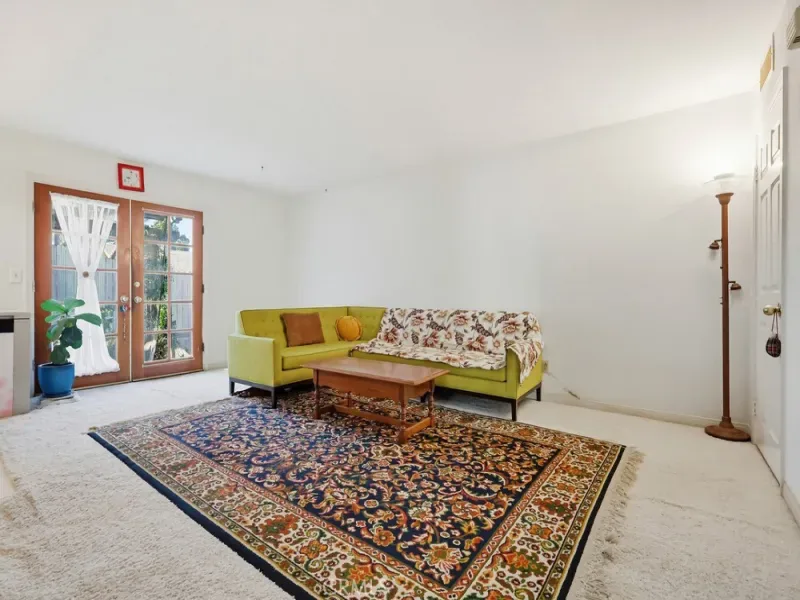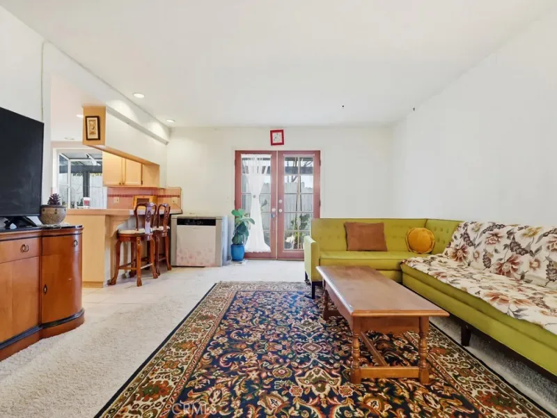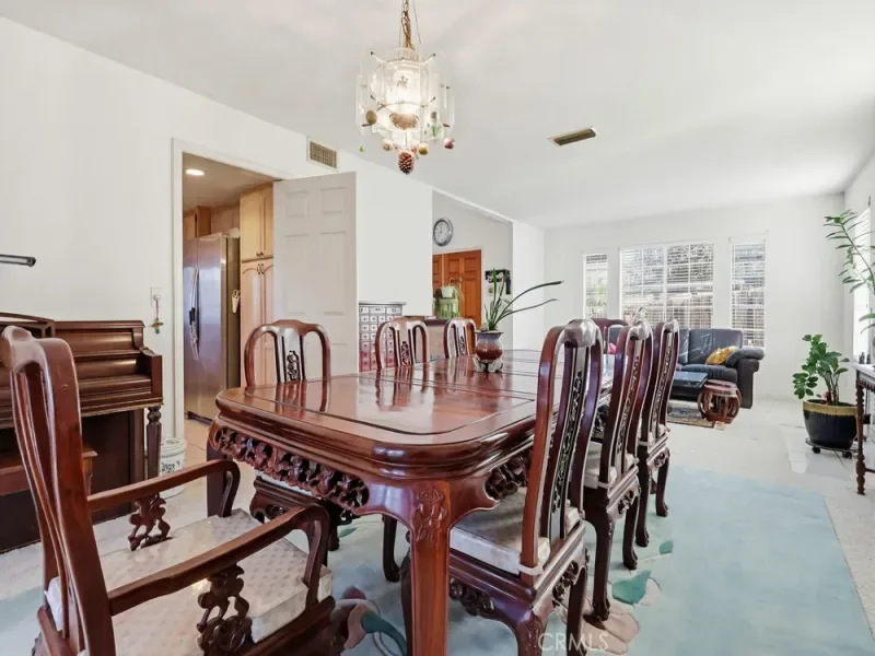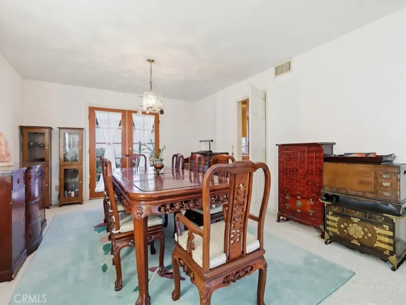 French doors from both the dining area and family room lead to a lush backyard garden filled with several fruit trees, flowers, and plants—an inviting outdoor space perfect for enjoying morning coffee or relaxing in nature.