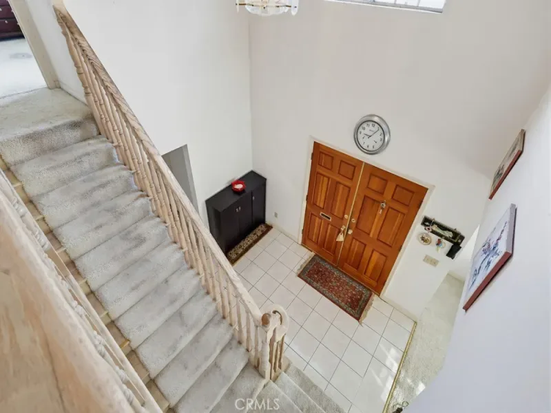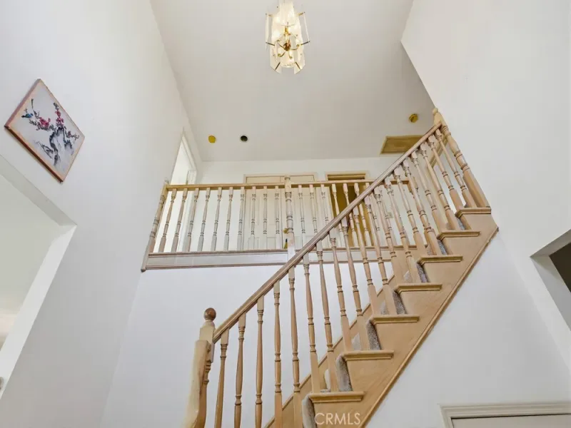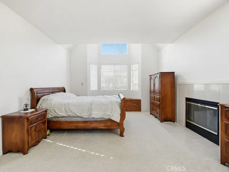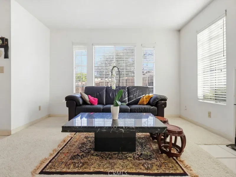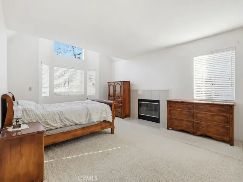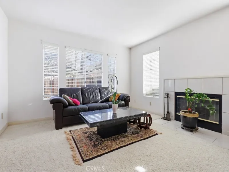 As you enter through the double doors, you are greeted by a dramatic high-ceilinged foyer that opens onto a bright, airy living room with a fireplace and an adjoining dining area. Numerous windows throughout the home bring in abundant natural light, creating a warm and inviting atmosphere.