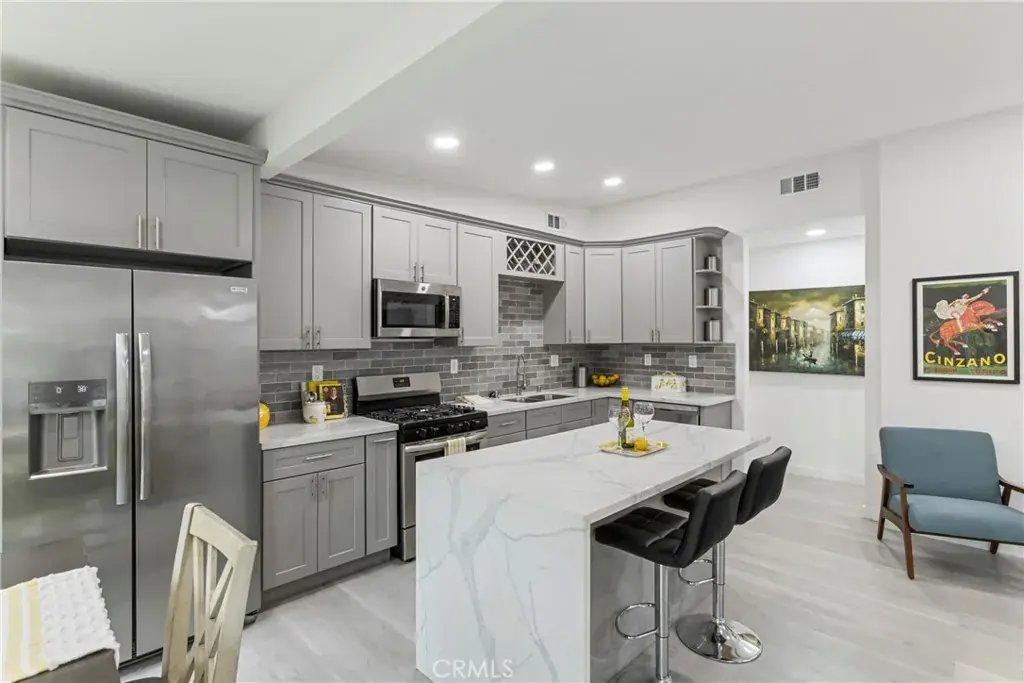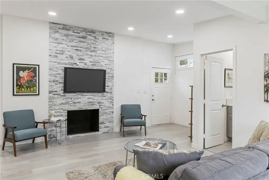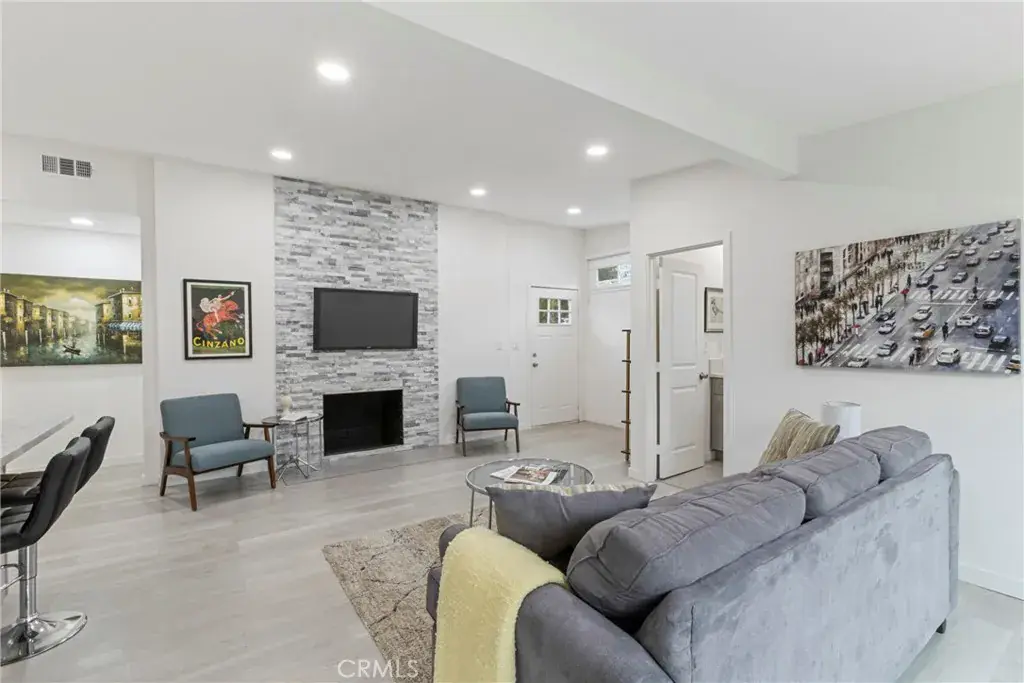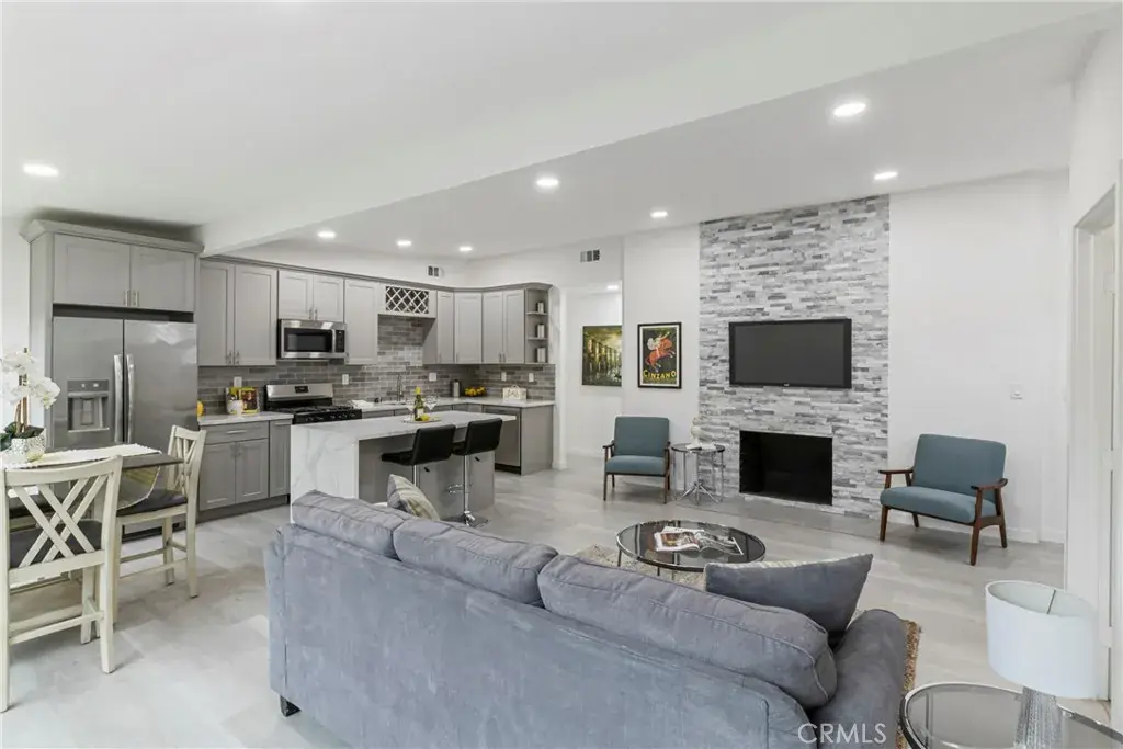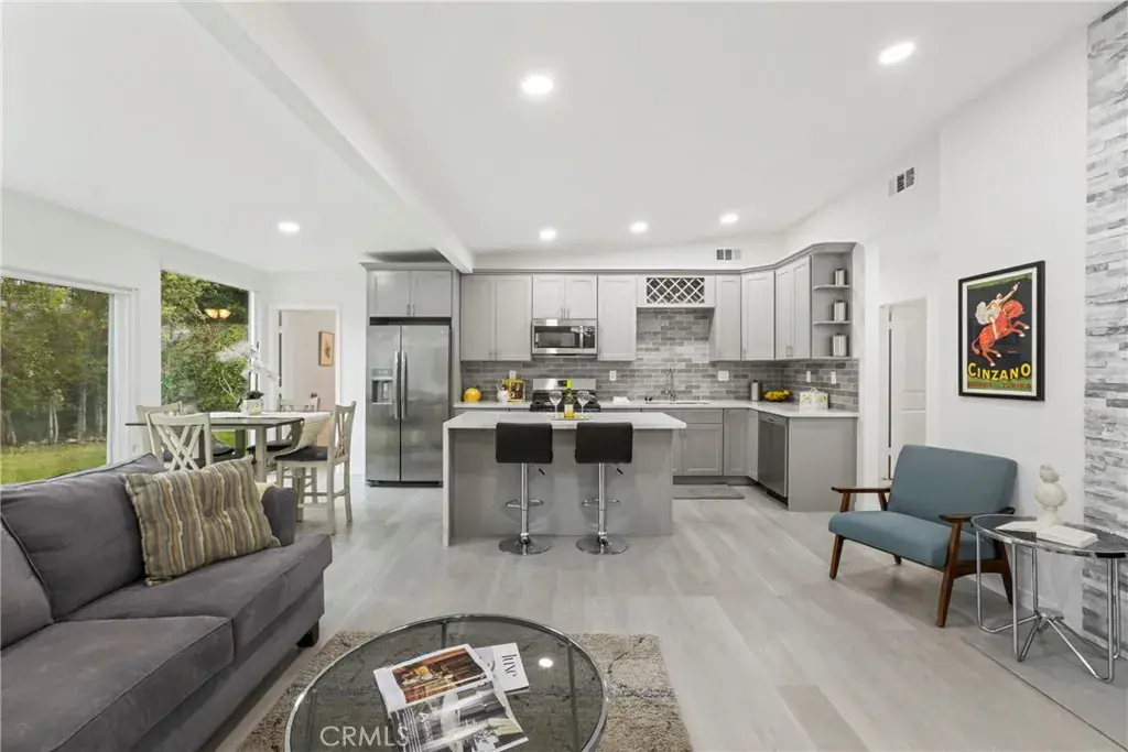 The open floor plan is filled with natural light and features a stylish living area that flows effortlessly into the kitchen, making it ideal for everyday living and entertaining. The kitchen showcases quartz countertops, contemporary cabinetry, and stainless steel appliances, creating a clean and inviting space to gather.