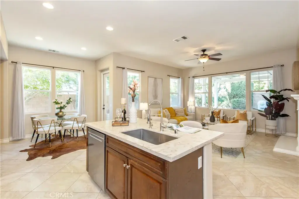 Upgraded hard-surface flooring with tasteful decorative details and neutral tones enhances the home’s upscale feel. The open kitchen is equipped with stainless steel appliances, ample cabinetry, a generous center island, and granite countertops, perfect for both daily use and entertaining.