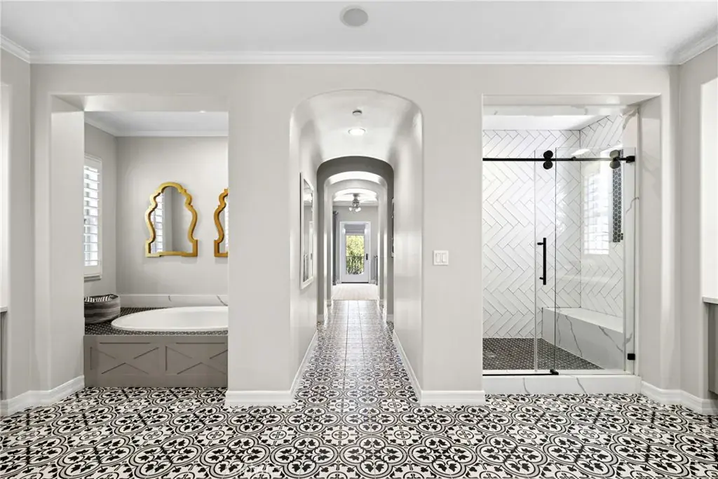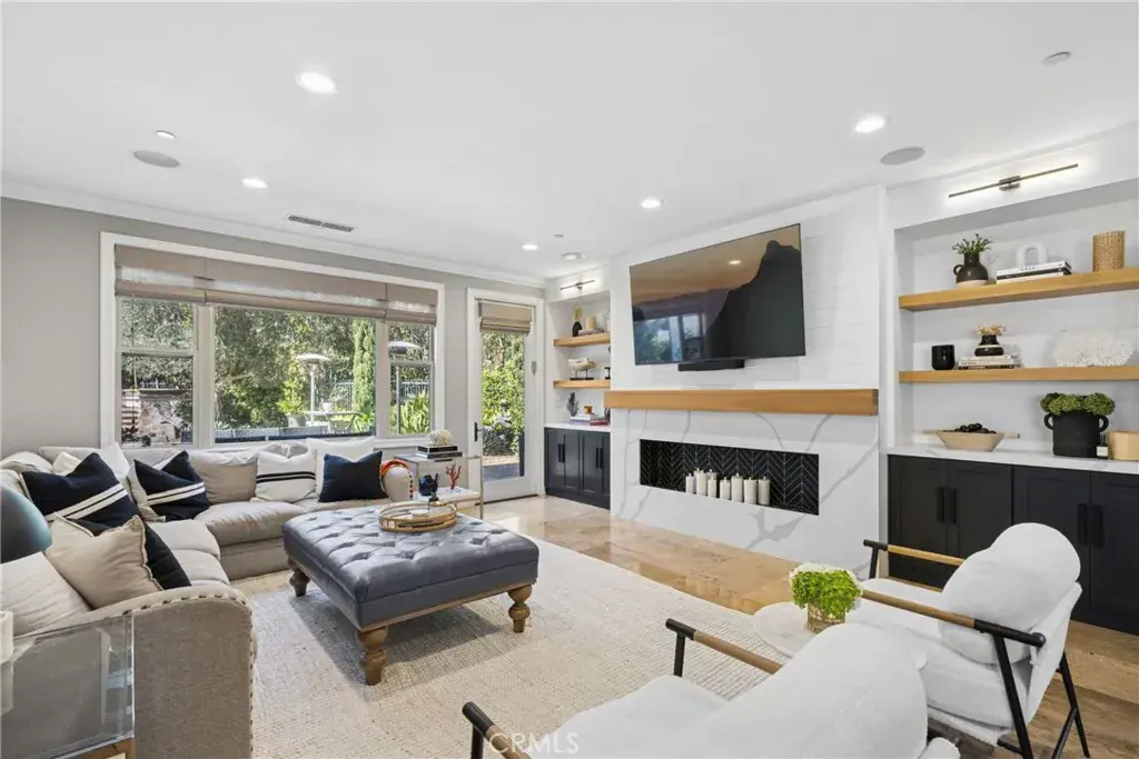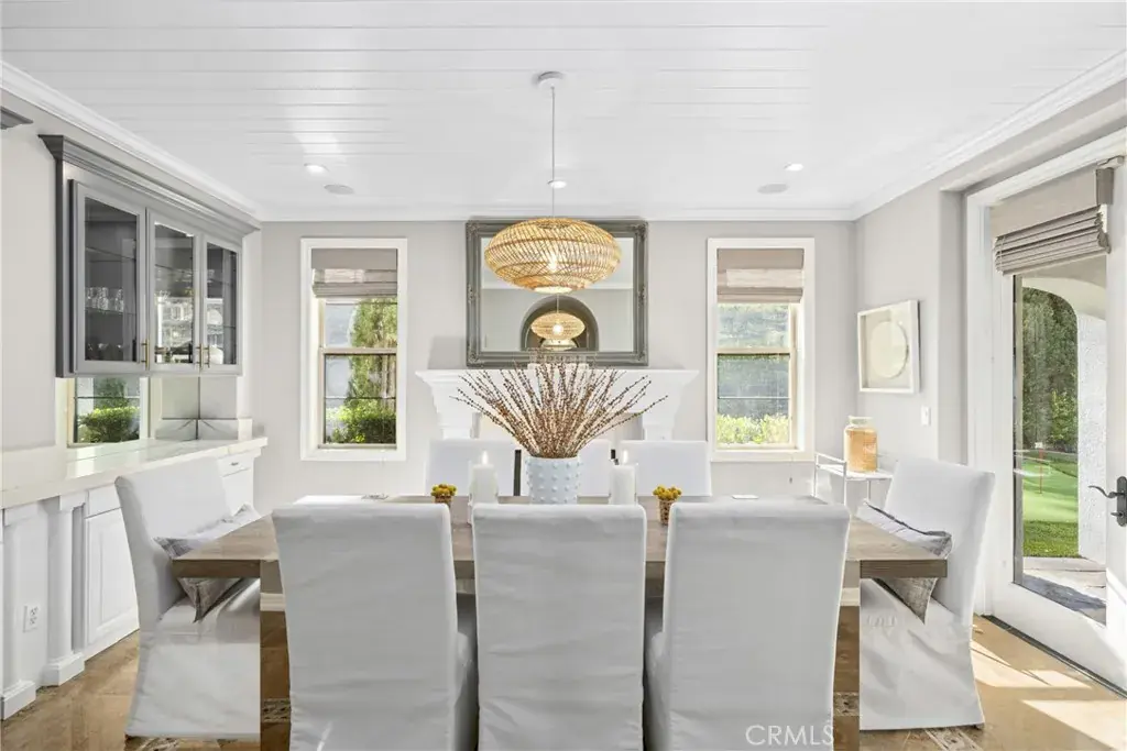 At the end of a cul-de-sac within the coveted gated enclave of Cameo Woods, this extraordinary estate commands one of the largest and most premium lots in the community, framed by lush hills and a serene canopy of trees. Designed for grand-scale entertaining and everyday luxury, the residence blends timeless architectural elements with refined, modern upgrades throughout. A welcoming central courtyard with a tranquil water fountain sets the tone for the home’s elegant and inviting ambiance. Inside, soaring ceilings, classic shutters, shiplap accents, and custom millwork create a cohesive aesthetic. Anchored by an expansive marble island and appointed with top-tier appliances, the kitchen includes an eight-burner range, double ovens, charming breakfast nook, and breakfast bar that flows seamlessly into the family room with its fireplace framed by custom built-ins. The living room features a statement fireplace and full bar with serving counter, wine refrigeration, sink, and direct backyard access, mirrored by the formal dining room with built-ins and outdoor connectivity. The home features four spacious ensuite bedrooms, complemented by multiple bonus spaces designed to adapt to evolving needs, including a private office, an upstairs family/TV room, a separate lounge or playroom, and, just outside the secondary bedrooms, a fully integrated homework and creative workstation with abundant storage. The primary suite showcases custom built-ins, a sitting area, two walk-in closets, and a spa-inspired bath with jetted tub, dual vanities, makeup station, and custom tile. An adjacent flex room is ideal for a private gym or retreat. Additional features include: a sprawling laundry room featuring extensive counters, sink, and storage; dual-zone HVAC; owned solar; integrated indoor and outdoor speakers; and a four-car garage, one separate bay thoughtfully designed to accommodate boat storage. A private oasis designed for year-round enjoyment includes a pool with beach entry, slide, and swim-up bar that doubles as a covered outdoor serving bar with built-in heaters, seating, television, and adjacent BBQ kitchen outfitted with dual refrigerators. A bocce ball court, putting green, multiple lounge areas, sun deck, outdoor fireplace with water feature, and curated landscape lighting create an unforgettable setting for entertaining from day to night. Moments from the scenic trails of Peter’s Canyon Regional Park, highly regarded schools, and premier shopping and dining.