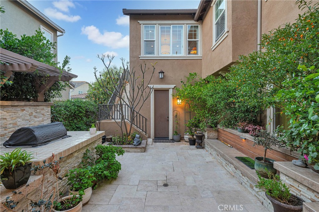 Step outside to a private, well-maintained backyard oasis designed for entertaining. This beautiful, low-maintenance courtyard features elegant stone tile hardscaping and is equipped for cookouts with a built-in barbecue island, stacked-stone detailing, and a custom wood pergola. Accentuated by fruit trees and tasteful landscaping, this serene space offers a sophisticated aesthetic without extensive upkeep.