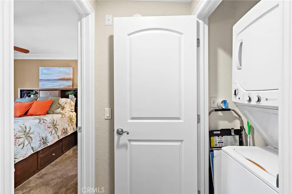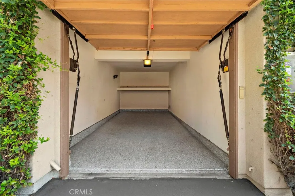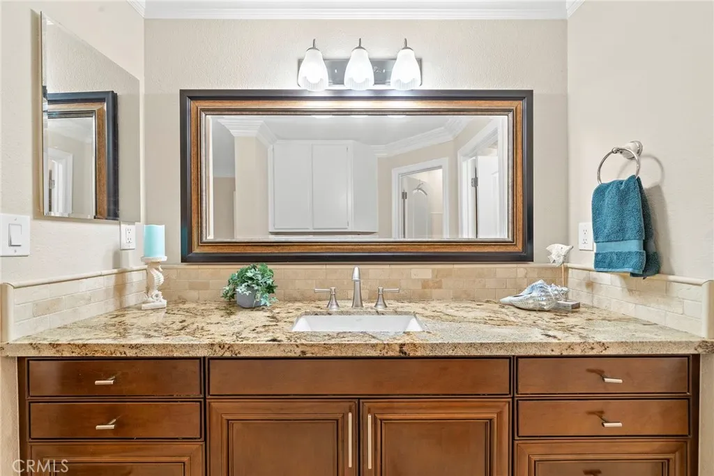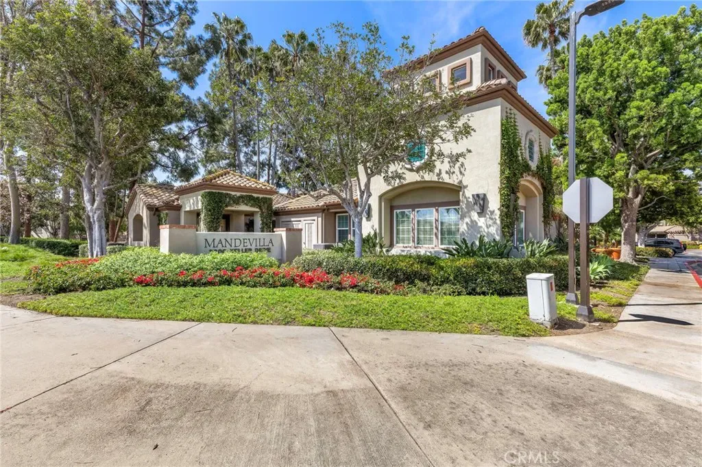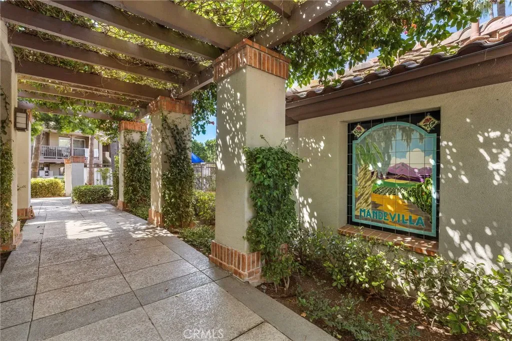 Absolutely Stunning Upper-Level Condo in a Quiet Interior Location within the Highly Sought-After Resort-Style Community of Mandevilla in Tustin Ranch! Enjoy a low HOA of just $275/month. This beautifully upgraded 1-bedroom, 1-bath home includes a single-car garage featuring newer epoxy flooring and an oversized private balcony with two convenient storage closets. Showcasing impeccable taste and high-end finishes throughout, this home offers an open and airy floorplan enhanced by crown molding, designer paint, smooth ceilings, ceiling fans, raised panel interior doors, custom window and door casements, and oversized baseboards. Additional upgrades include newer central HVAC system, hypoallergenic carpeting, and stylish wood-look vinyl flooring in the kitchen. The completely remodeled gourmet kitchen is a true highlight, featuring granite countertops, a glass mosaic tile backsplash, custom dark wood cabinetry, stainless steel appliances (including microwave, dishwasher, and refrigerator), a coffered ceiling, recessed lighting, a stainless sink, and a breakfast bar with elegant pendant lighting. The spacious living room opens to the balcony, creating a seamless indoor-outdoor flow, while the full-size dining area connects perfectly to both the living room and kitchen—ideal for entertaining. There is also an inside laundry closet with a newer stackable washer and dryer for added convenience. The generous primary suite offers direct balcony access, a walk-in closet, and a beautifully updated bathroom with an extended granite vanity and a tiled tub/shower combo with a glass enclosure.