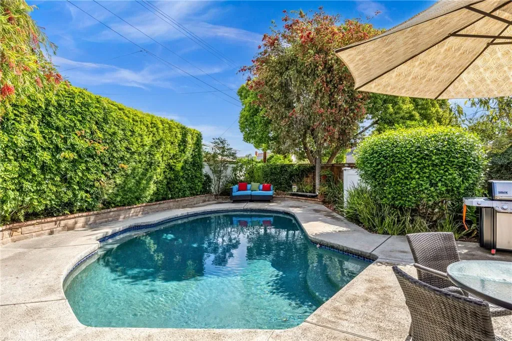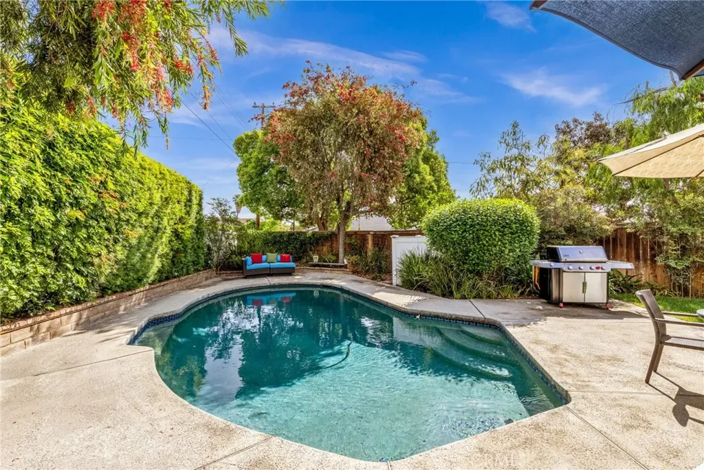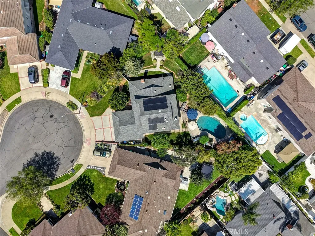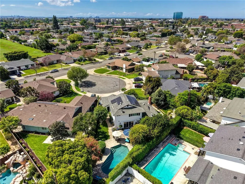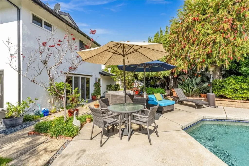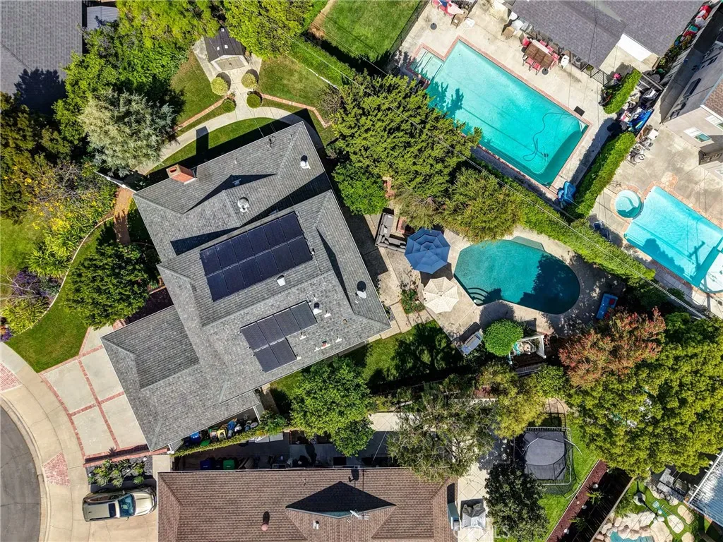 Resort-style living on a rare pie-shaped lot in a prime Tustin location, this beautifully upgraded home offers a thoughtfully designed interior and exceptional indoor-outdoor living. As you enter the home, you are welcomed into a spacious formal dining room featuring a custom fireplace and a large wine refrigerator, creating a warm and inviting setting for gatherings. The layout flows seamlessly into the fully remodeled kitchen. The updated kitchen is the heart of the home, featuring quartz countertops, a huge center island with a gorgeous granite top, soft-close cabinetry, double ovens, a Dacor 6-burner range, and a walk-in pantry, perfect for both everyday living and entertaining. A sunny breakfast nook sits just off the kitchen and opens to the spacious family/living room, creating a true great room feel, complete with a second fireplace and abundant natural light. The spacious primary suite is conveniently located on the main level, offering a private retreat with a beautifully updated bath with dual sinks. Upstairs offers three additional bedrooms and a full bath with dual sinks, providing flexibility for family, guests, or a home office. Step outside to an incredible, resort-style backyard designed for both relaxation and entertaining. Set on a rare pie-shaped lot, this private outdoor space features a large swimming pool, expansive grassy area, and multiple seating areas creating the perfect setting for gatherings or quiet evenings at home. Extensive upgrades throughout the home include travertine flooring, crown molding, plantation shutters, recessed lighting, new windows, ceiling fans, soft-close cabinetry, an inside laundry area conveniently tucked behind doors, a LifeSource Water System, and PEX piping. Energy efficiency is enhanced with solar, helping to keep utility costs down. Ideally located close to schools, shopping, and convenient commuting options, this home offers the best of comfort, style, and location.