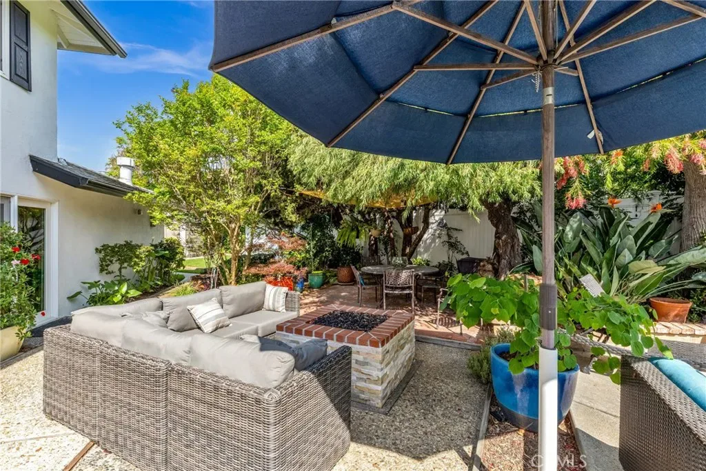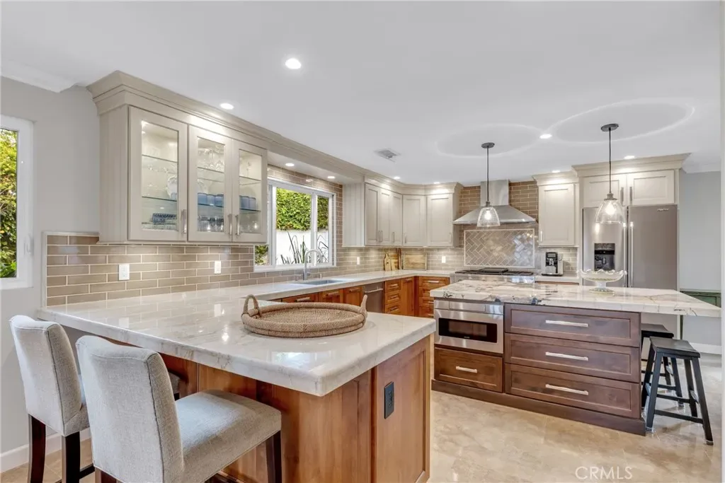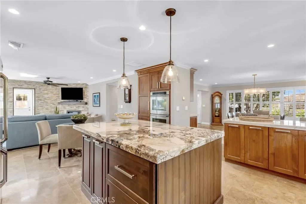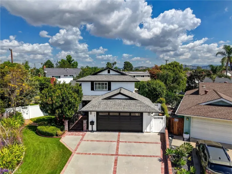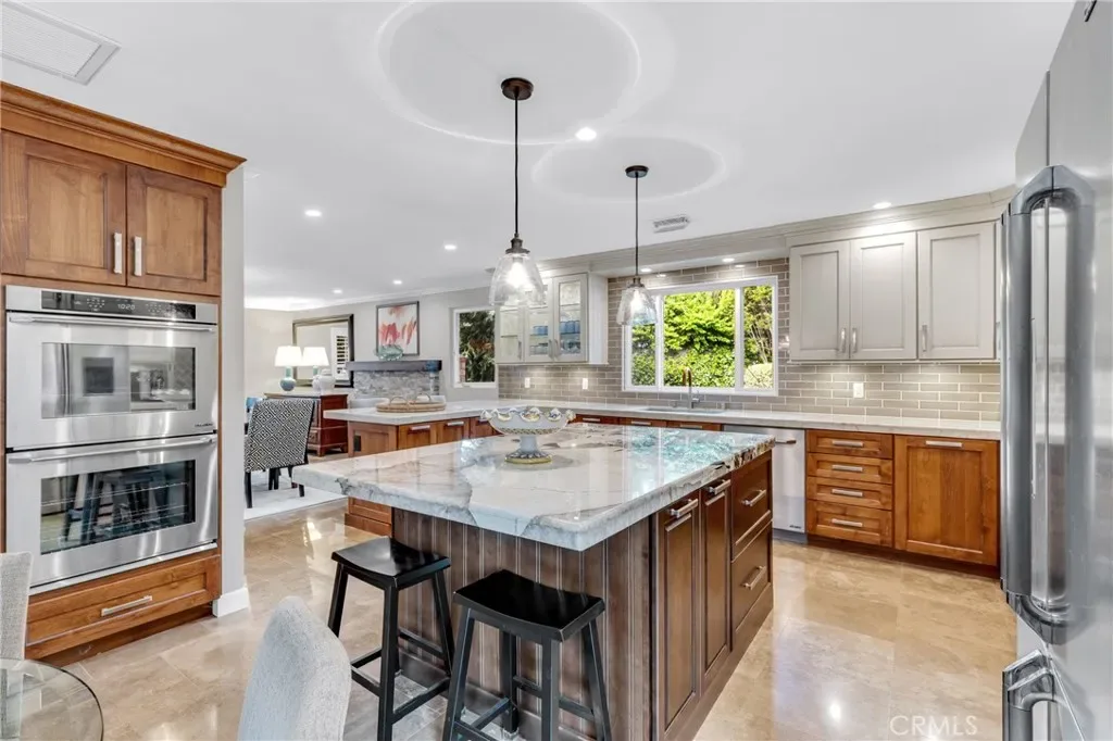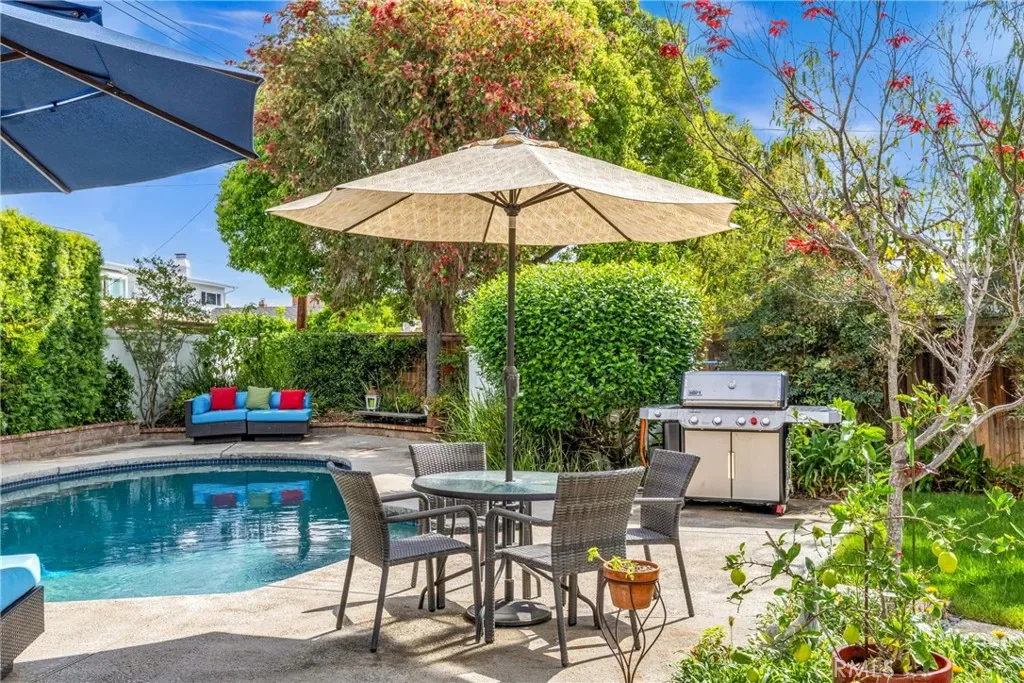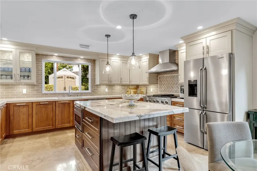 Resort-style living on a rare pie-shaped lot in a prime Tustin location, this beautifully upgraded home offers a thoughtfully designed interior and exceptional indoor-outdoor living. As you enter the home, you are welcomed into a spacious formal dining room featuring a custom fireplace and a large wine refrigerator, creating a warm and inviting setting for gatherings. The layout flows seamlessly into the fully remodeled kitchen. The updated kitchen is the heart of the home, featuring quartz countertops, a huge center island with a gorgeous granite top, soft-close cabinetry, double ovens, a Dacor 6-burner range, and a walk-in pantry, perfect for both everyday living and entertaining. A sunny breakfast nook sits just off the kitchen and opens to the spacious family/living room, creating a true great room feel, complete with a second fireplace and abundant natural light. The spacious primary suite is conveniently located on the main level, offering a private retreat with a beautifully updated bath with dual sinks. Upstairs offers three additional bedrooms and a full bath with dual sinks, providing flexibility for family, guests, or a home office. Step outside to an incredible, resort-style backyard designed for both relaxation and entertaining. Set on a rare pie-shaped lot, this private outdoor space features a large swimming pool, expansive grassy area, and multiple seating areas creating the perfect setting for gatherings or quiet evenings at home. Extensive upgrades throughout the home include travertine flooring, crown molding, plantation shutters, recessed lighting, new windows, ceiling fans, soft-close cabinetry, an inside laundry area conveniently tucked behind doors, a LifeSource Water System, and PEX piping. Energy efficiency is enhanced with solar, helping to keep utility costs down. Ideally located close to schools, shopping, and convenient commuting options, this home offers the best of comfort, style, and location.
