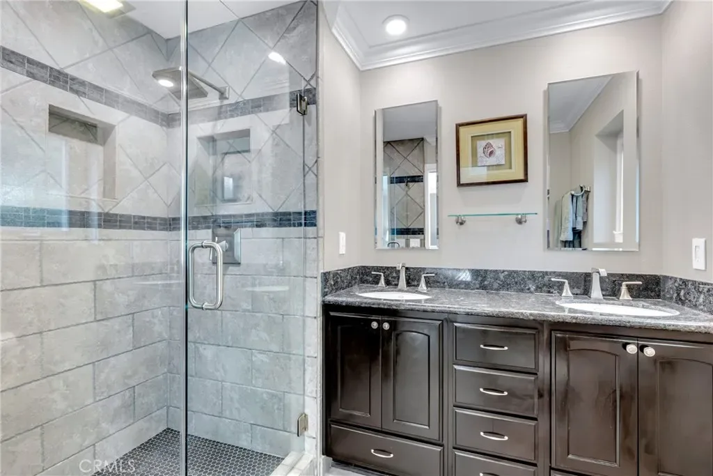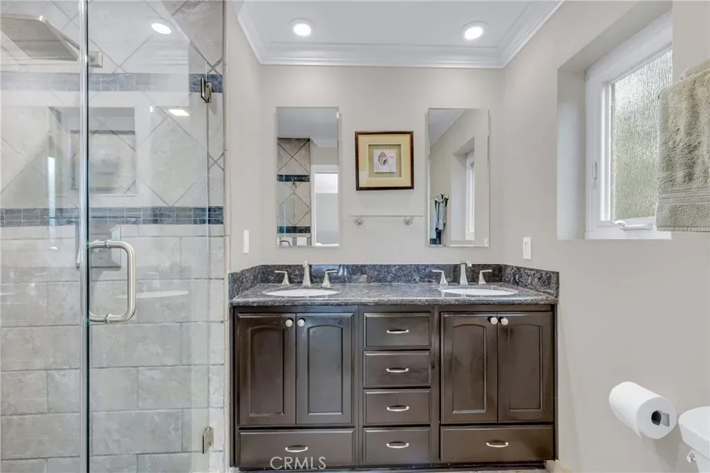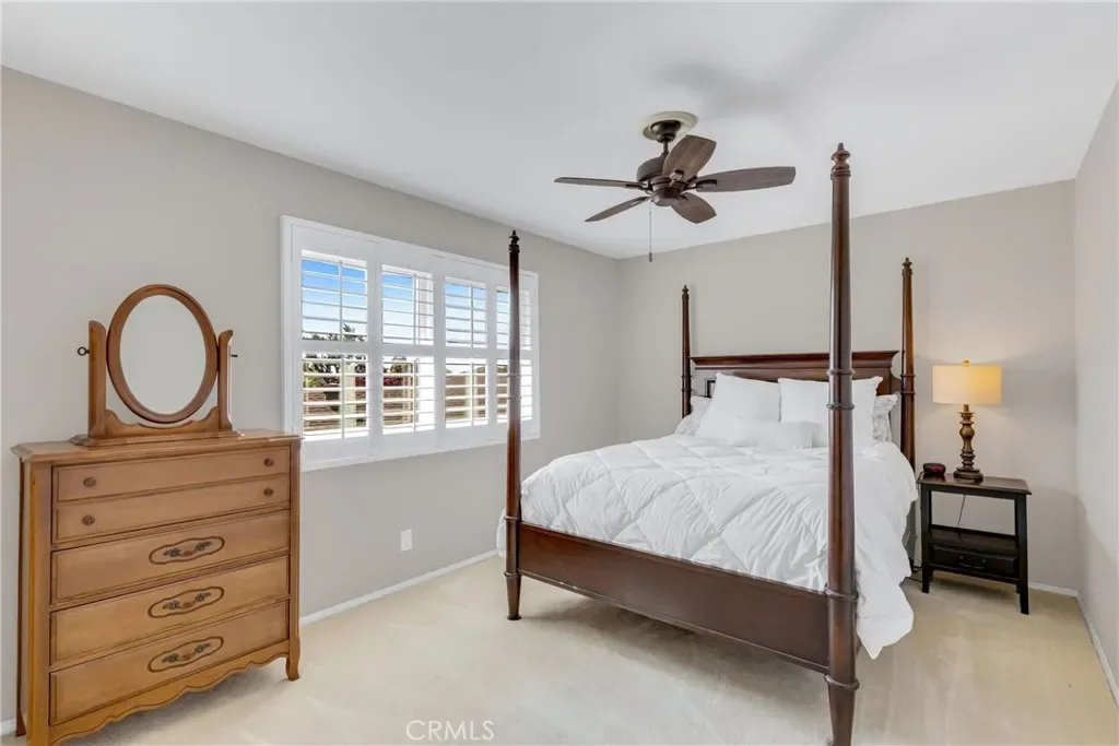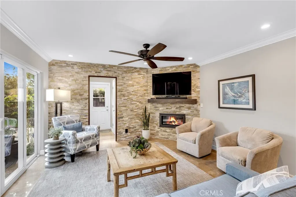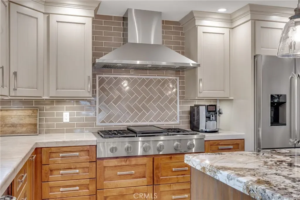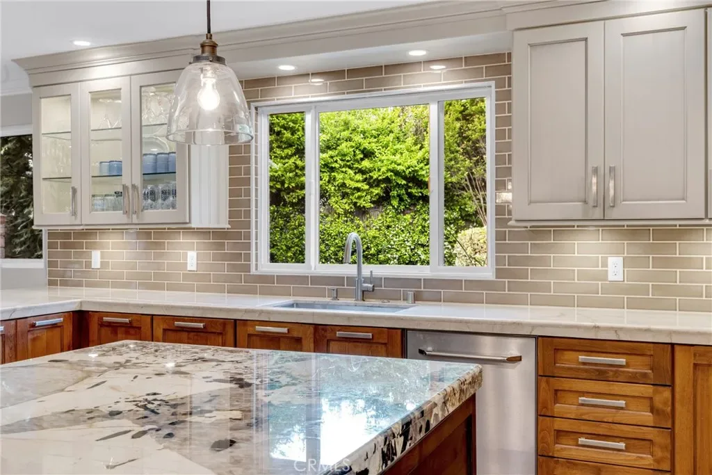 Resort-style living on a rare pie-shaped lot in a prime Tustin location, this beautifully upgraded home offers a thoughtfully designed interior and exceptional indoor-outdoor living. As you enter the home, you are welcomed into a spacious formal dining room featuring a custom fireplace and a large wine refrigerator, creating a warm and inviting setting for gatherings. The layout flows seamlessly into the fully remodeled kitchen. The updated kitchen is the heart of the home, featuring quartz countertops, a huge center island with a gorgeous granite top, soft-close cabinetry, double ovens, a Dacor 6-burner range, and a walk-in pantry, perfect for both everyday living and entertaining. A sunny breakfast nook sits just off the kitchen and opens to the spacious family/living room, creating a true great room feel, complete with a second fireplace and abundant natural light. The spacious primary suite is conveniently located on the main level, offering a private retreat with a beautifully updated bath with dual sinks. Upstairs offers three additional bedrooms and a full bath with dual sinks, providing flexibility for family, guests, or a home office. Step outside to an incredible, resort-style backyard designed for both relaxation and entertaining. Set on a rare pie-shaped lot, this private outdoor space features a large swimming pool, expansive grassy area, and multiple seating areas creating the perfect setting for gatherings or quiet evenings at home. Extensive upgrades throughout the home include travertine flooring, crown molding, plantation shutters, recessed lighting, new windows, ceiling fans, soft-close cabinetry, an inside laundry area conveniently tucked behind doors, a LifeSource Water System, and PEX piping. Energy efficiency is enhanced with solar, helping to keep utility costs down. Ideally located close to schools, shopping, and convenient commuting options, this home offers the best of comfort, style, and location.